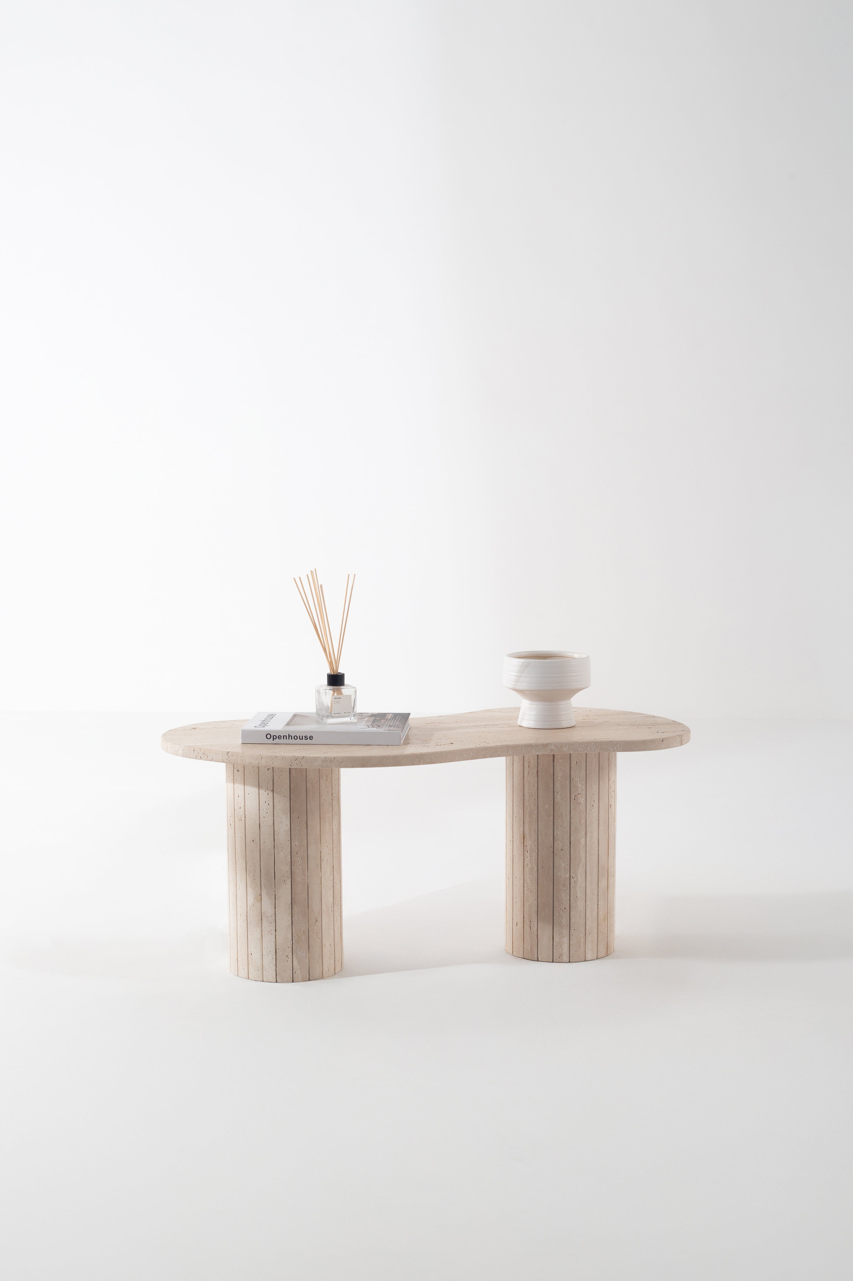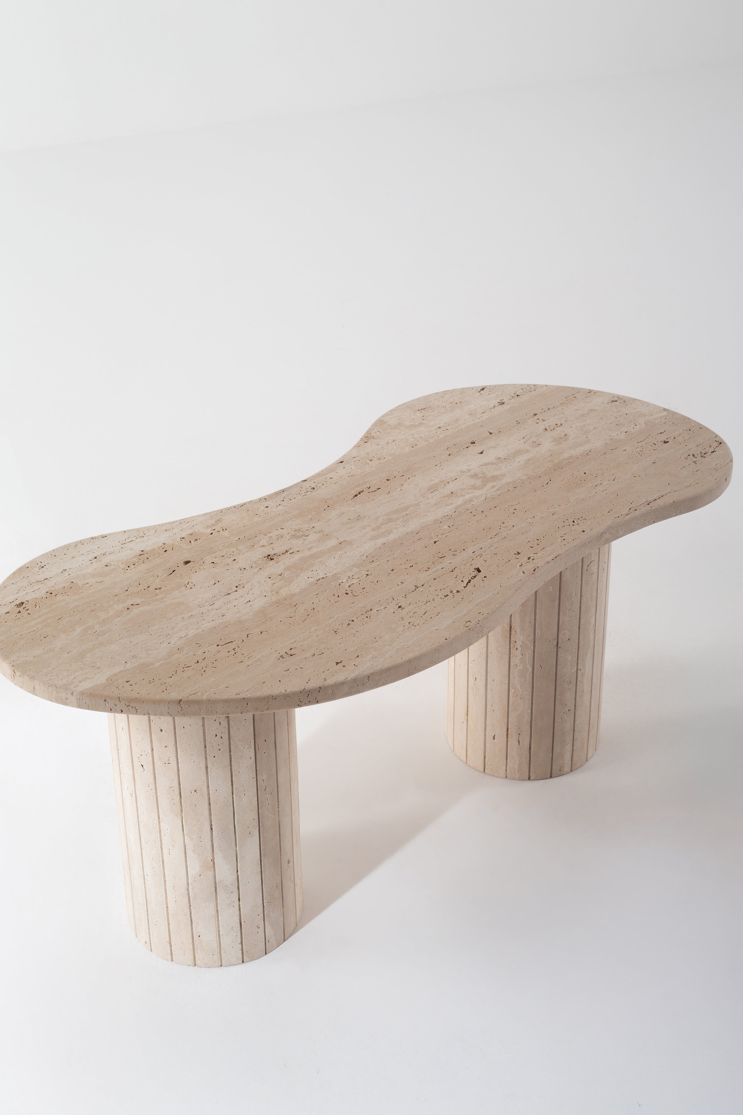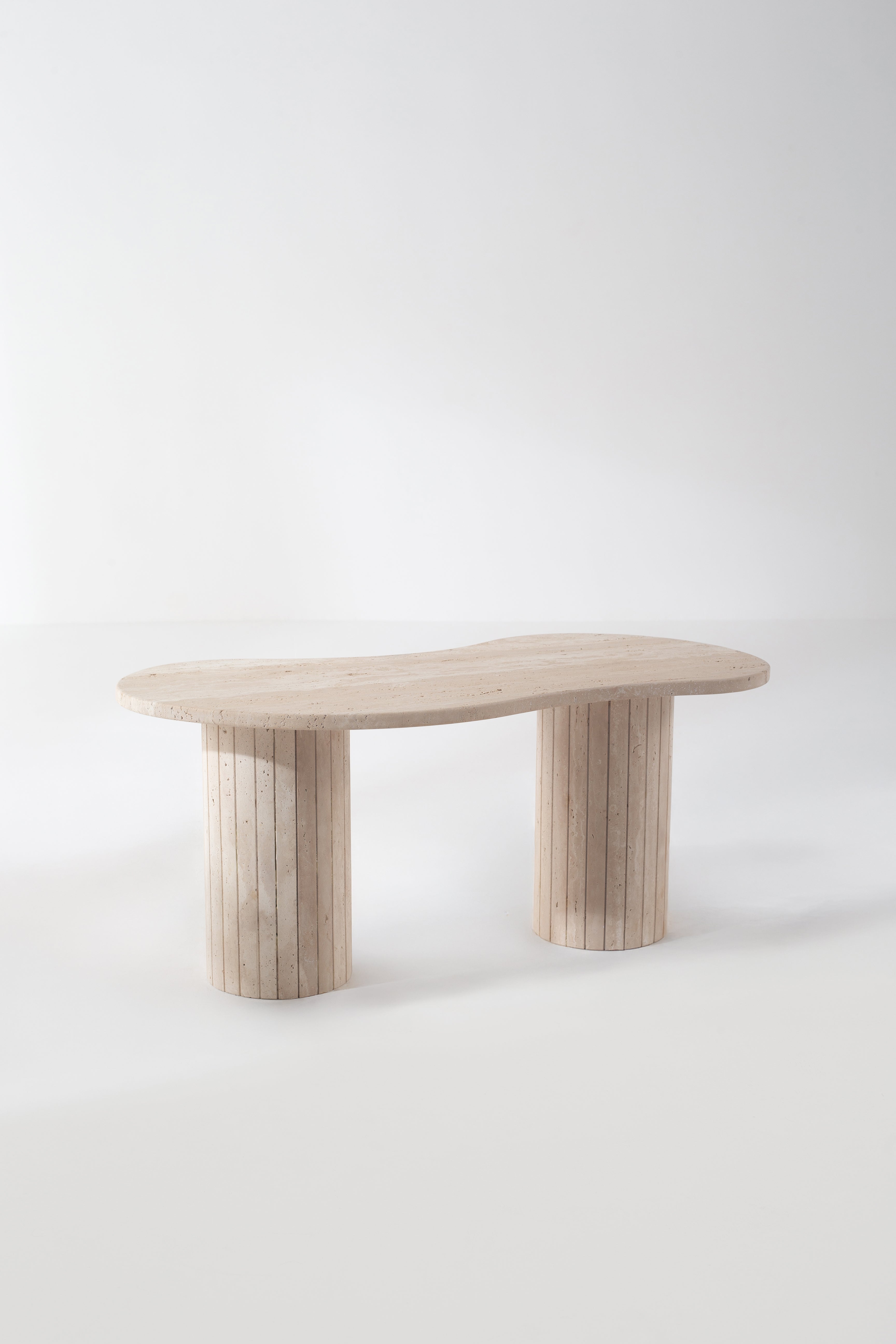 A sculptural statement in beige travertine, this coffee table transforms your space with organic curves and fluted cylindrical legs. The smooth, natural stone top showcases soft earthy veins, while the striped base adds architectural depth. Designed to stand out, it blends raw textures with refined elegance, making it the perfect centerpiece for modern interiors.