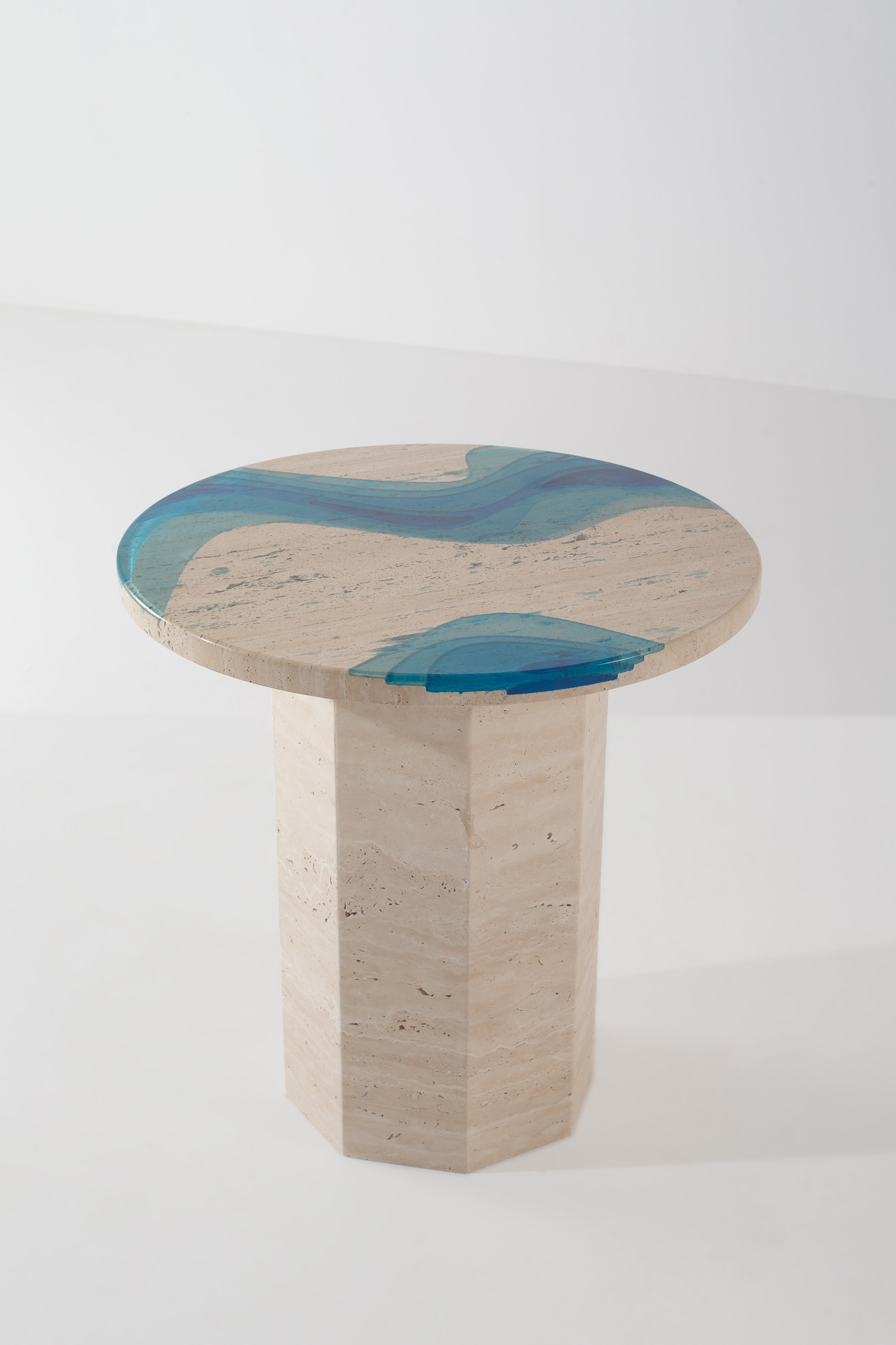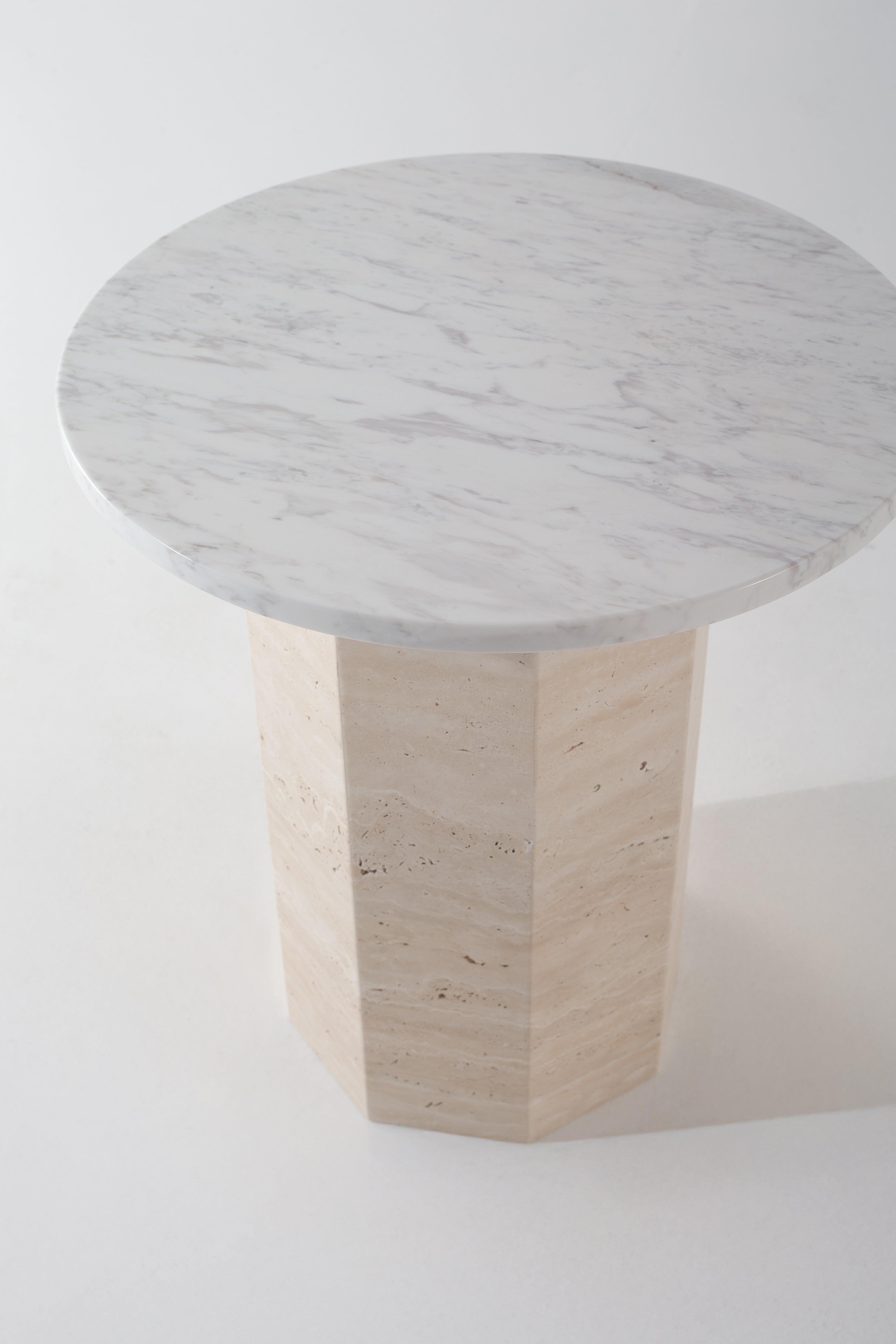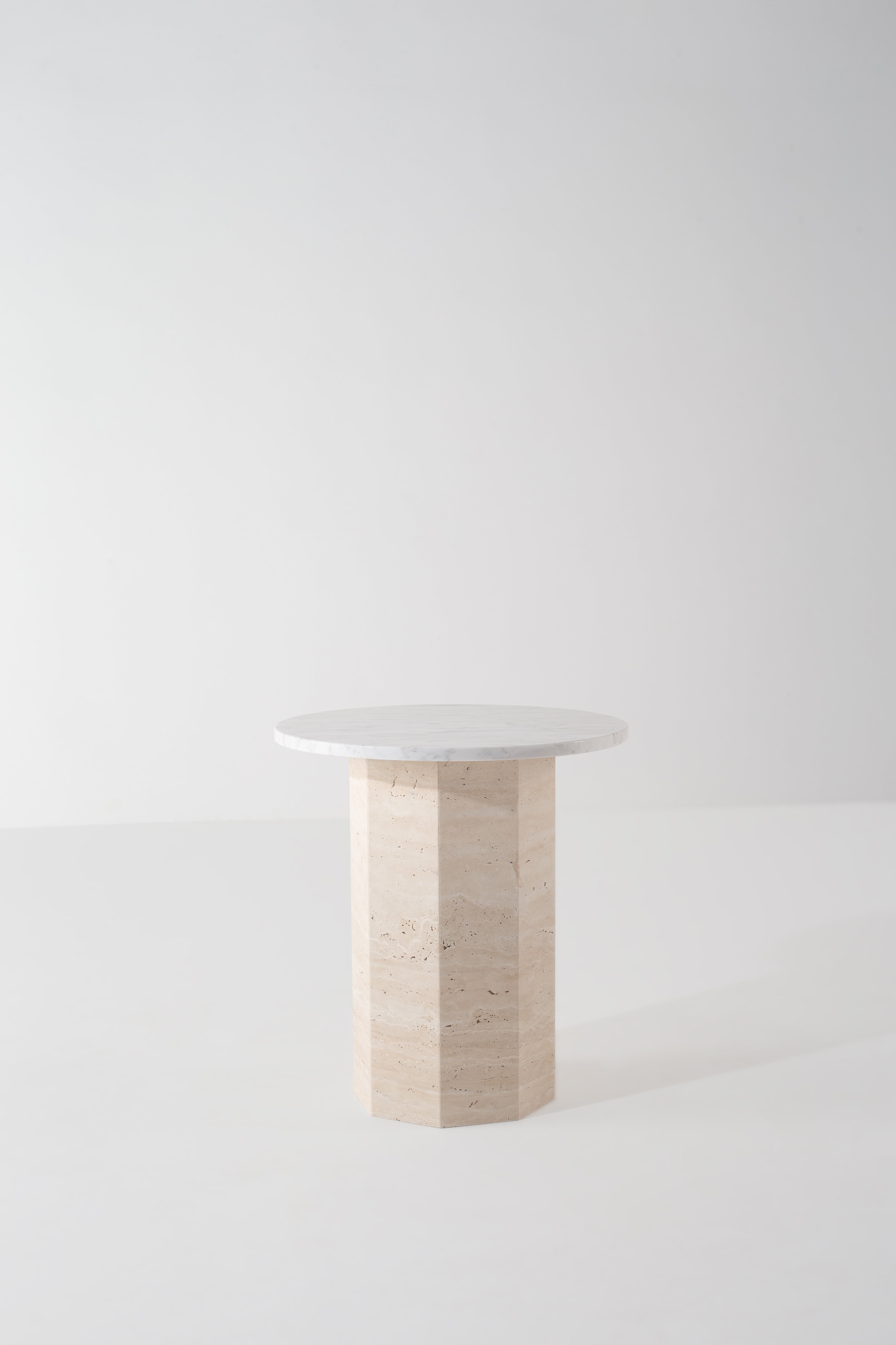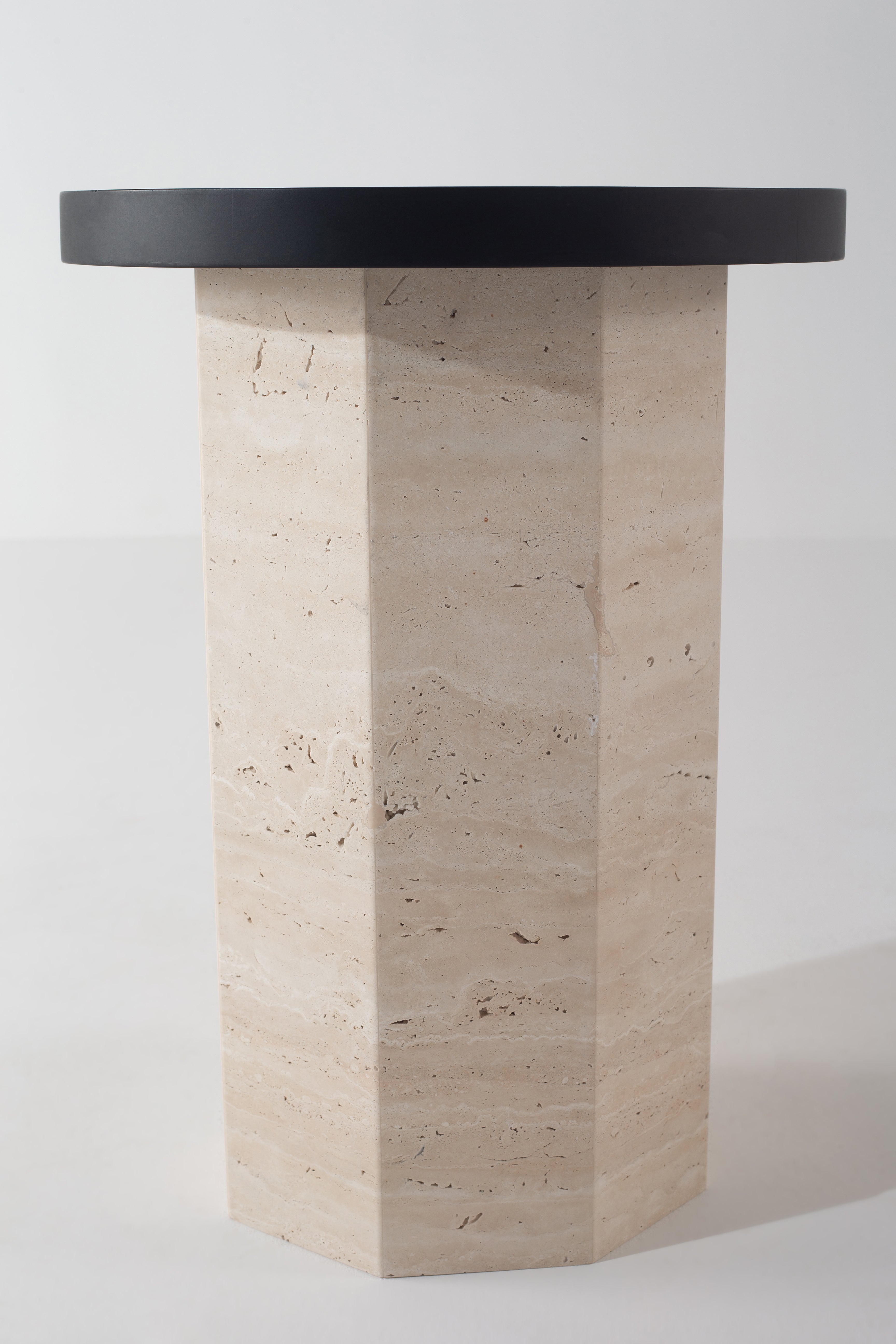 A sculptural masterpiece of travertine, this side table stands on a bold hexagonal base, exuding timeless charm. The natural stone texture adds depth, while the variety of tabletop options—ranging from sleek black to richly veined marble—allows you to personalize your space. Whether placed beside a sofa or as a statement piece, its structured form and earthy tones bring an organic touch to modern interiors.