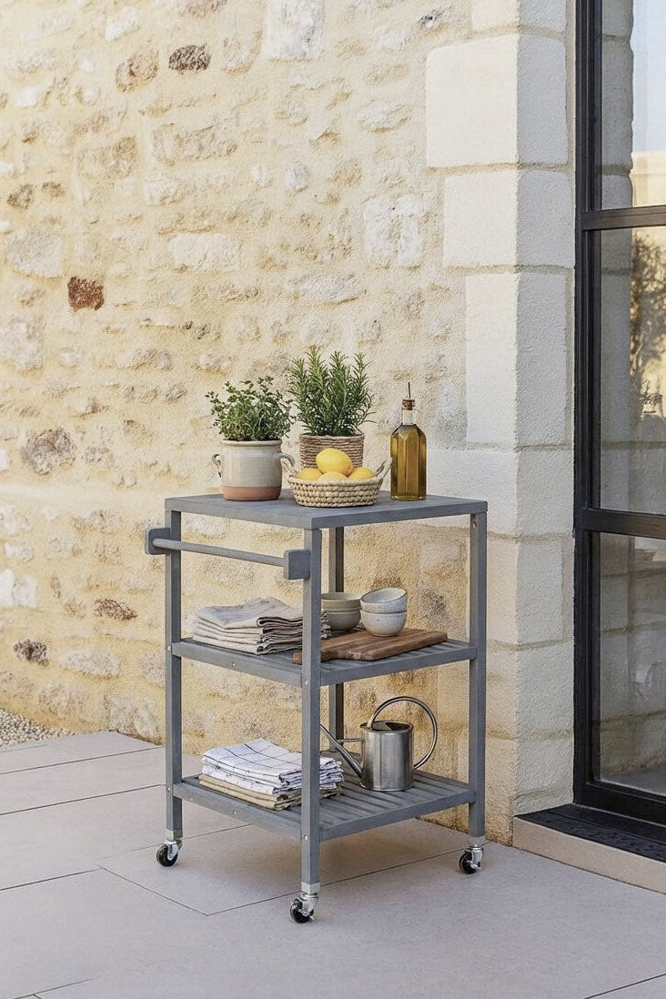 Step into modern elegance with this kitchen trolley in Dusk Grey, where your hosting moments become effortlessly stylish. The smooth rectangular top, paired with two slatted open shelves, offers ample space to store, serve, or organize essentials. Its sleek grey finish enhances the textured wood grain, while sturdy caster wheels glide smoothly, making it your go-to companion for kitchen prep, dining, or entertaining. Designed for you, it blends functionality with a refined contemporary look.