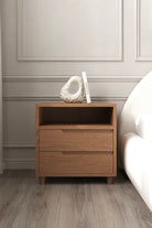 Enhance your bedroom with a bedside table that combines modern simplicity and practical storage. Crafted from natural wood with a light finish, it features two spacious drawers with sleek cut-out handles and an open shelf for easy access to books or essentials. Rounded legs add a touch of softness to its clean silhouette, making it versatile enough for contemporary, Scandinavian, or minimalist interiors. Durable, functional, and stylish, it’s the perfect companion for your restful space.