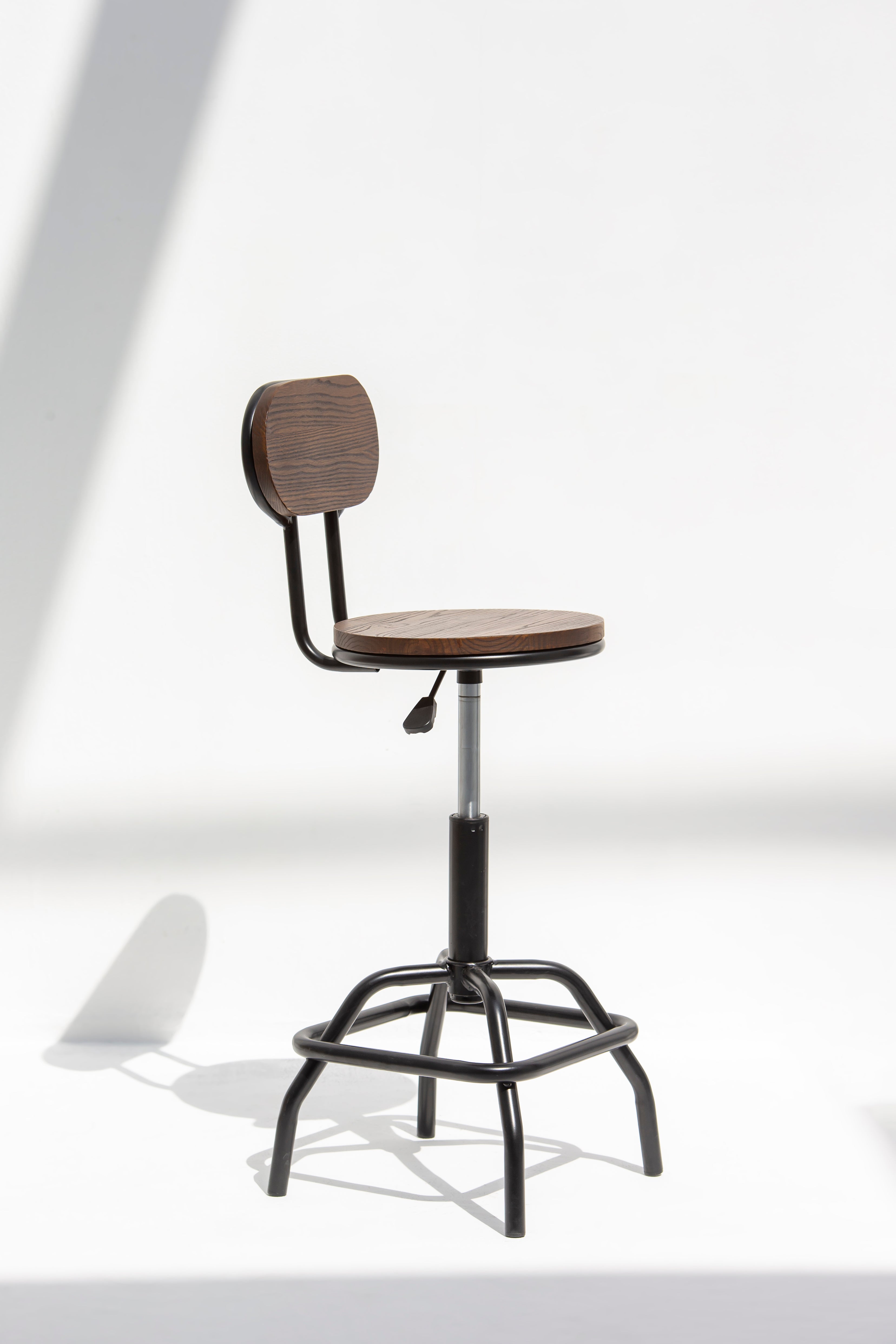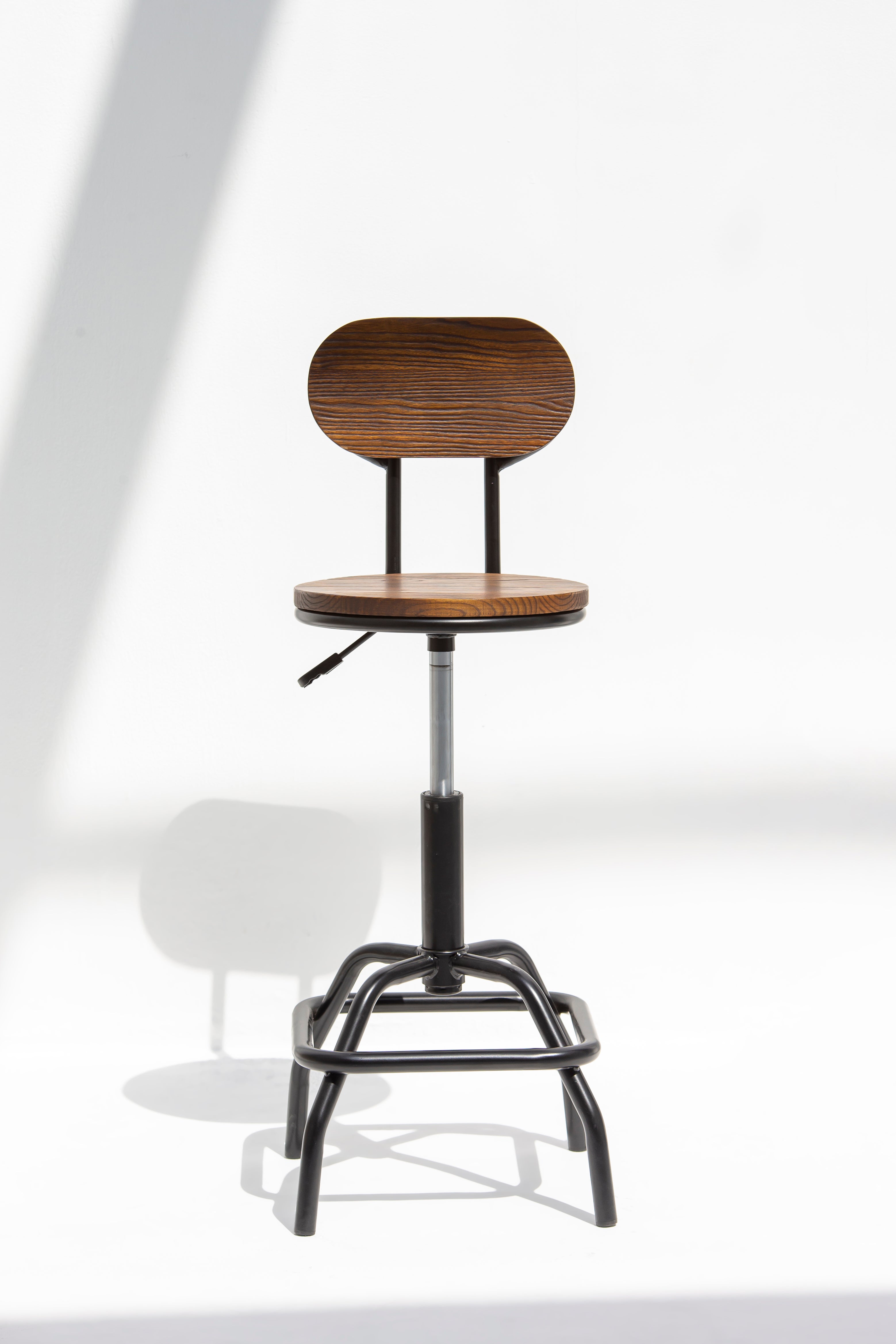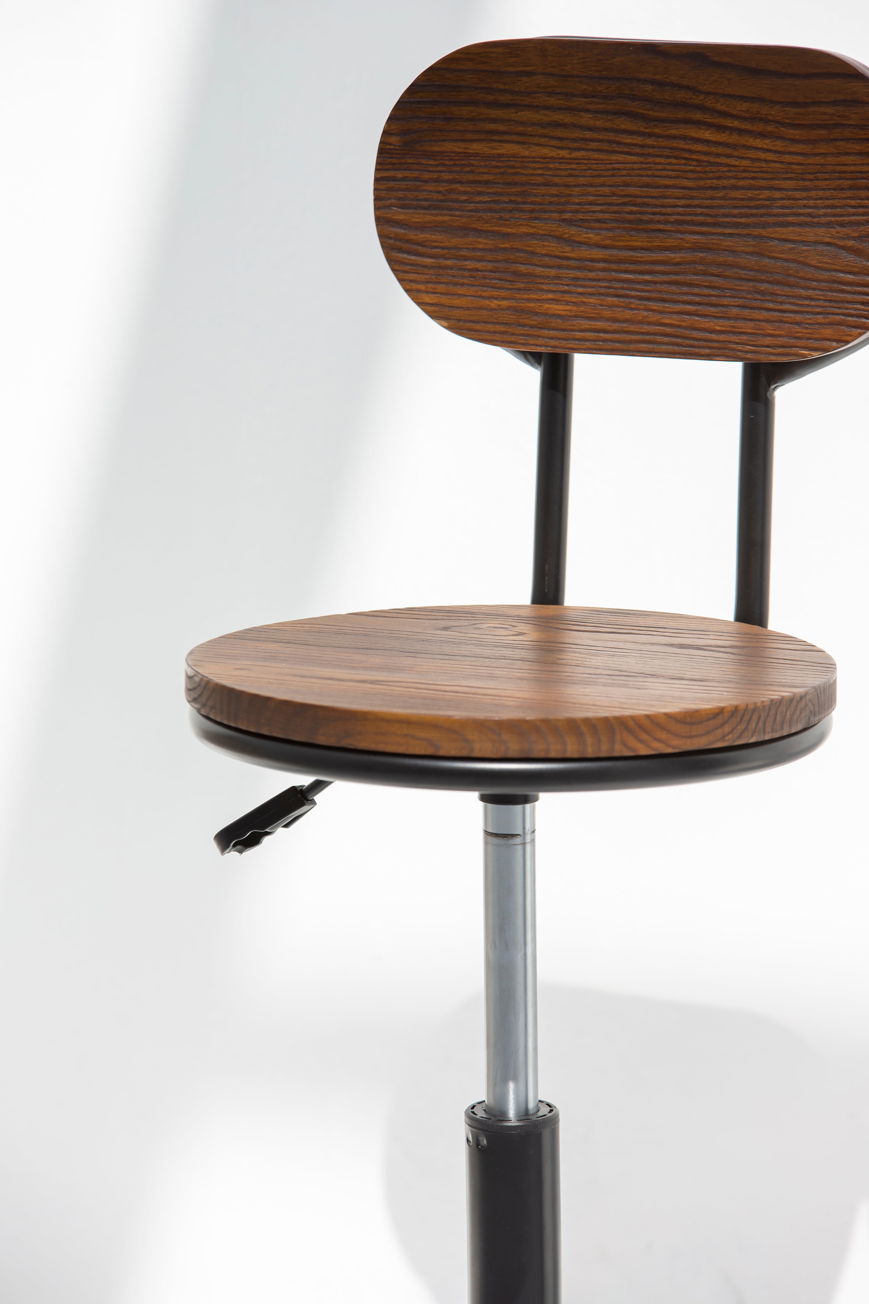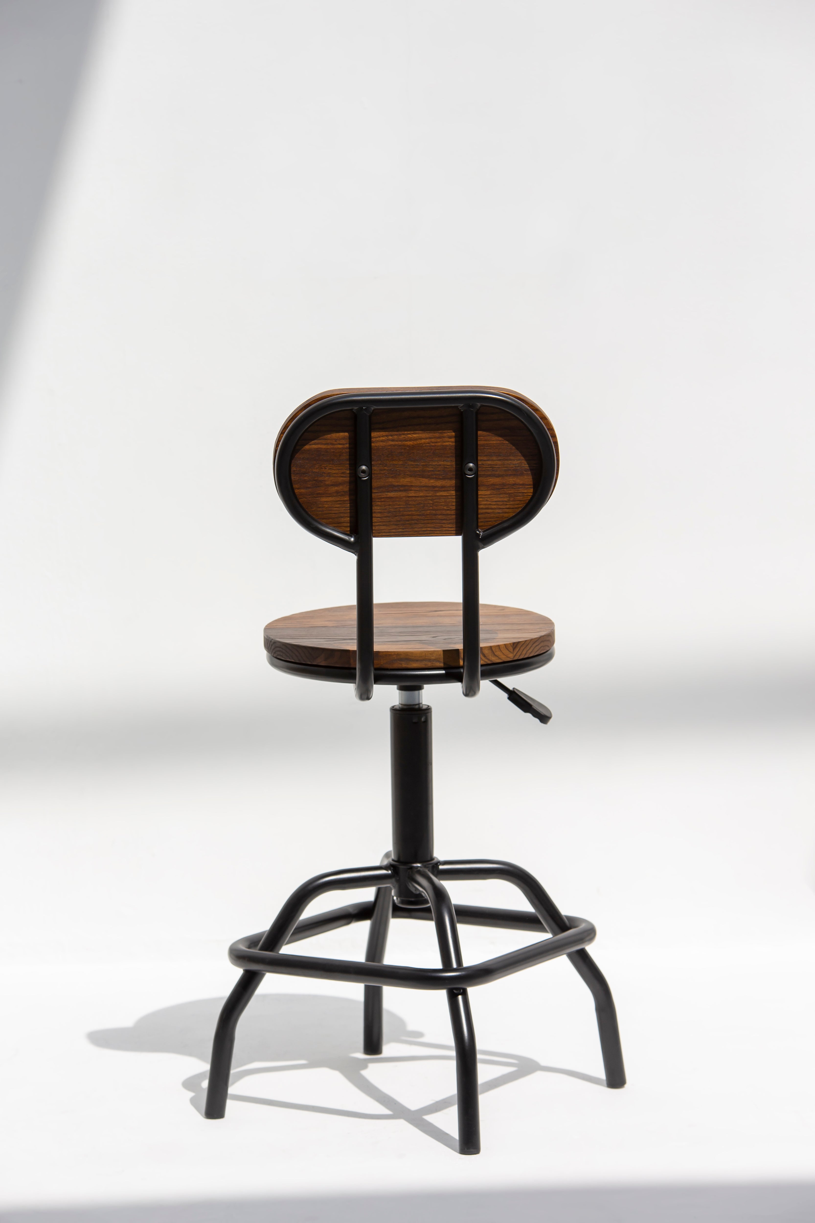 This counter stool offers a perfect blend of functionality and industrial charm, featuring a dark wooden seat and backrest paired with a sturdy black metal frame. Its sleek, round seat swivels effortlessly, providing convenience and versatility for kitchen counters or bar setups. The ergonomic design ensures comfort, while the rich wood grain texture adds a touch of sophistication. Ideal for modern, industrial, or rustic interiors, making it a standout addition to your space.