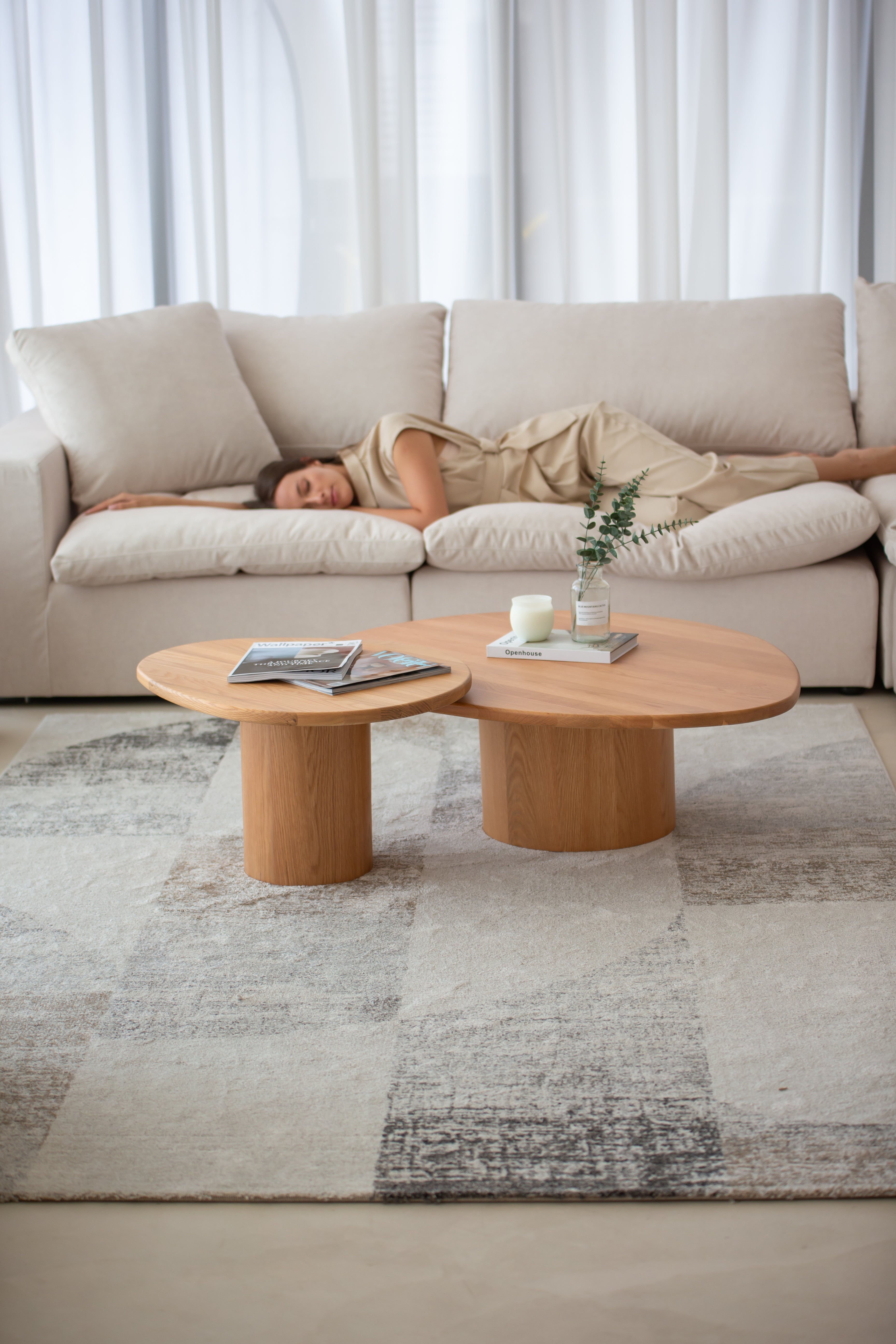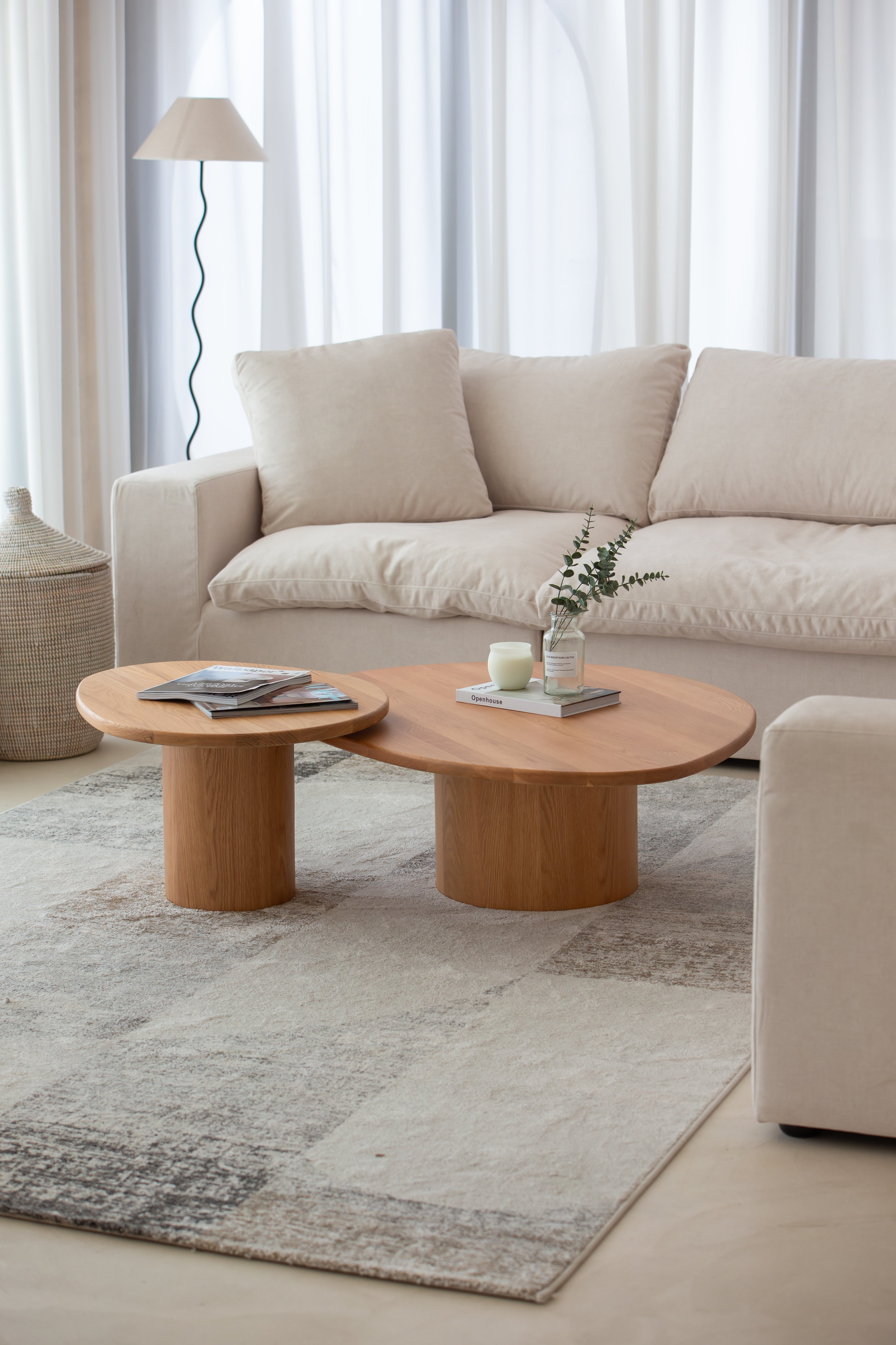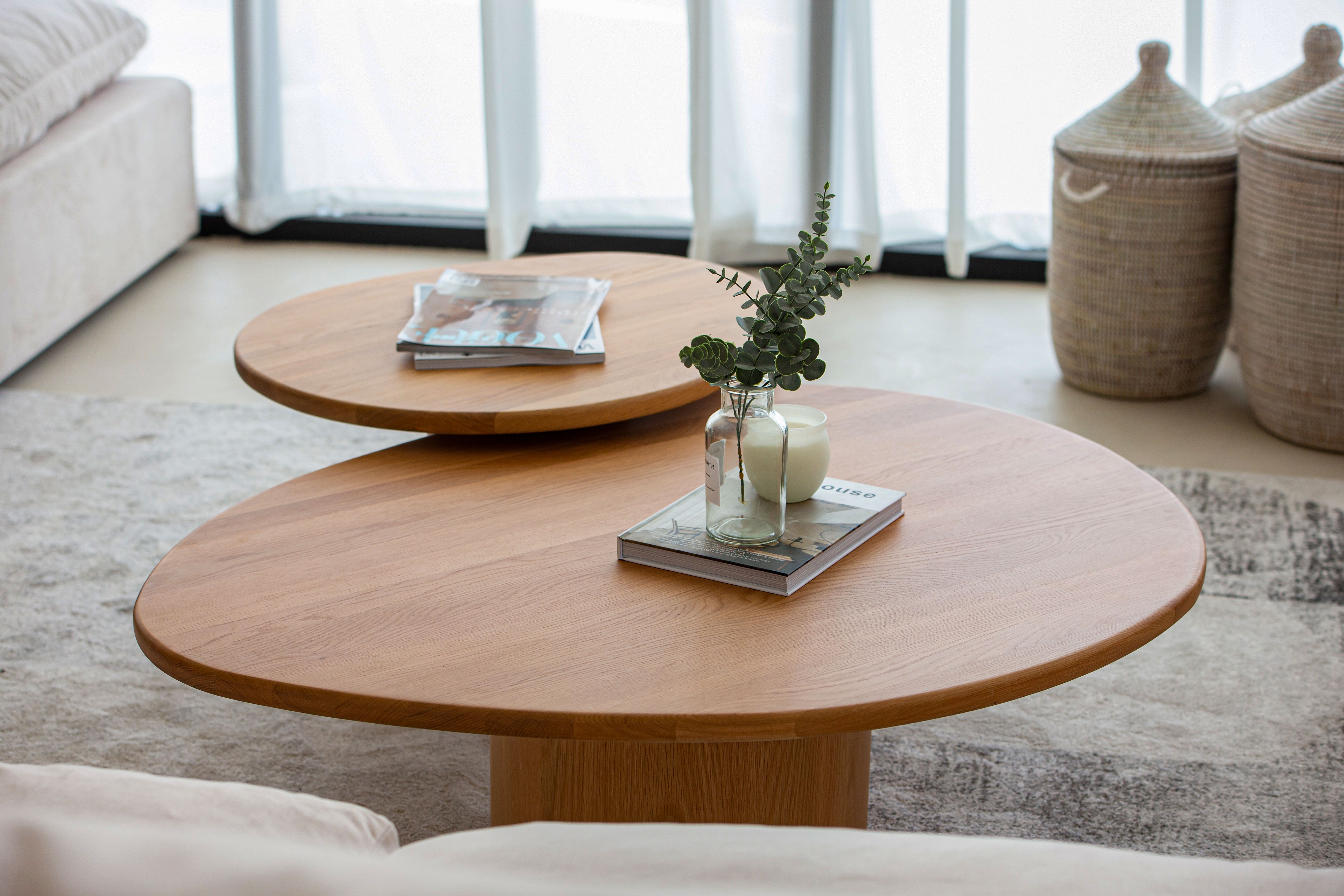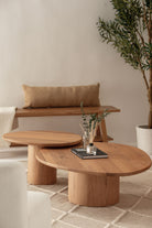 Crafted from solid oak, this nesting coffee table set brings both style and versatility to your living space. With organic, pebble-shaped tabletops resting on sturdy cylindrical bases, the design merges contemporary minimalism with natural beauty. The warm wood grain texture enhances its aesthetic appeal, while the space-saving design allows you to arrange or tuck away the tables as needed. Whether used together or separately, this wooden nesting coffee table set offers a seamless blend of functionality and sophistication, making it the perfect centerpiece for modern interiors.