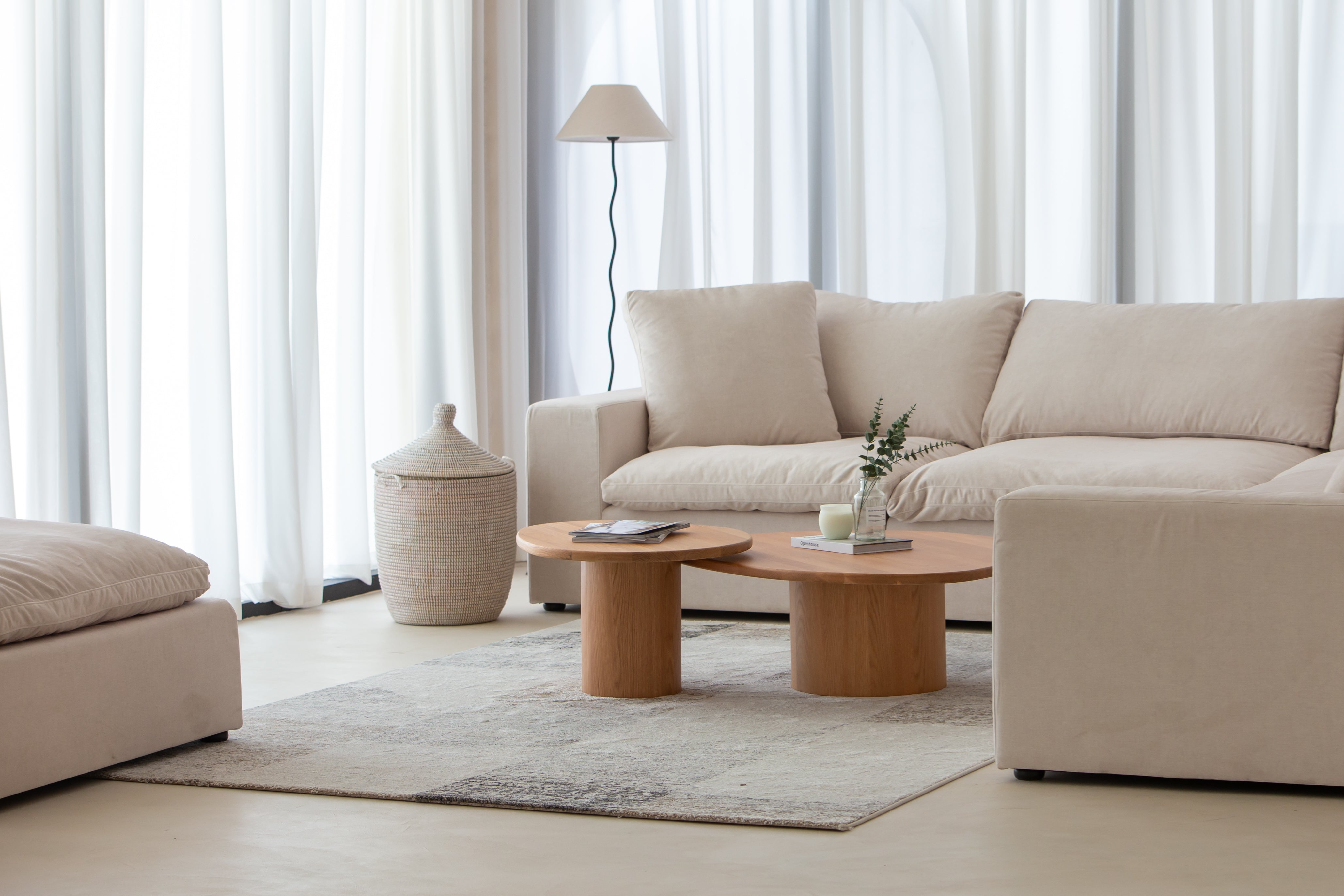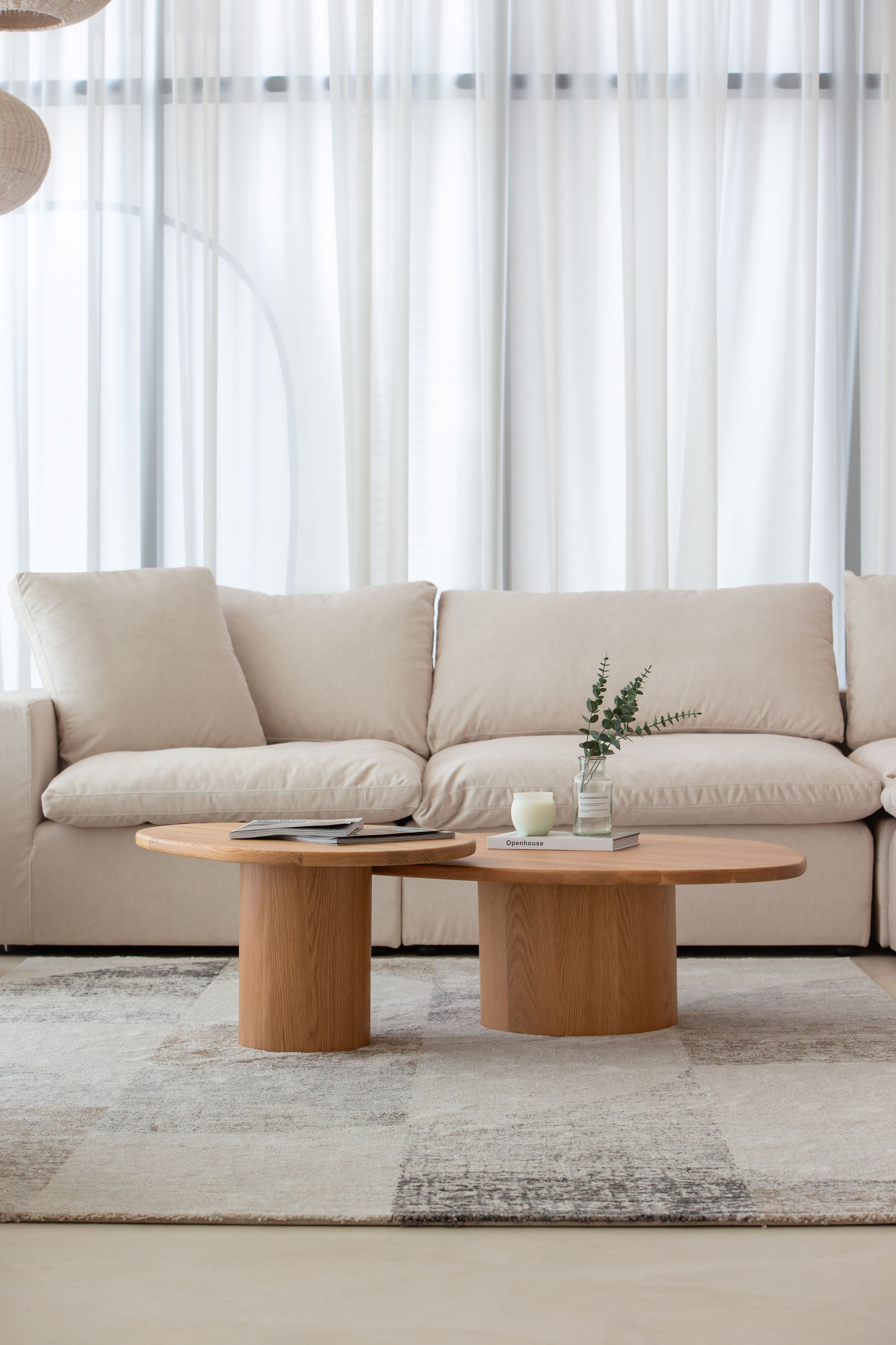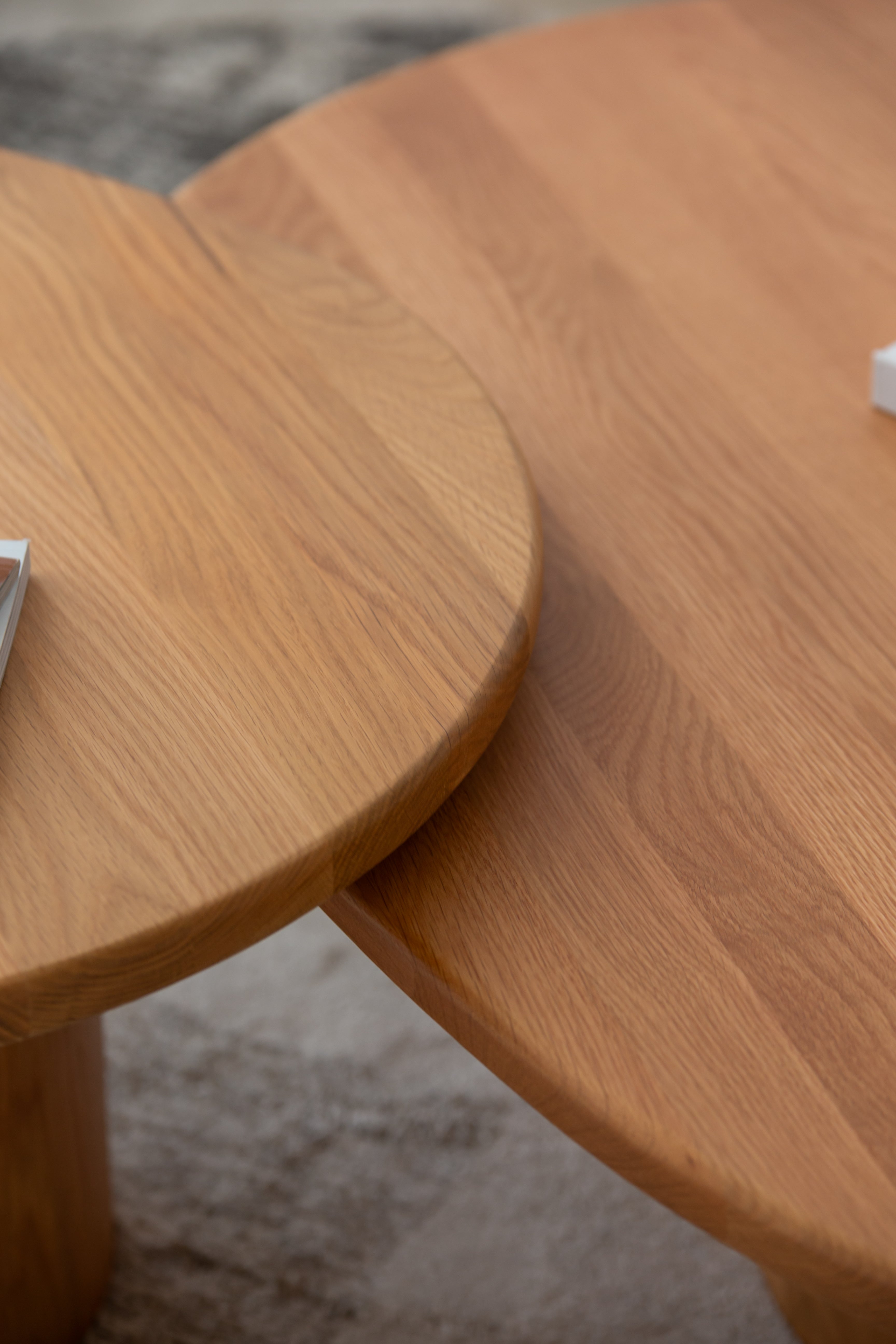 Crafted from solid oak, this nesting coffee table set brings both style and versatility to your living space. With organic, pebble-shaped tabletops resting on sturdy cylindrical bases, the design merges contemporary minimalism with natural beauty. The warm wood grain texture enhances its aesthetic appeal, while the space-saving design allows you to arrange or tuck away the tables as needed. Whether used together or separately, this wooden nesting coffee table set offers a seamless blend of functionality and sophistication, making it the perfect centerpiece for modern interiors.