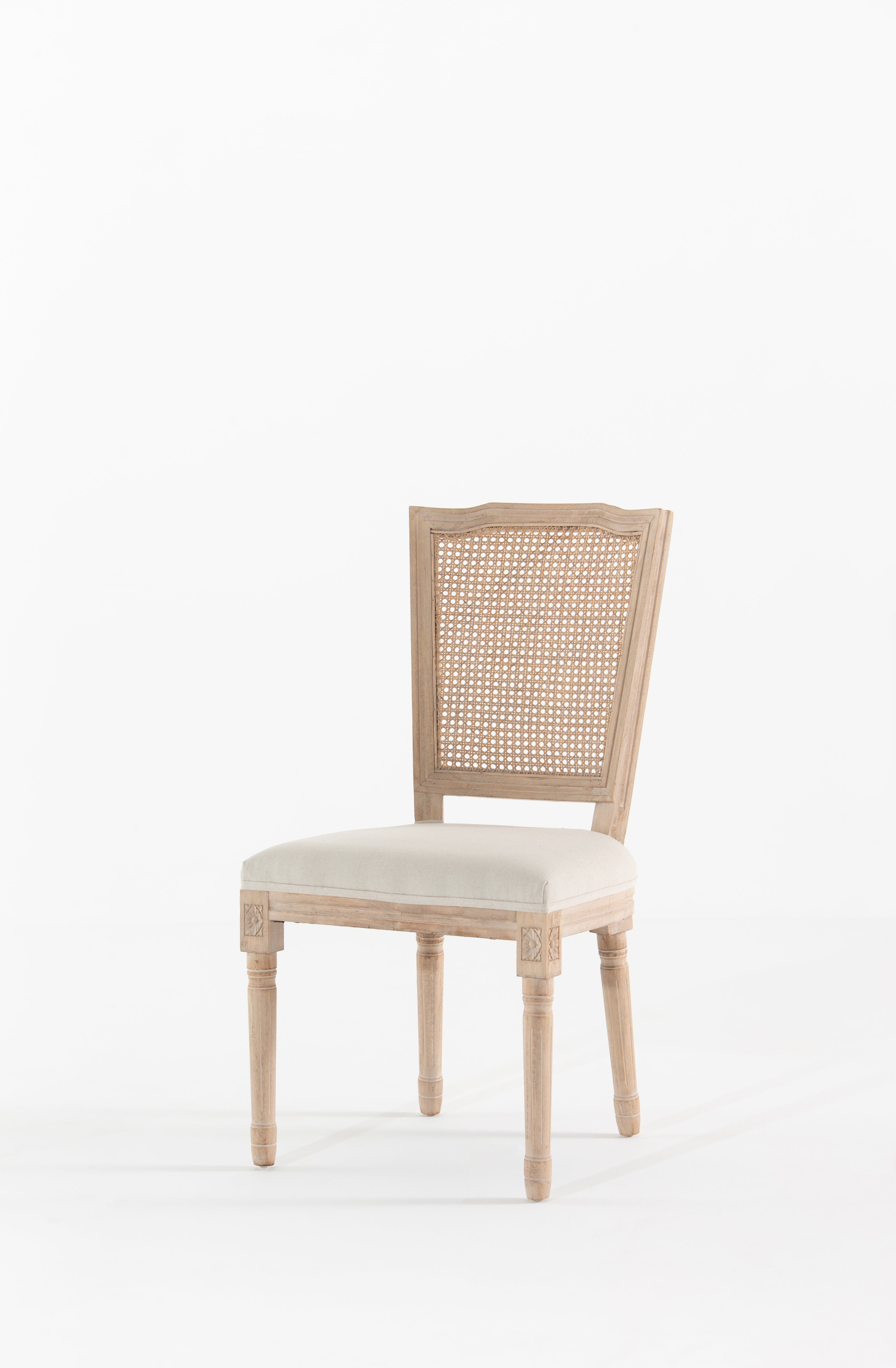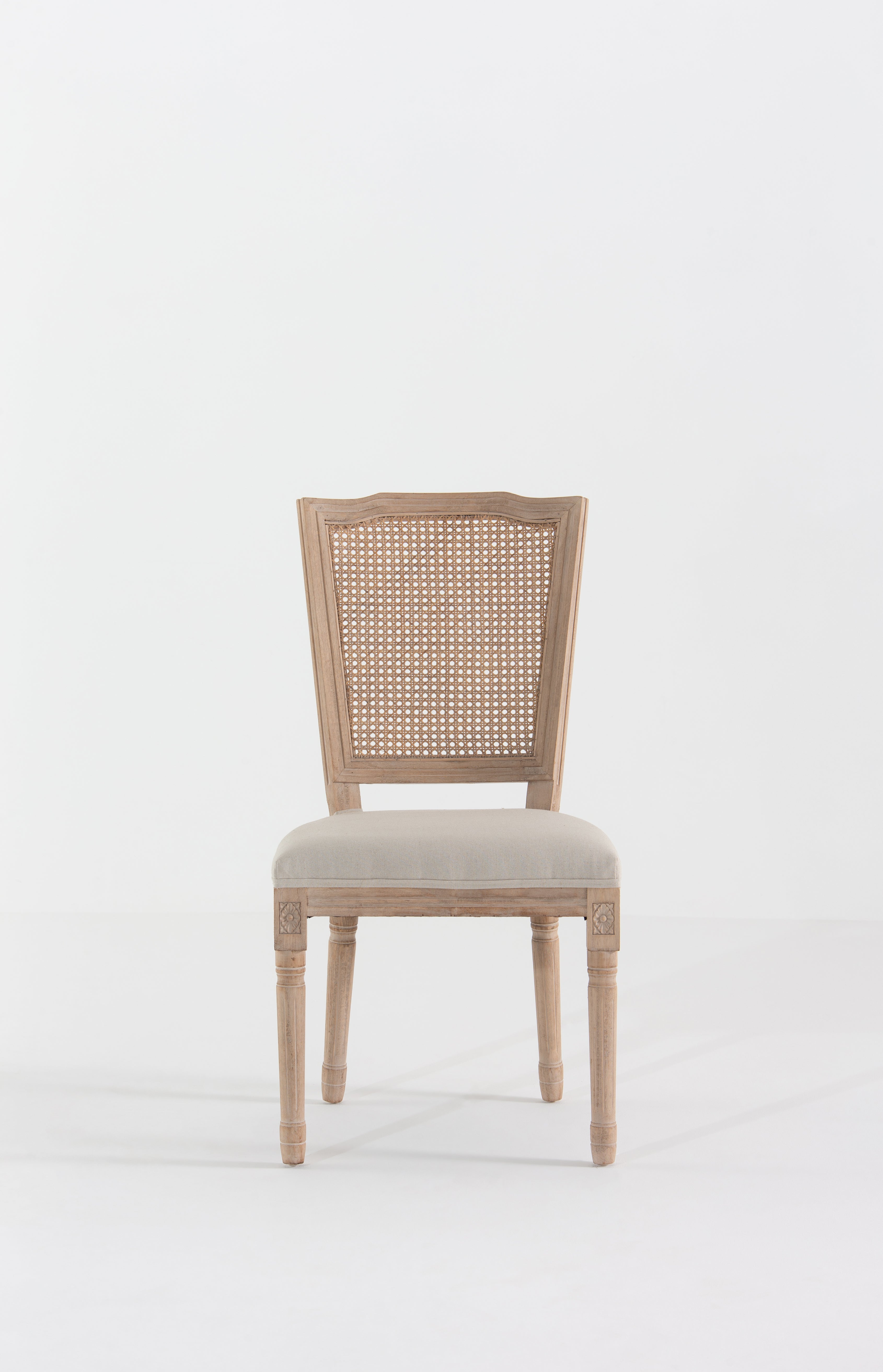 A refined blend of classic elegance and modern craftsmanship, this dining chair is designed to transform your space. Its sturdy wooden frame, finished in a natural tone, is complemented by an intricately handwoven cane backrest, adding a touch of vintage charm. The gracefully sculpted legs feature delicate carvings, while the plush, upholstered seat in soft beige ensures a comfortable dining experience. Whether styled around a traditional dining table or as an accent chair, its airy, sophisticated silhouette enhances any interior with timeless appeal.
