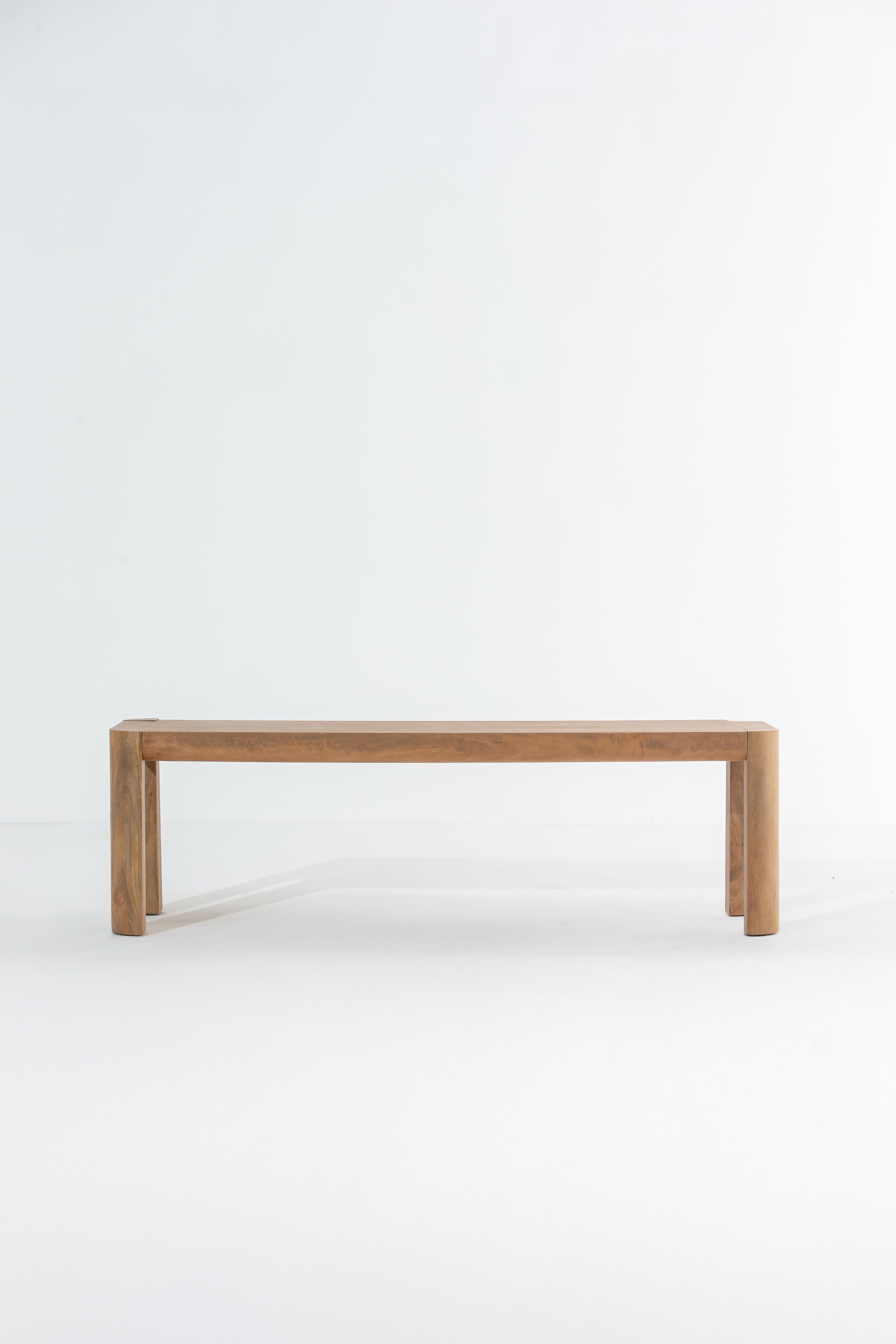 Elevate your interior with the timeless charm of this solid Mindi wood bench designed with subtly rounded edges and a clean, architectural silhouette. Crafted for durability and aesthetic harmony, this bench seamlessly integrates into modern, Scandinavian, or Japandi-inspired spaces. Its natural grain and minimalist form provide both function and sophistication, making it a versatile addition to dining areas, living rooms, entryways, or bedrooms. Pair it with a matching wooden table or use it as standalone seating to highlight its craftsmanship and organic beauty.