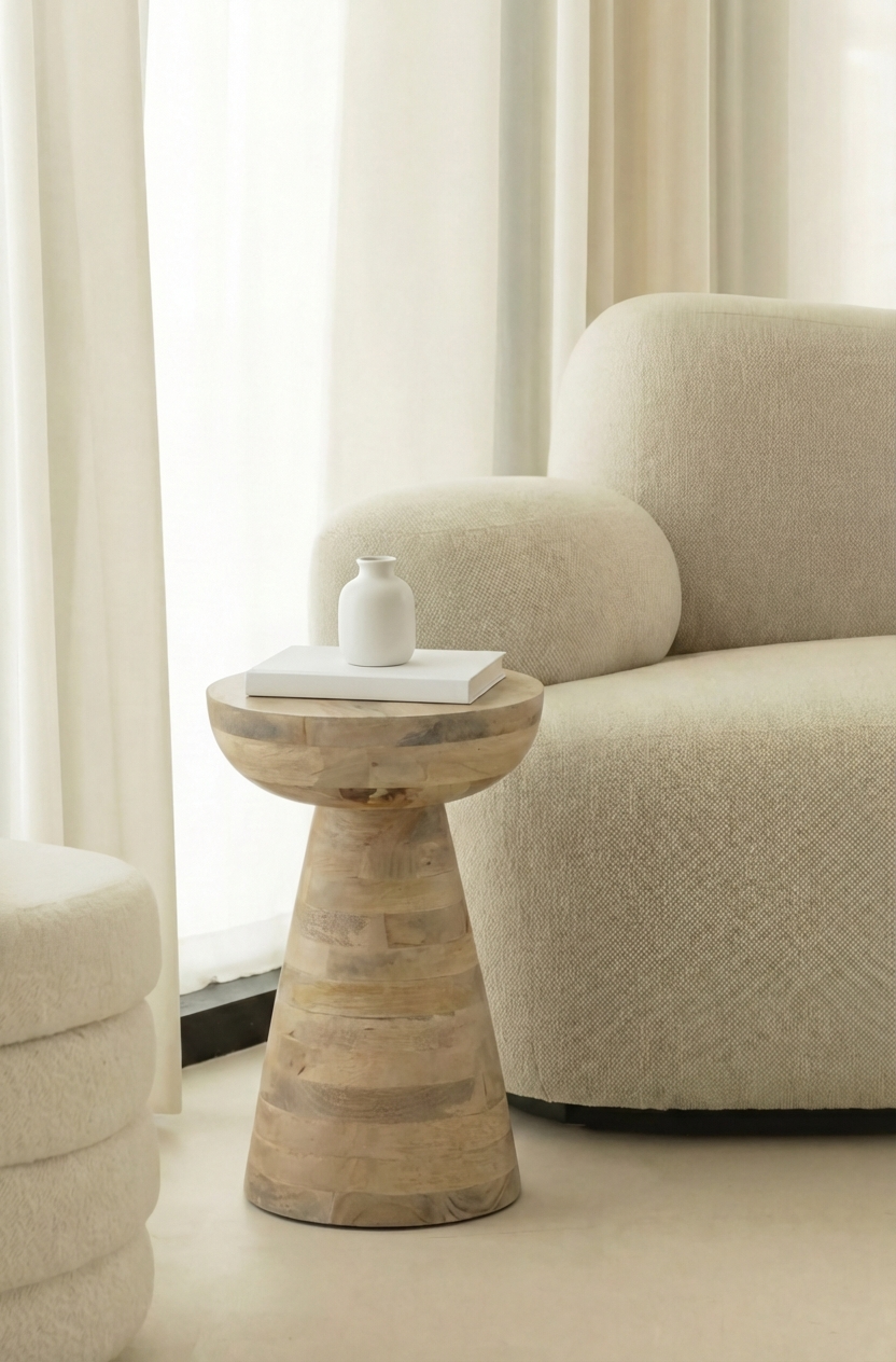 The Micaela Wooden Side Table is crafted from premium mango wood, featuring a smooth, natural finish that enhances its geometric design. The side table's unique hourglass silhouette is comprised of interlocking wooden segments, creating an intriguing visual texture. Its minimalist shape is versatile, complementing various interior styles, from modern to bohemian.