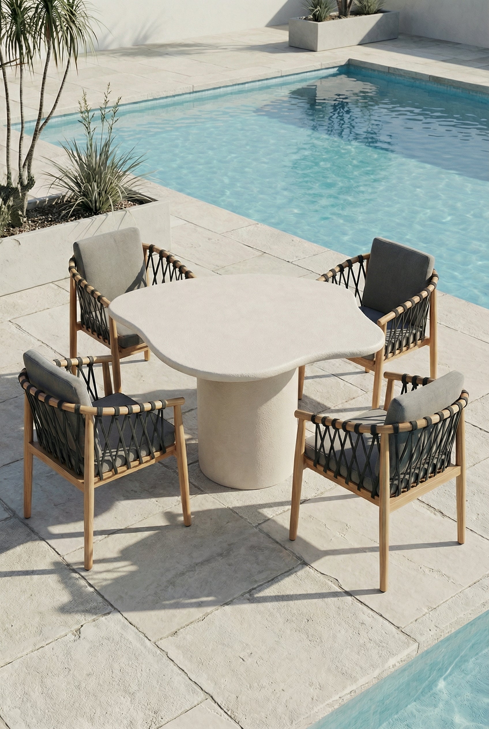 Bring soft warmth and sculptural elegance to your outdoor dining space with an irregular surface finished in Off White microconcrete, creating a calm and sunlit atmosphere. The organic silhouette feels artful yet effortless, while the solid pedestal base adds grounded balance and modern presence. Its smooth matte texture and gentle neutral tone pair beautifully with natural wood, woven seating, and tonal outdoor ceramics, allowing your terrace or garden to feel curated and inviting. Designed for relaxed outdoor dining and elevated open-air gatherings, it transforms every moment into a statement of quiet luxury and contemporary outdoor living.