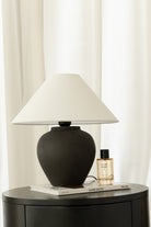 Brighten your home with the understated elegance of the Noemi Black Table Lamp. This contemporary lamp features a sleek, matte black ceramic base with a smooth texture and a tapered, round shape, beautifully contrasted by a classic white or off-white fabric conical lampshade. The soft, diffused light it emits creates a warm and inviting ambiance..
