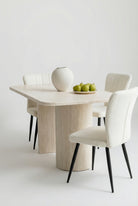 Soft curves, a high-back silhouette, and luxurious boucle upholstery make this dining chair a refined addition to any space. The black powder coated tapered legs contrast elegantly with the plush white fabric, creating a modern yet timeless appeal. Perfect for contemporary interiors, it offers both style and comfort for long dinners and gatherings.