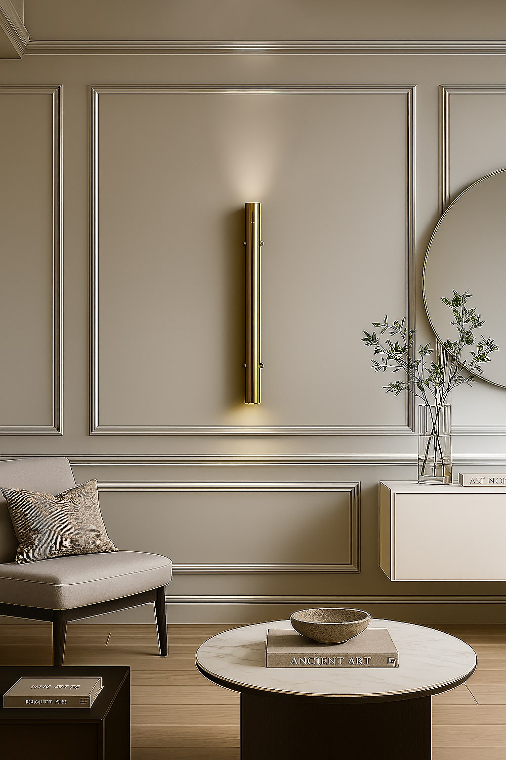 A sleek and sophisticated lighting solution designed for the modern minimalist. Imagine yourself in a beautifully illuminated space, where this elegant lamp serves as a striking piece of wall decor. Its sculptural, columnar shape, finished in a smooth black and gold, creates a powerful vertical line, drawing the eye and adding architectural interest to any room. The innovative design casts a gentle, ambient glow, creating a warm and inviting atmosphere. Crafted from high-quality materials, the lamp's seamless texture and refined silhouette make it a perfect fit for a living room, hallway, or bedroom. Discover the perfect balance of form and function with this designer wall light, and transform your space into a sanctuary of style.