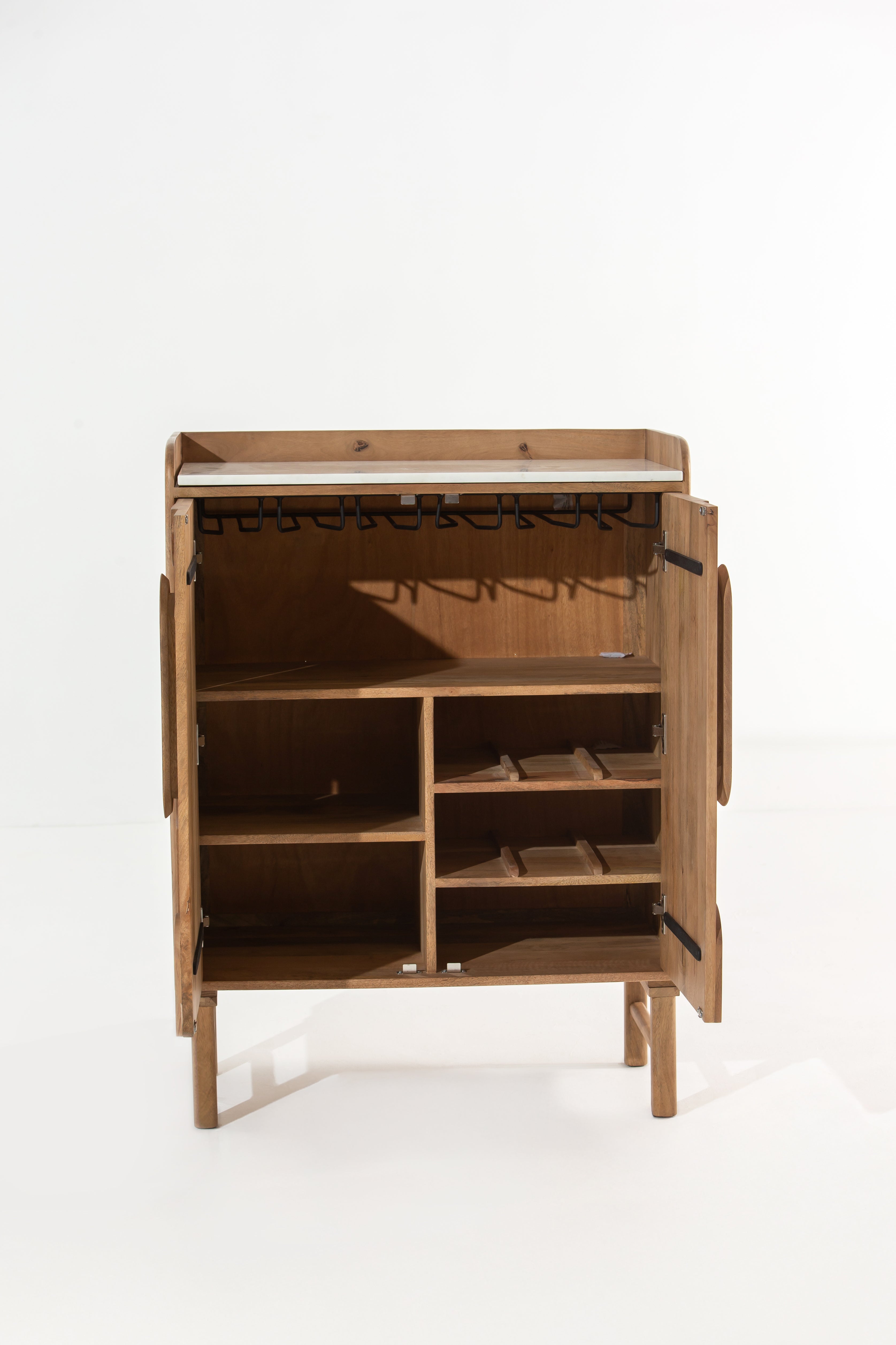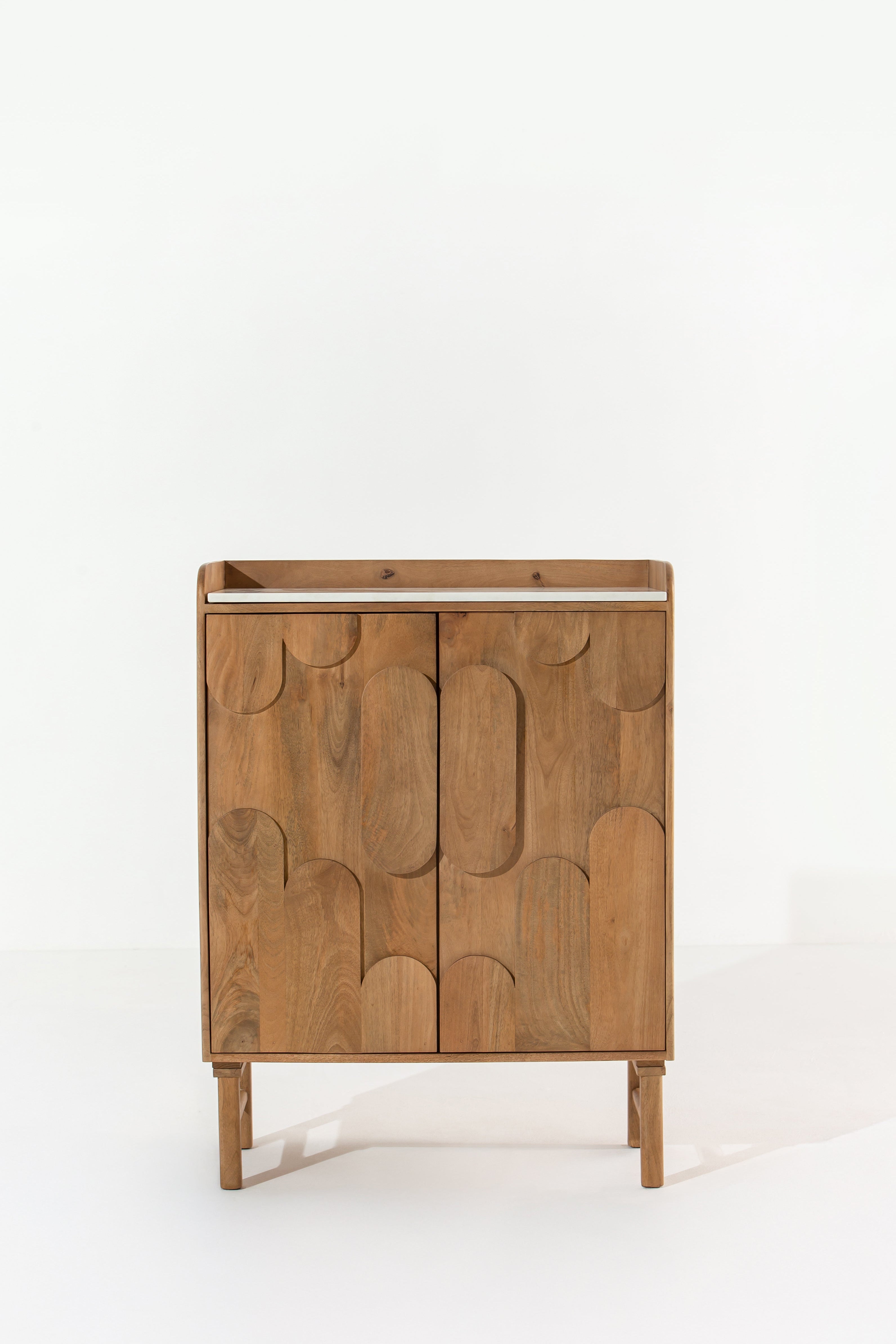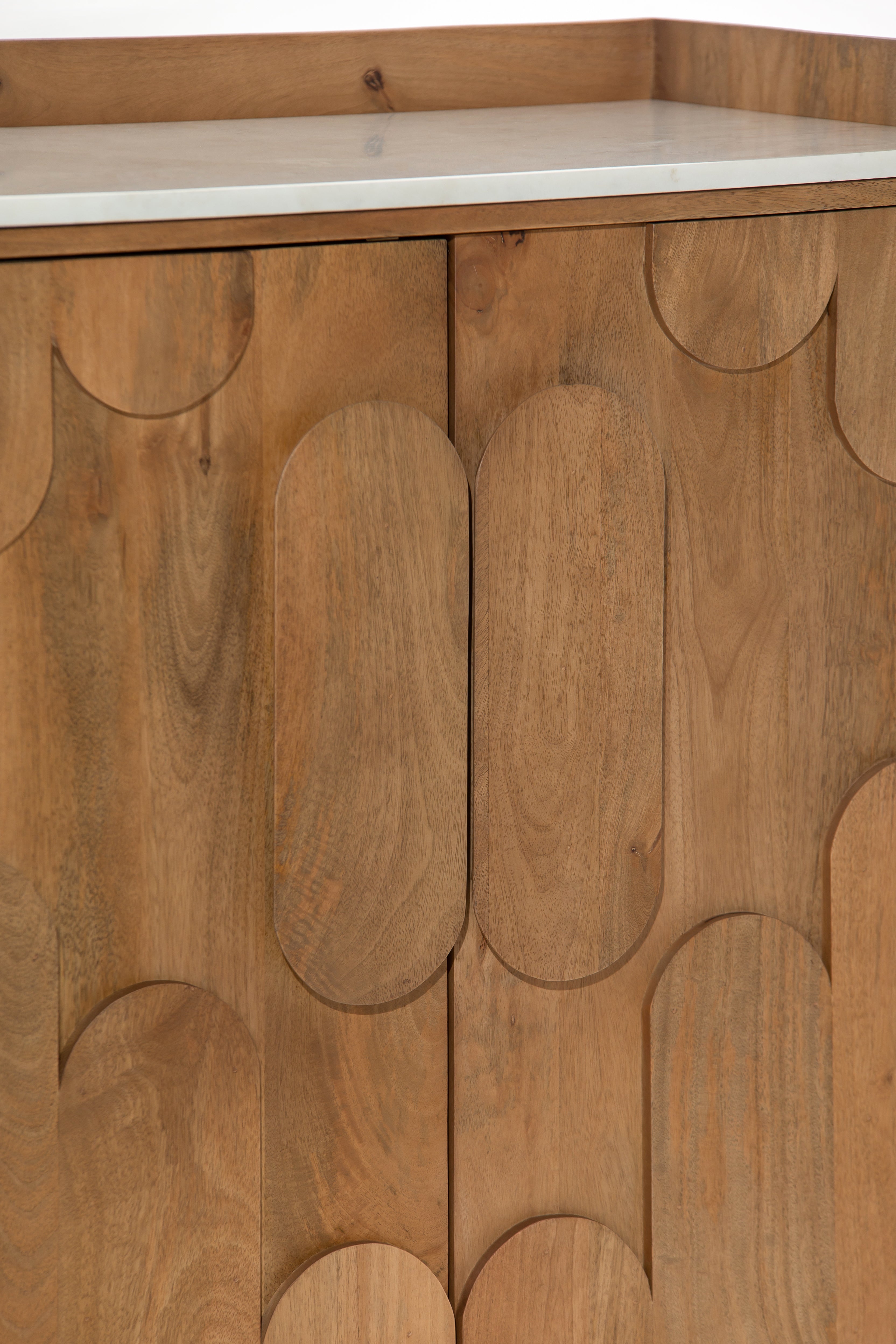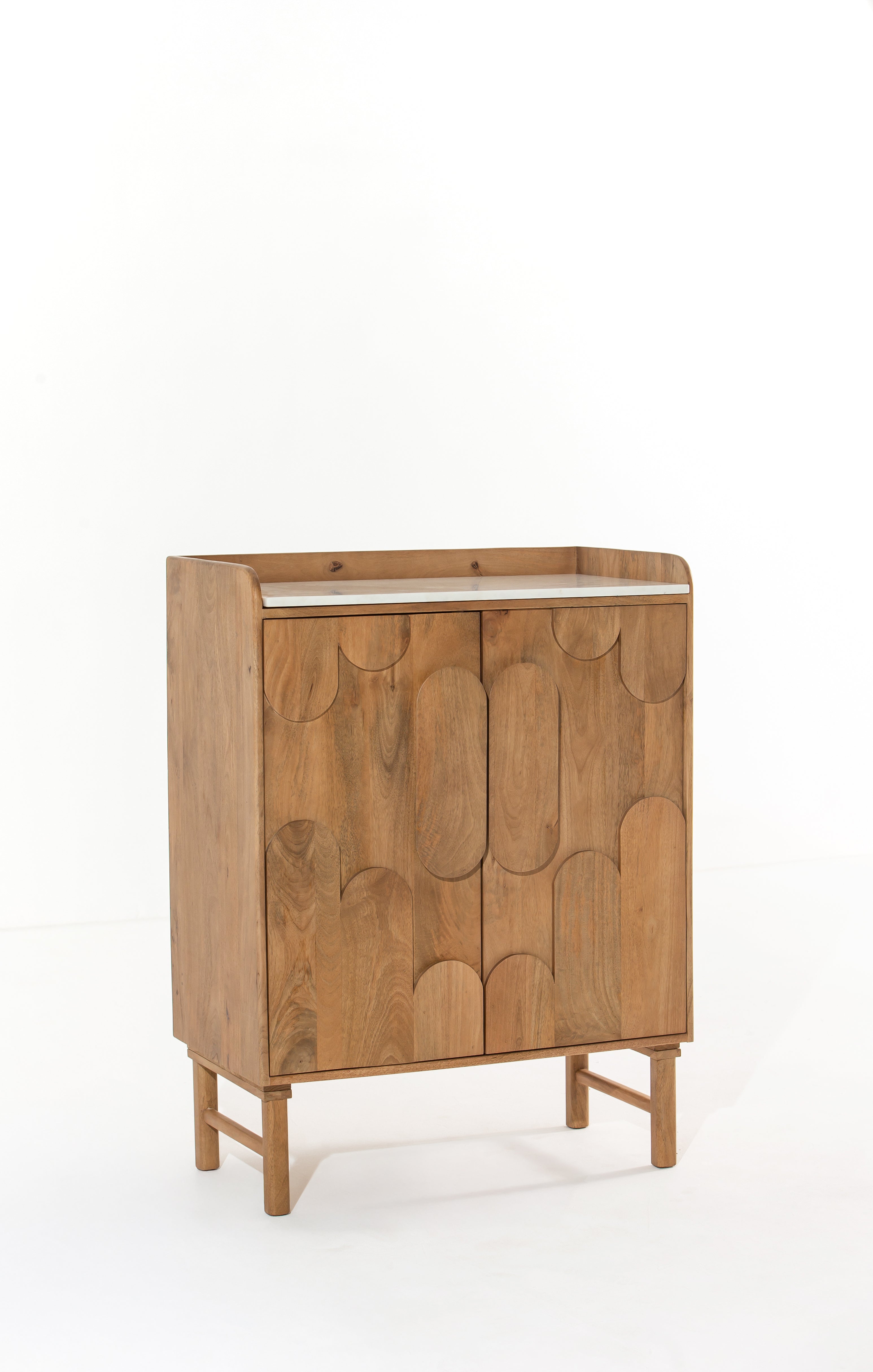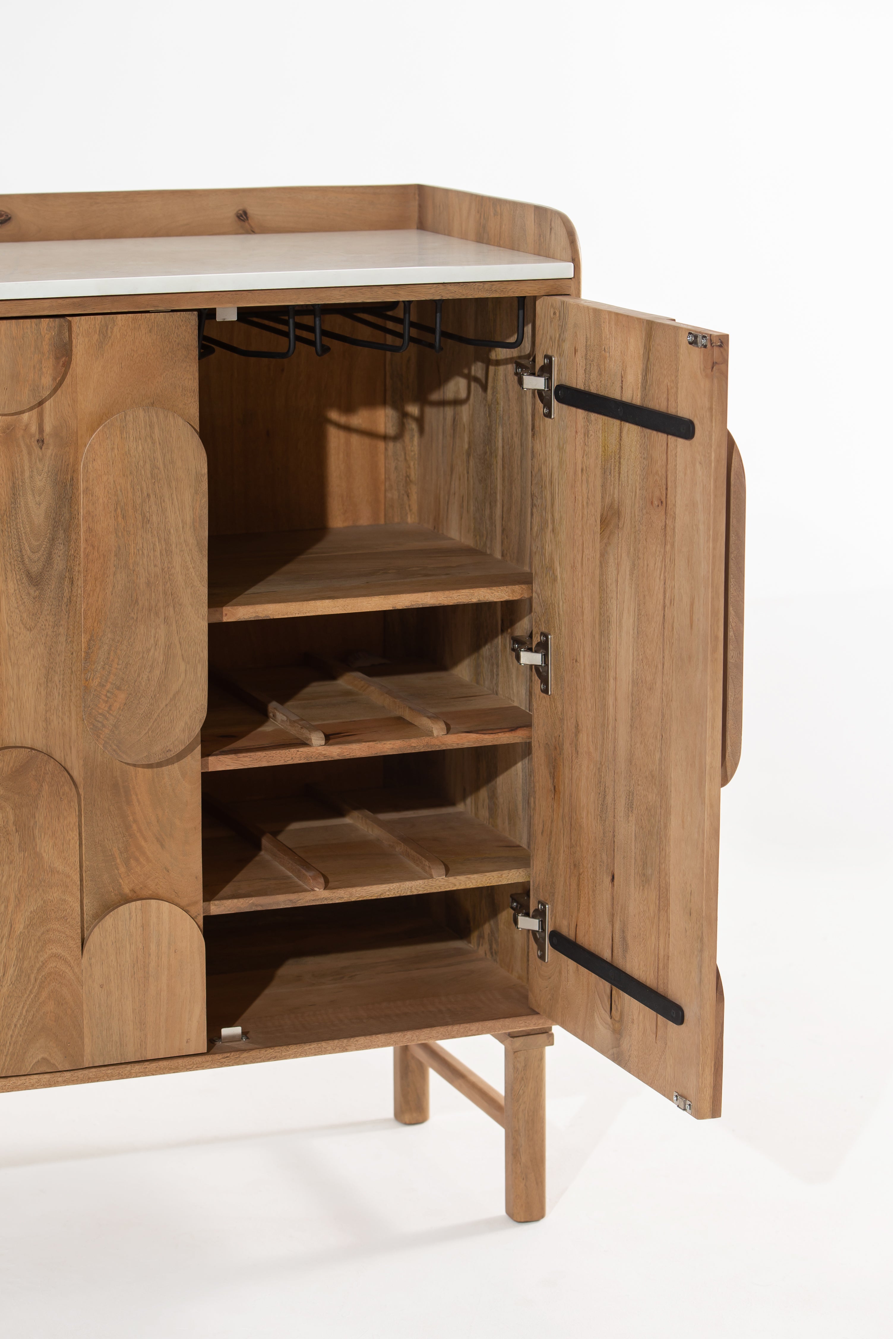 Add a refined touch to your entertaining space with this modern wooden bar cabinet. Crafted with a warm natural wood finish and detailed with sculptural carved patterns, it offers a unique blend of texture and sophistication. The sleek white top provides a clean surface for mixing drinks or displaying barware, while the interior offers discreet storage for bottles, glassware, and cocktail essentials. Ideal for living rooms, dining areas, or cozy nooks, this compact yet eye-catching bar cabinet elevates both style and function—perfect for hosts who appreciate artistry and organization.