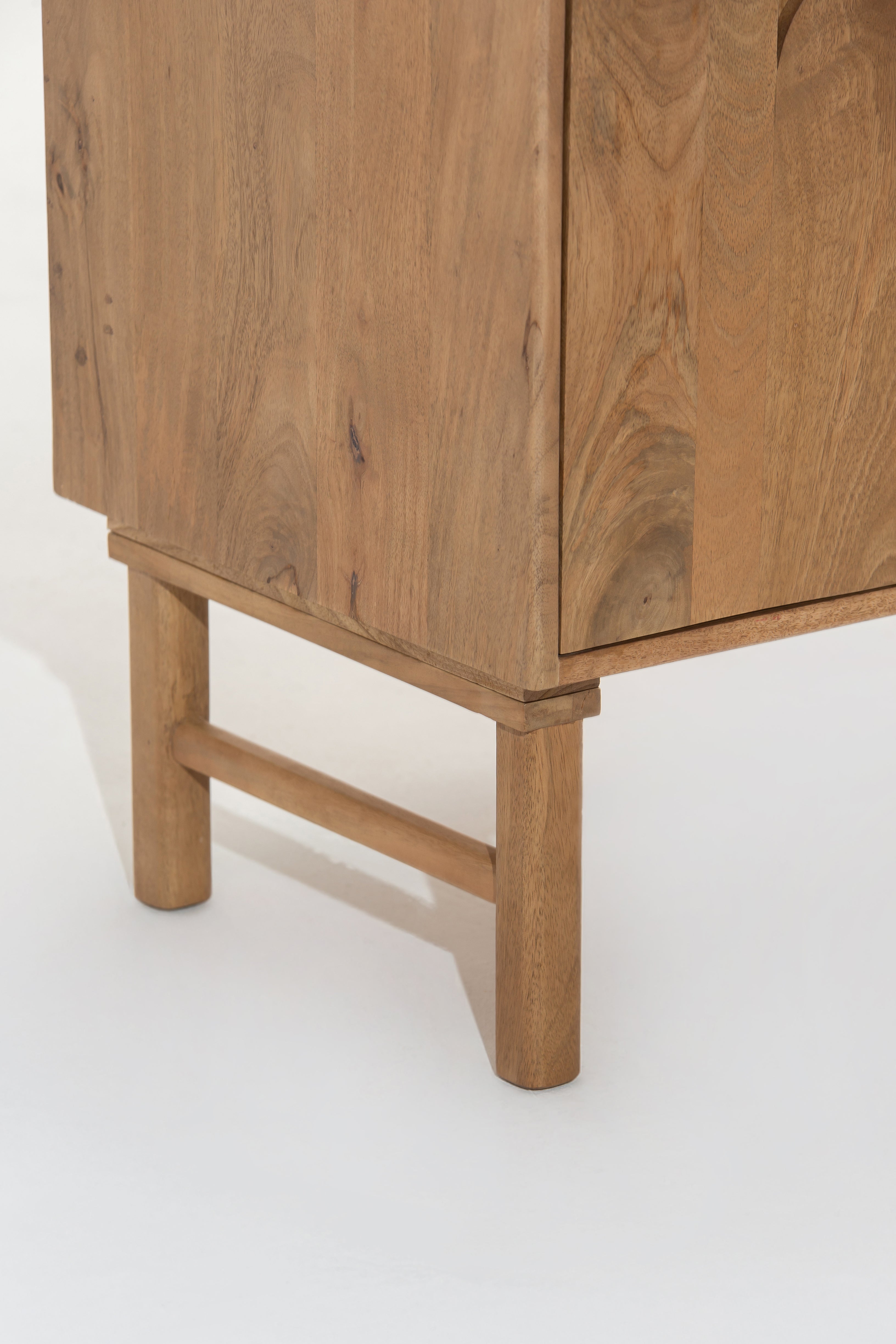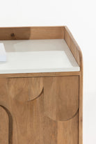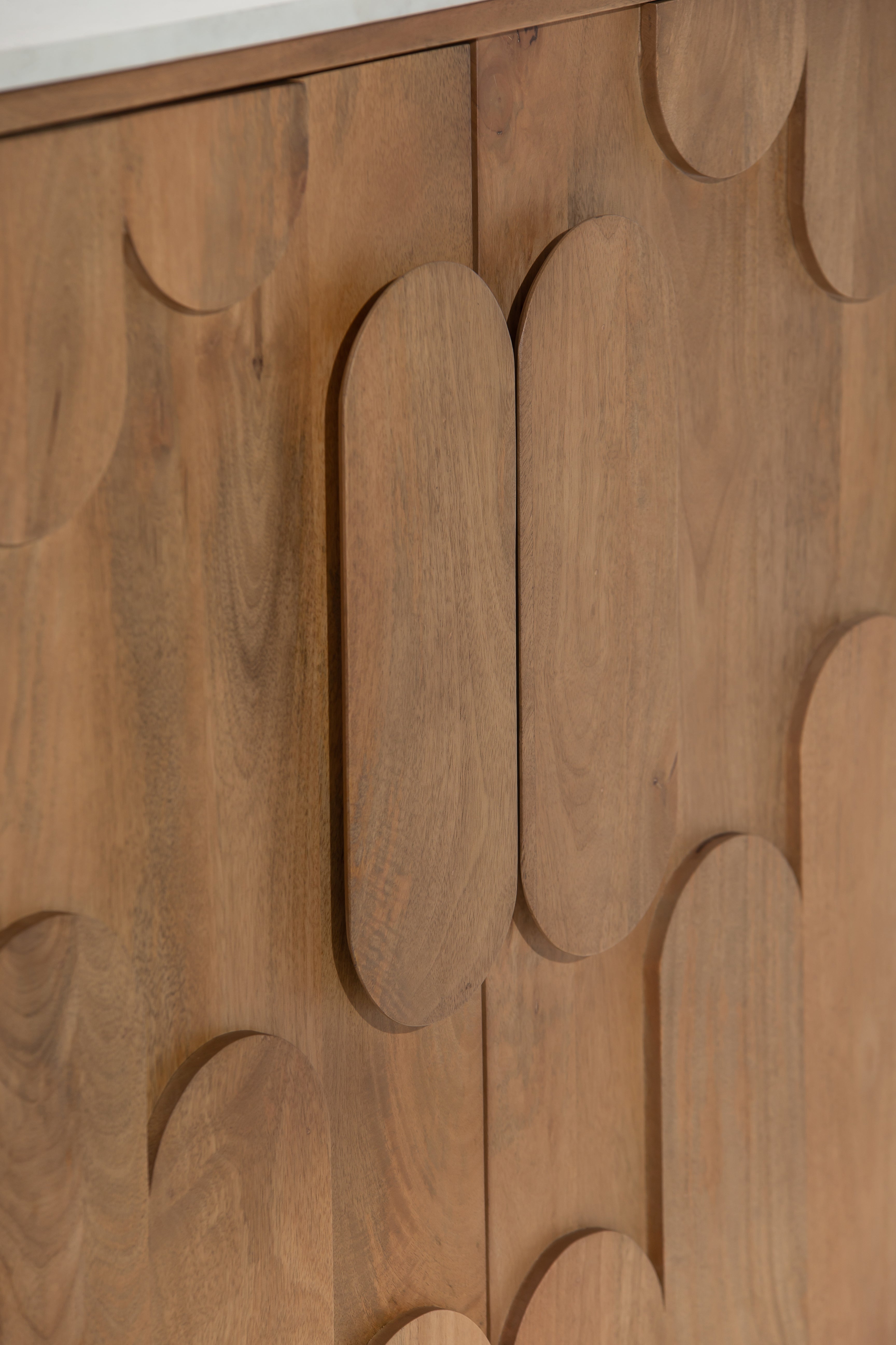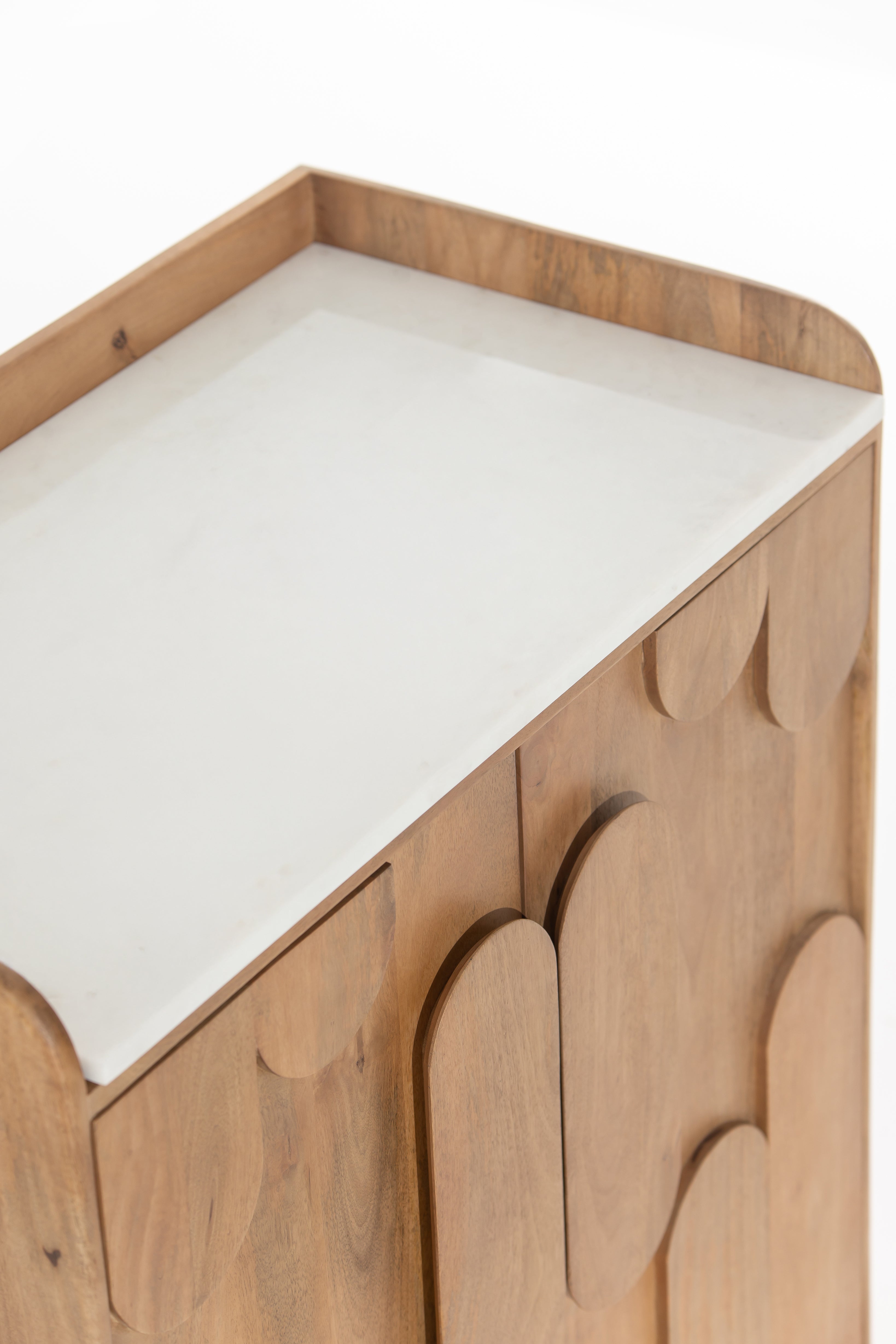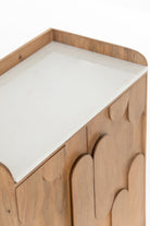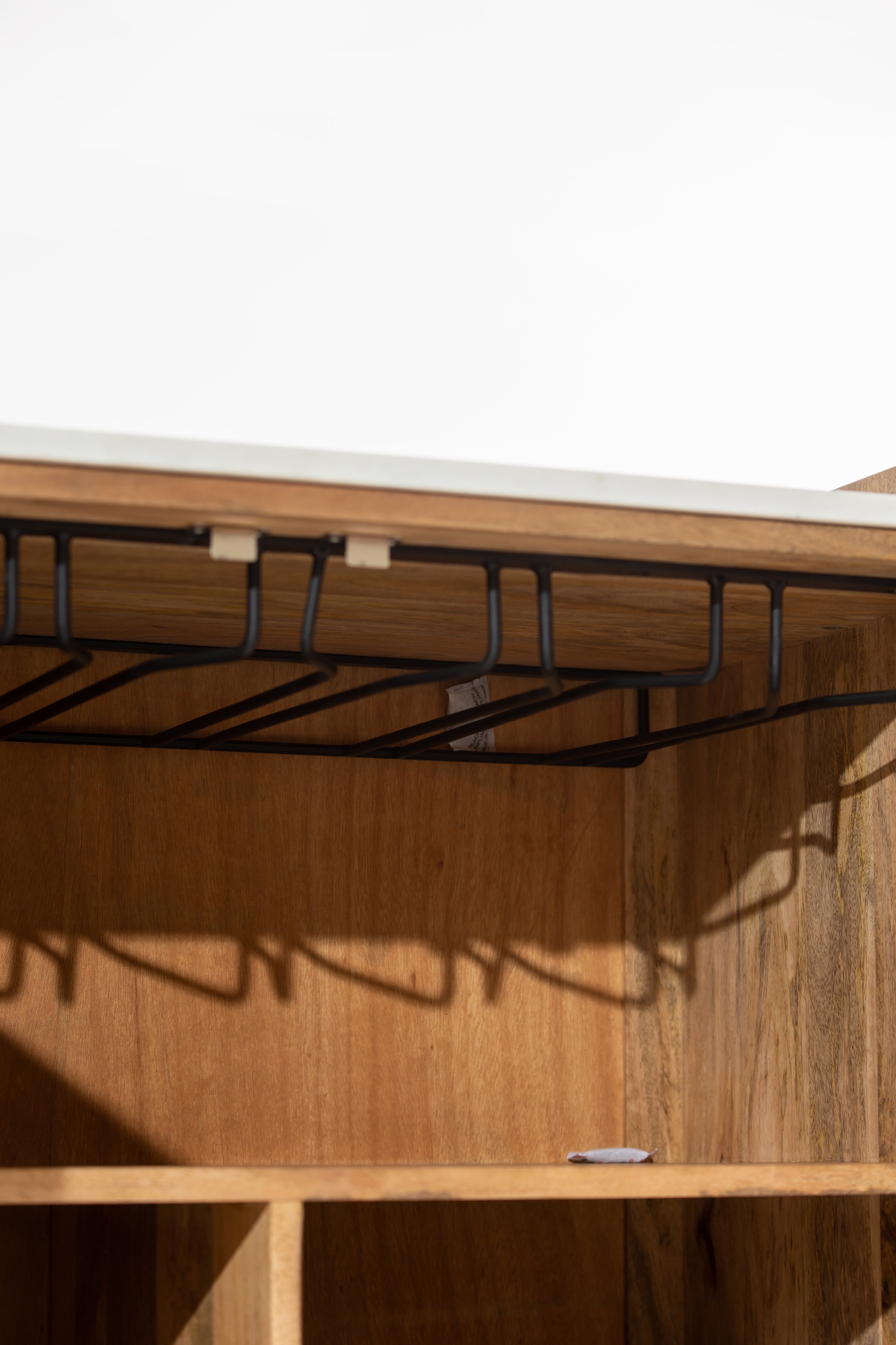 Add a refined touch to your entertaining space with this modern wooden bar cabinet. Crafted with a warm natural wood finish and detailed with sculptural carved patterns, it offers a unique blend of texture and sophistication. The sleek white top provides a clean surface for mixing drinks or displaying barware, while the interior offers discreet storage for bottles, glassware, and cocktail essentials. Ideal for living rooms, dining areas, or cozy nooks, this compact yet eye-catching bar cabinet elevates both style and function—perfect for hosts who appreciate artistry and organization.