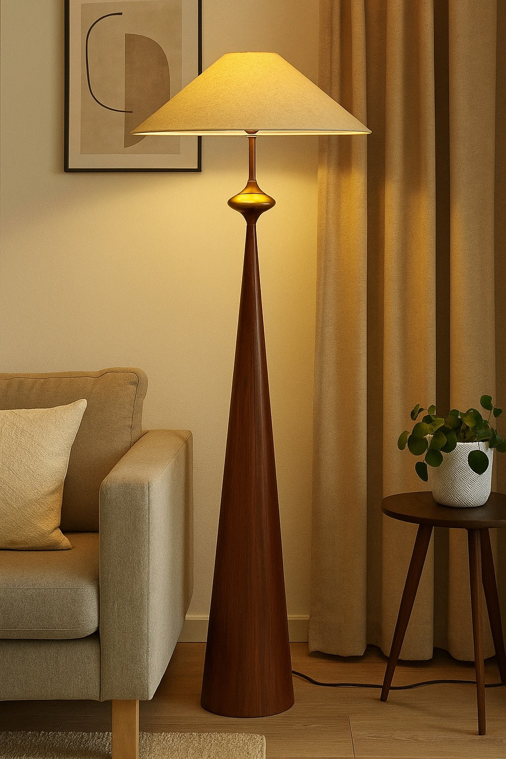 Illuminate your home with this modern floor lamp in rich walnut brown and gold, designed with a slender tapered base that flows seamlessly into a sculptural silhouette. The wide conical shade in a warm beige tone casts a soft ambient glow, perfect for creating cozy yet elegant atmospheres. With its sleek vertical form, natural wood texture, and gold accents, it becomes both a functional light source and a statement piece that complements minimalist, mid-century, or contemporary interiors.