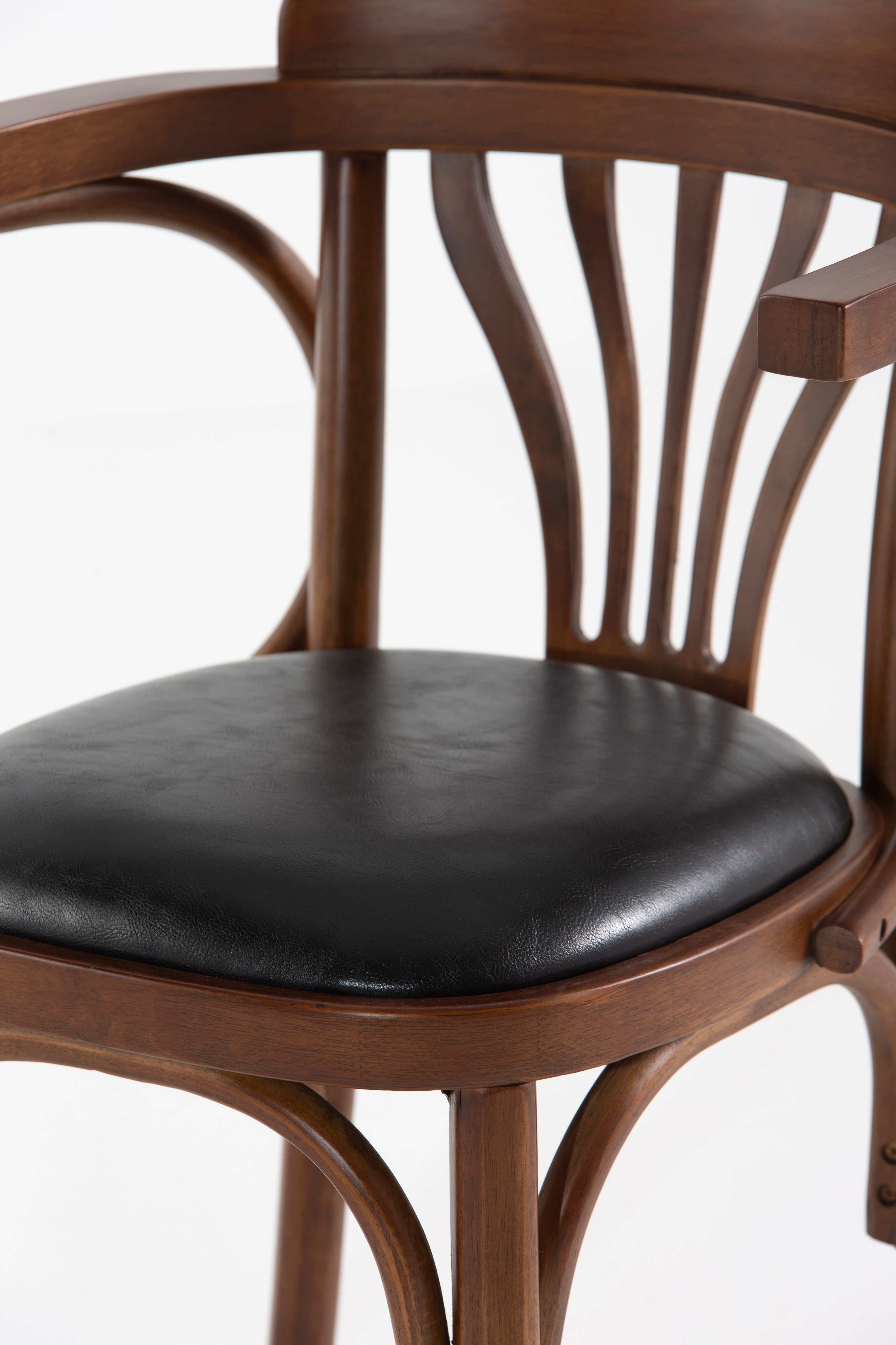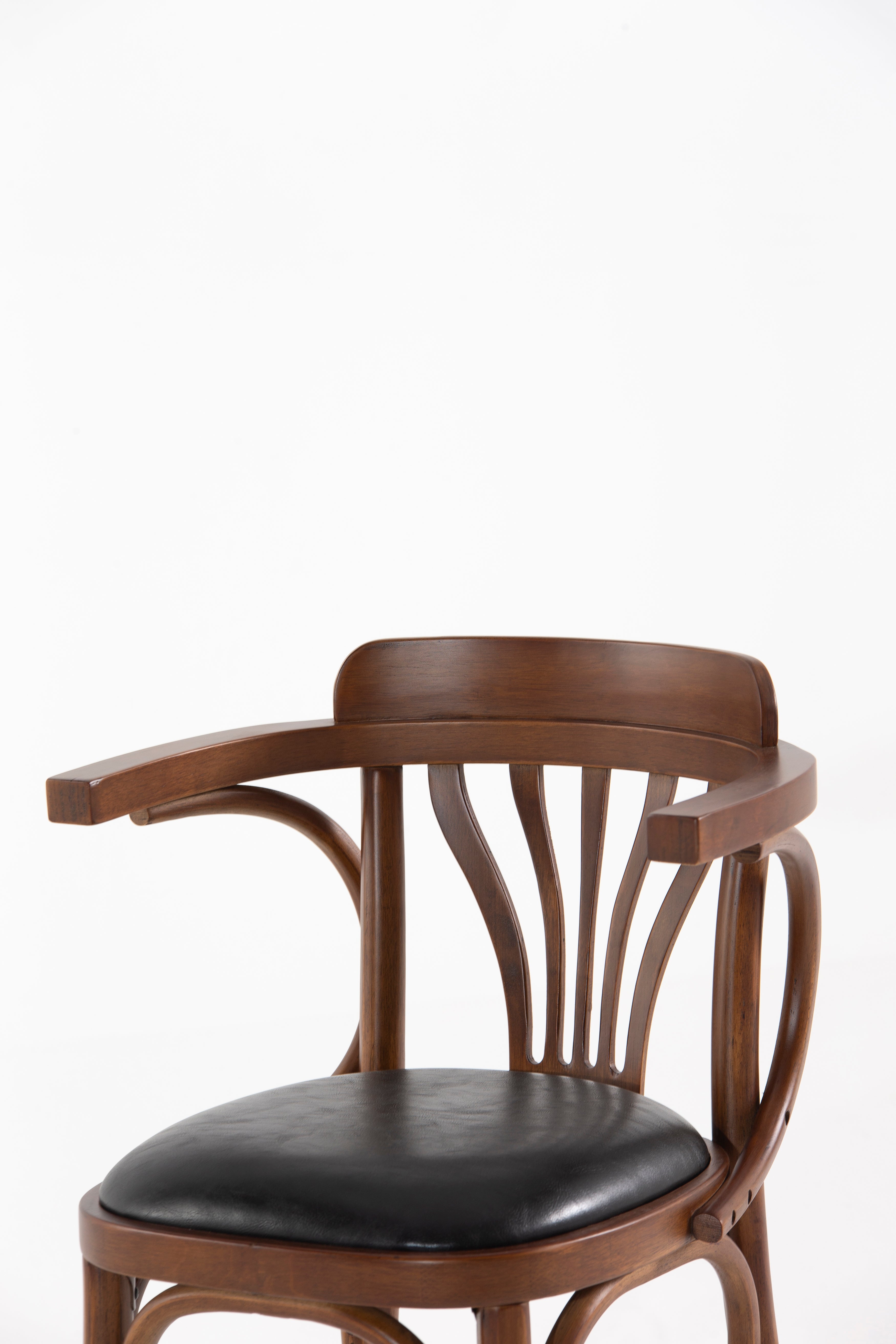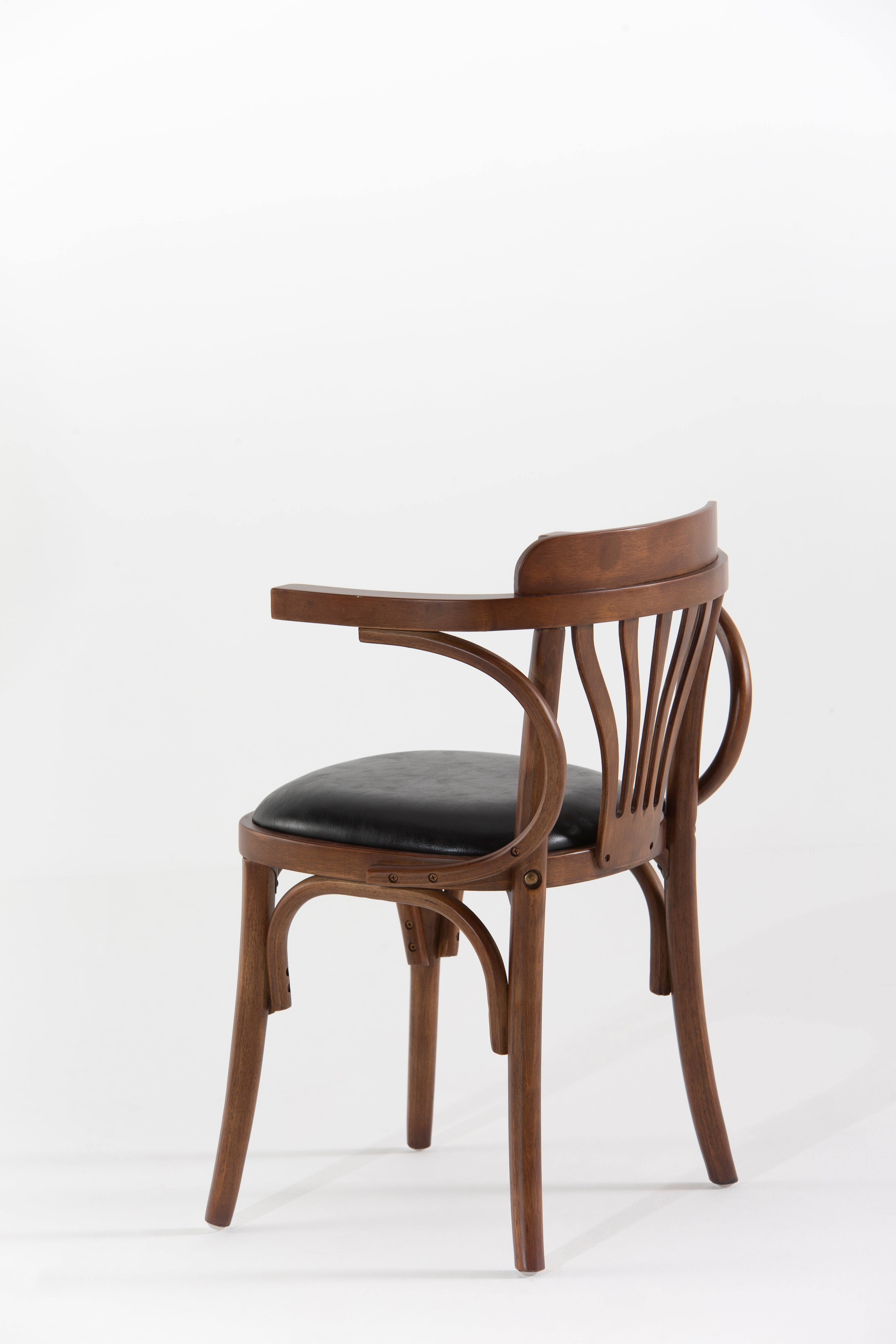 Step into elegance with this curved wood dining chair, crafted from warm brown wood with a gracefully arched backrest and sculpted armrests. The rich black faux leather seat offers a sleek contrast, ensuring both comfort and durability. Designed with flowing bentwood details, this chair blends classic charm with modern sophistication, making it an ideal choice for dining spaces, cafes, and stylish interiors.
