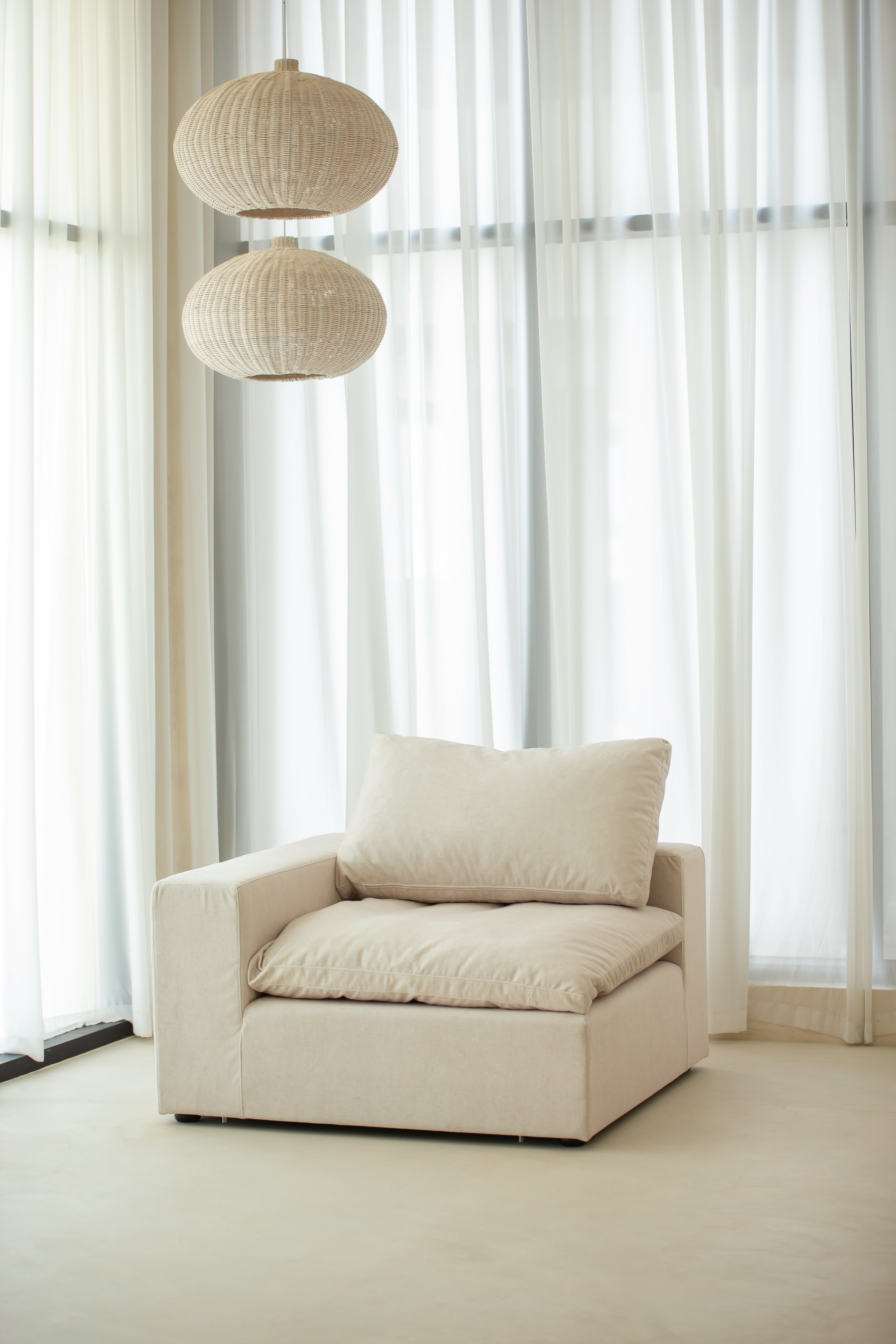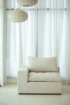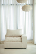 Create a snug corner of comfort with plush cushioning wrapped in soft light beige fabric. Designed to complete modular seating arrangements, this corner piece offers a gentle embrace with its curved backrest and deep seating, perfect for curling up with a book or sharing quiet conversations. Its soothing neutral tone blends seamlessly with surrounding pieces, inviting you to build a warm, cohesive space tailored to relaxation and togetherness.
