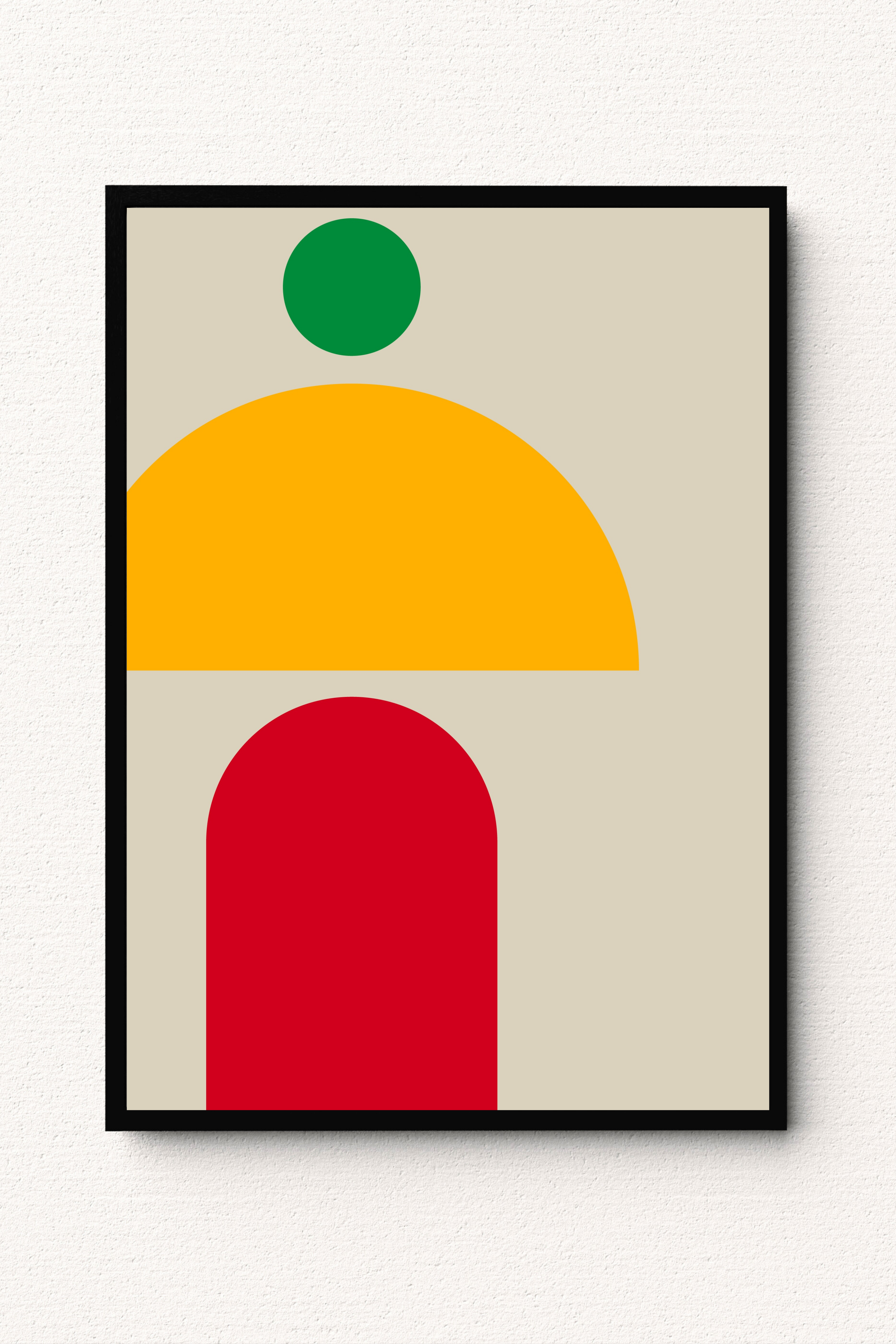 Bring bold modern energy into your home with a geometric abstract print that makes you the curator of stylish interiors. A vivid green circle, golden yellow dome, and striking red arch are stacked with precision against a soft beige background, creating harmony between playful design and minimalist structure. The smooth matte finish highlights the clean lines and vibrant primary colors, making this artwork a statement piece for mid-century modern, contemporary, or eclectic décor. Perfect for your living room, bedroom, or office, it transforms your walls into a showcase of color and balance.