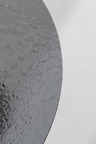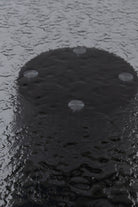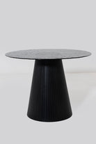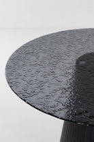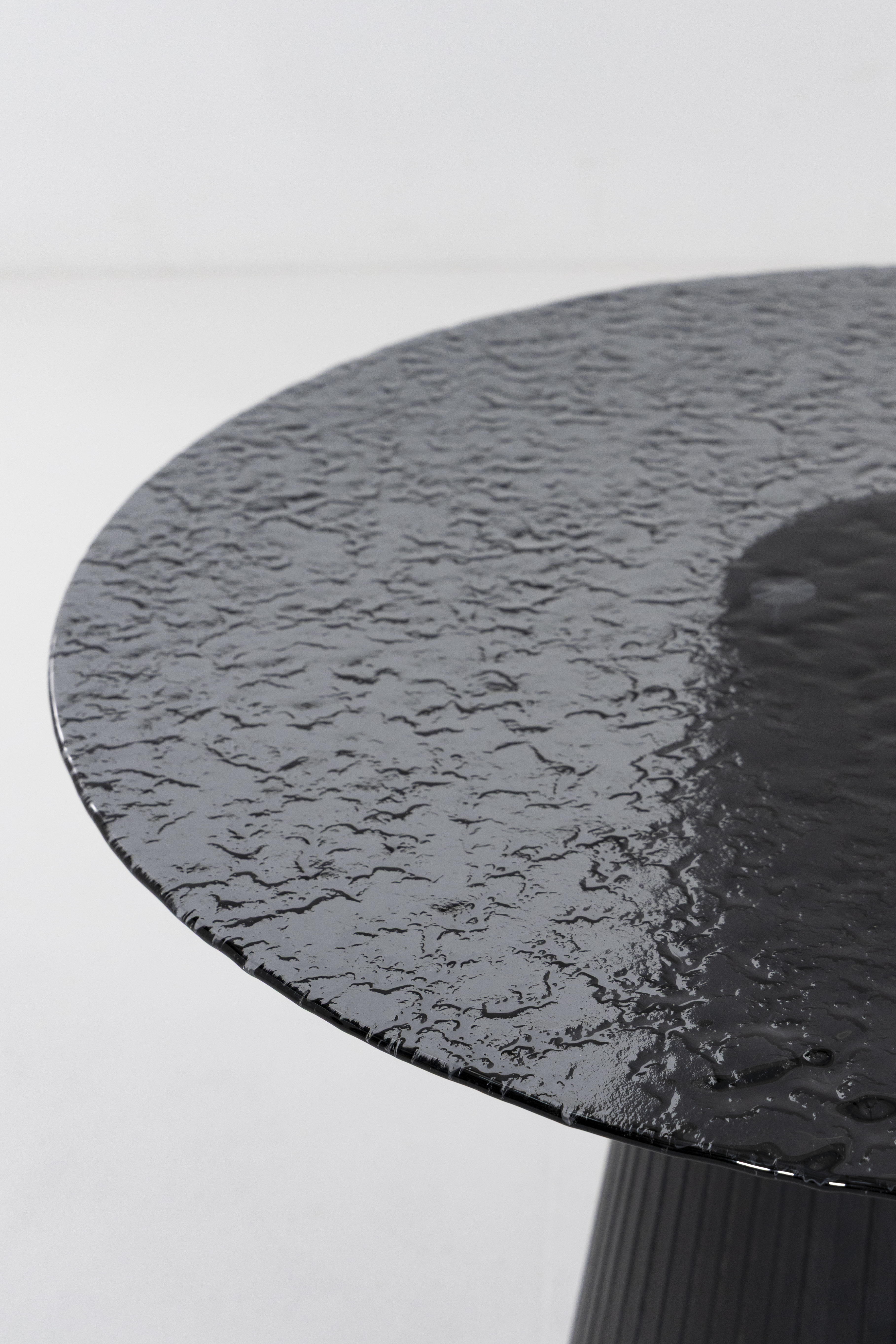 A round dining table with a melt-glass top that shows a subtle rippled texture, set over a sculpted black MDF pedestal with a smooth paper-foil finish. The glass surface feels cool and wipes clean after meals, while the open base keeps legroom clear and chairs comfortable all around. Use it for breakfast nooks or compact dining spaces; the calm, black and clear materials pair easily with fabric or leather chairs and create a steady daily gathering spot at home. Plate base keeps top steady daily.
