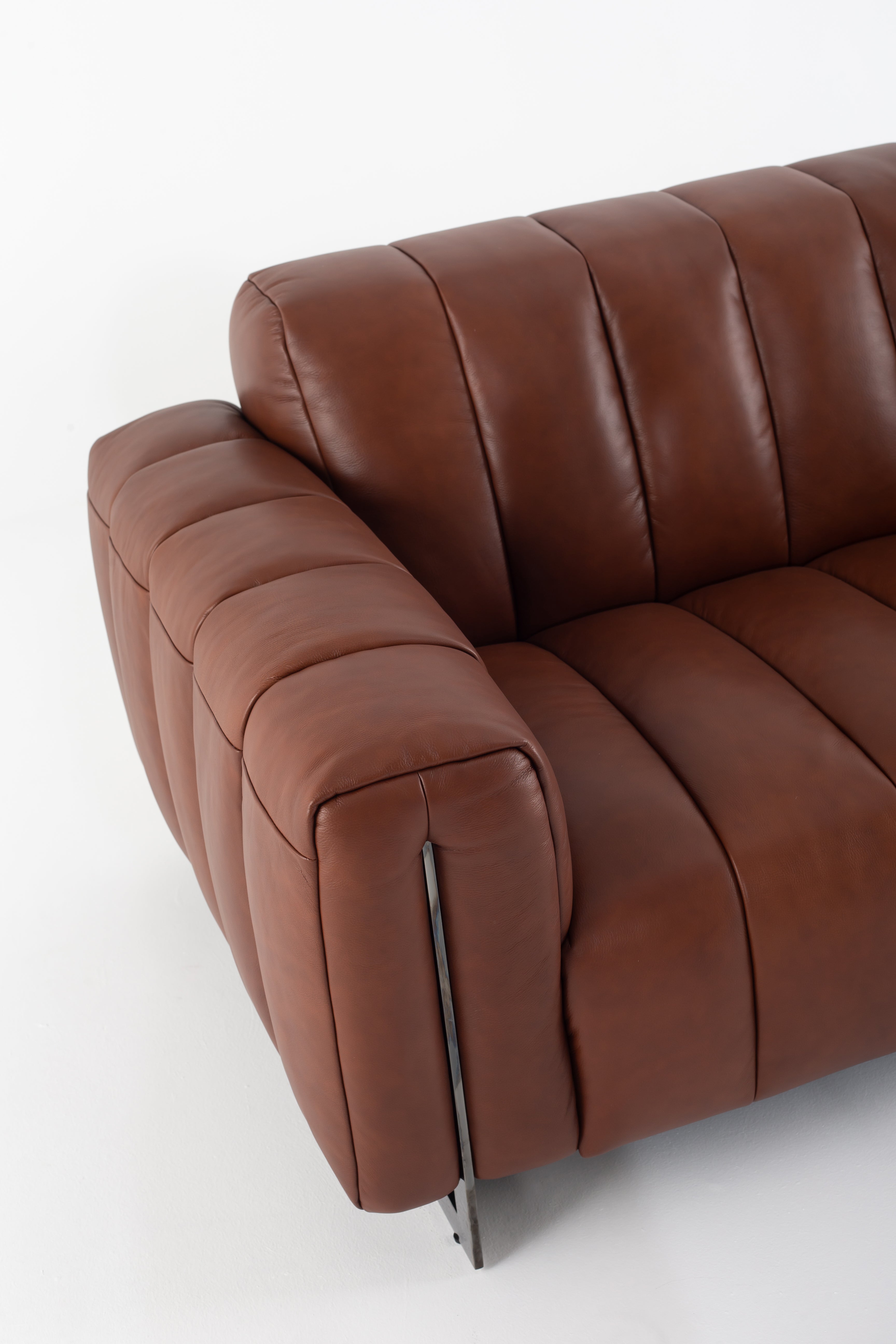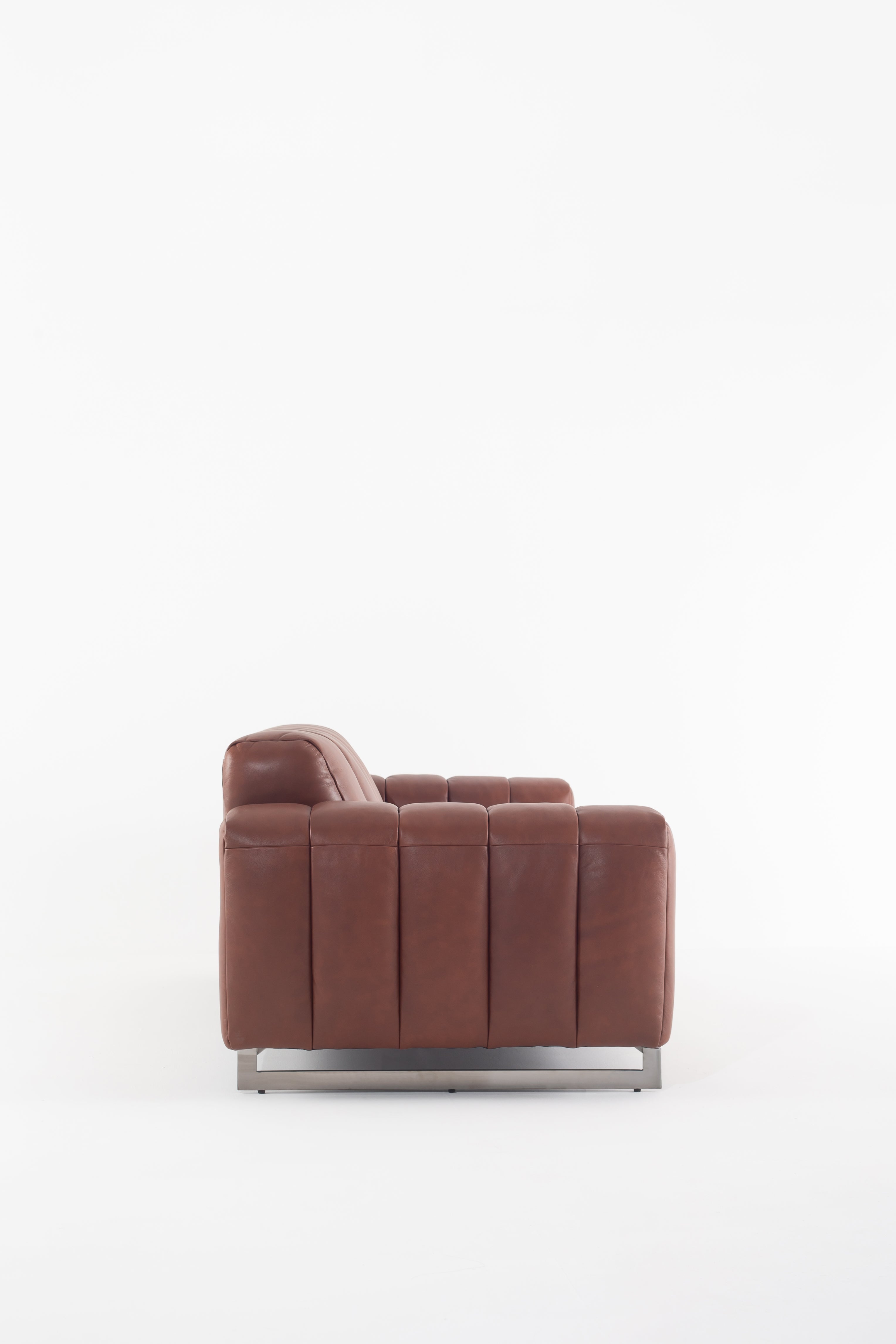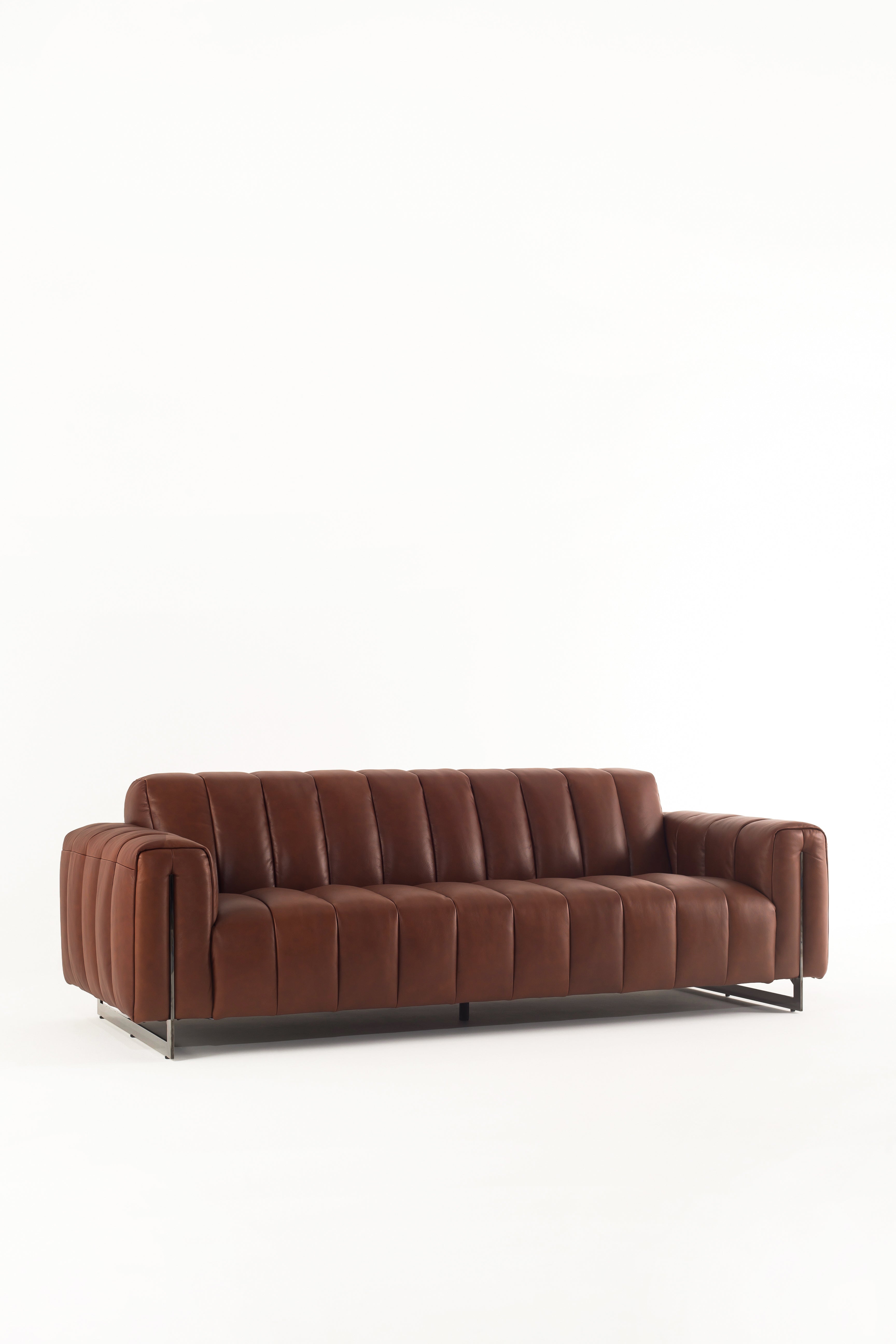 Envision yourself sinking into the rich, supple cowhide leather of this stunning sofa, its deep brown hue exuding warmth and timeless appeal. The structured, channel-tufted upholstery enhances its modern yet inviting presence, while the bold, boxy arms add a refined edge. Elevated on sleek black metal legs, this piece delivers a harmonious blend of industrial strength and luxurious comfort. Every detail, from the smooth leather texture to the perfectly cushioned seating, invites you to unwind in style. A statement of sophistication, this leather sofa transforms any living space into a haven of elegance.
