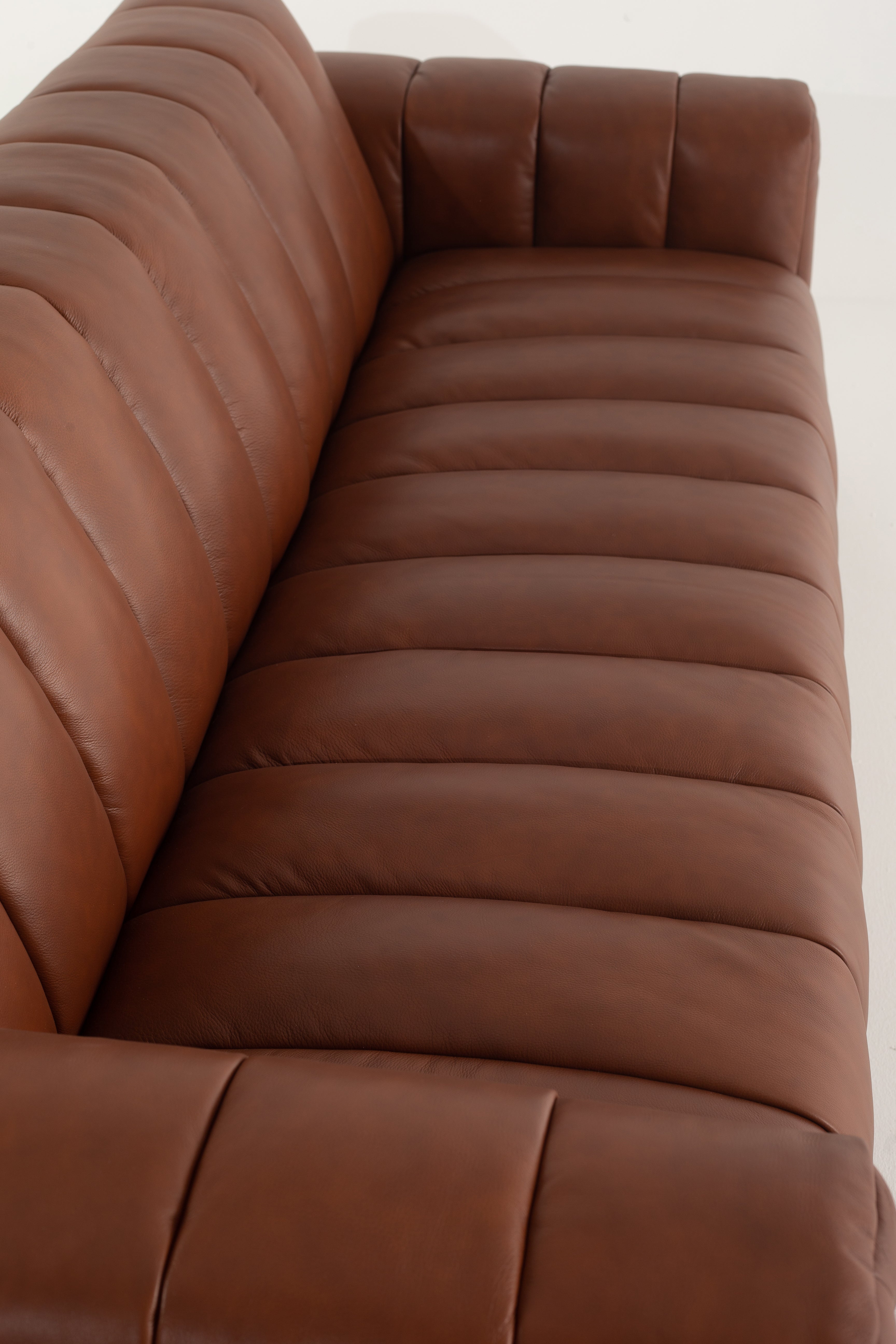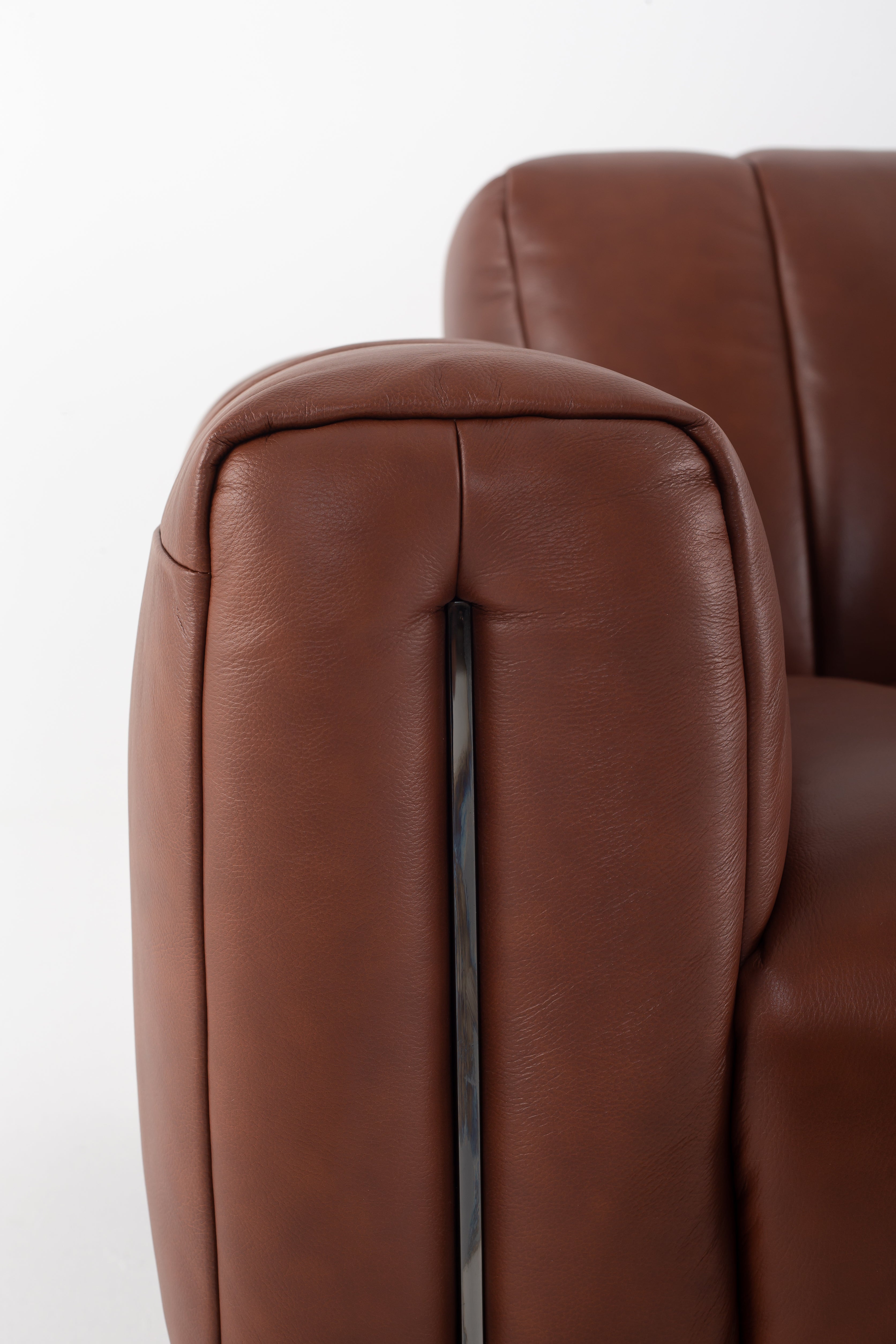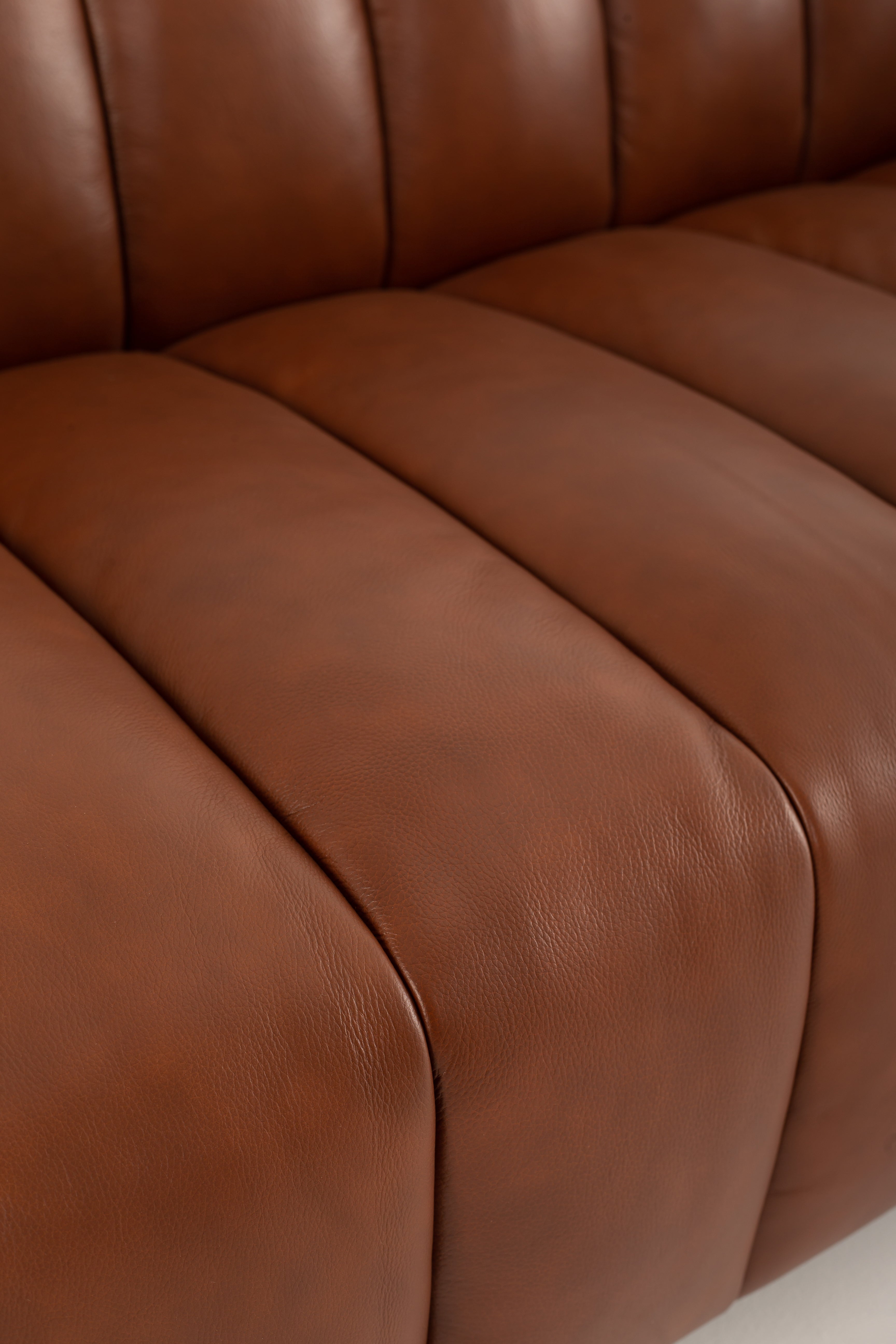 Envision yourself sinking into the rich, supple cowhide leather of this stunning sofa, its deep brown hue exuding warmth and timeless appeal. The structured, channel-tufted upholstery enhances its modern yet inviting presence, while the bold, boxy arms add a refined edge. Elevated on sleek black metal legs, this piece delivers a harmonious blend of industrial strength and luxurious comfort. Every detail, from the smooth leather texture to the perfectly cushioned seating, invites you to unwind in style. A statement of sophistication, this leather sofa transforms any living space into a haven of elegance.