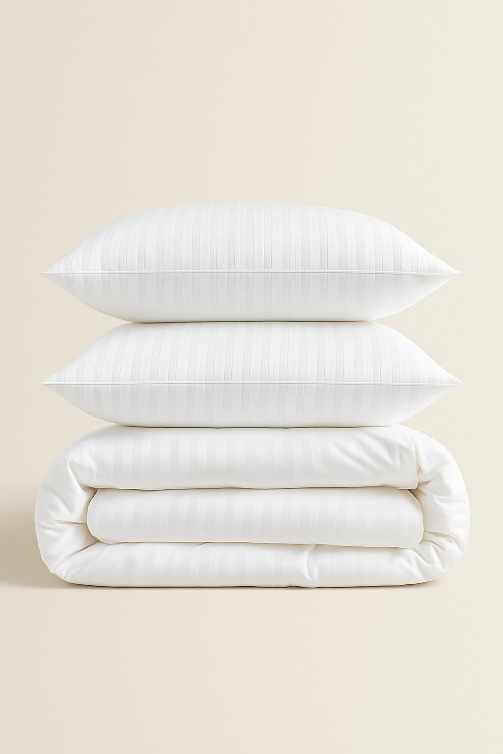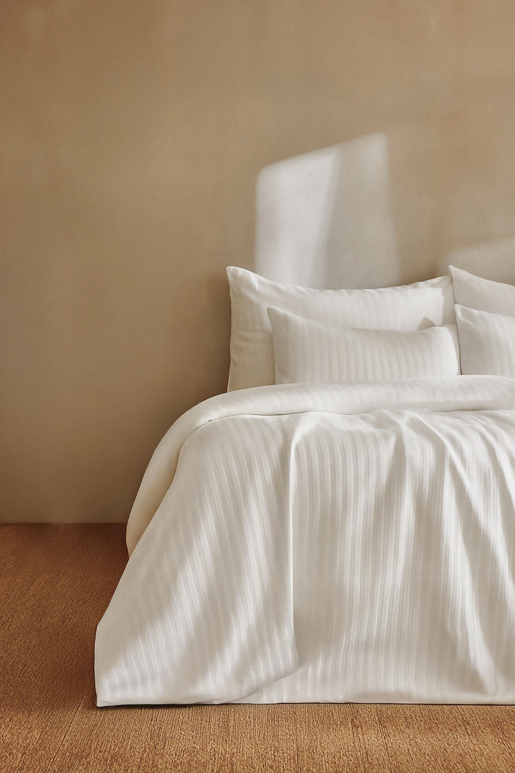 Imagine slipping into crisp, cool layers woven from 300 thread count 100% cotton, where soft stripes catch the light and create a fresh, hotel-like comfort. The smooth texture feels breathable against your skin, the perfectly tailored fit shapes your bed neatly, and the clean white shade brightens your entire space giving you the restful sanctuary you deserve.