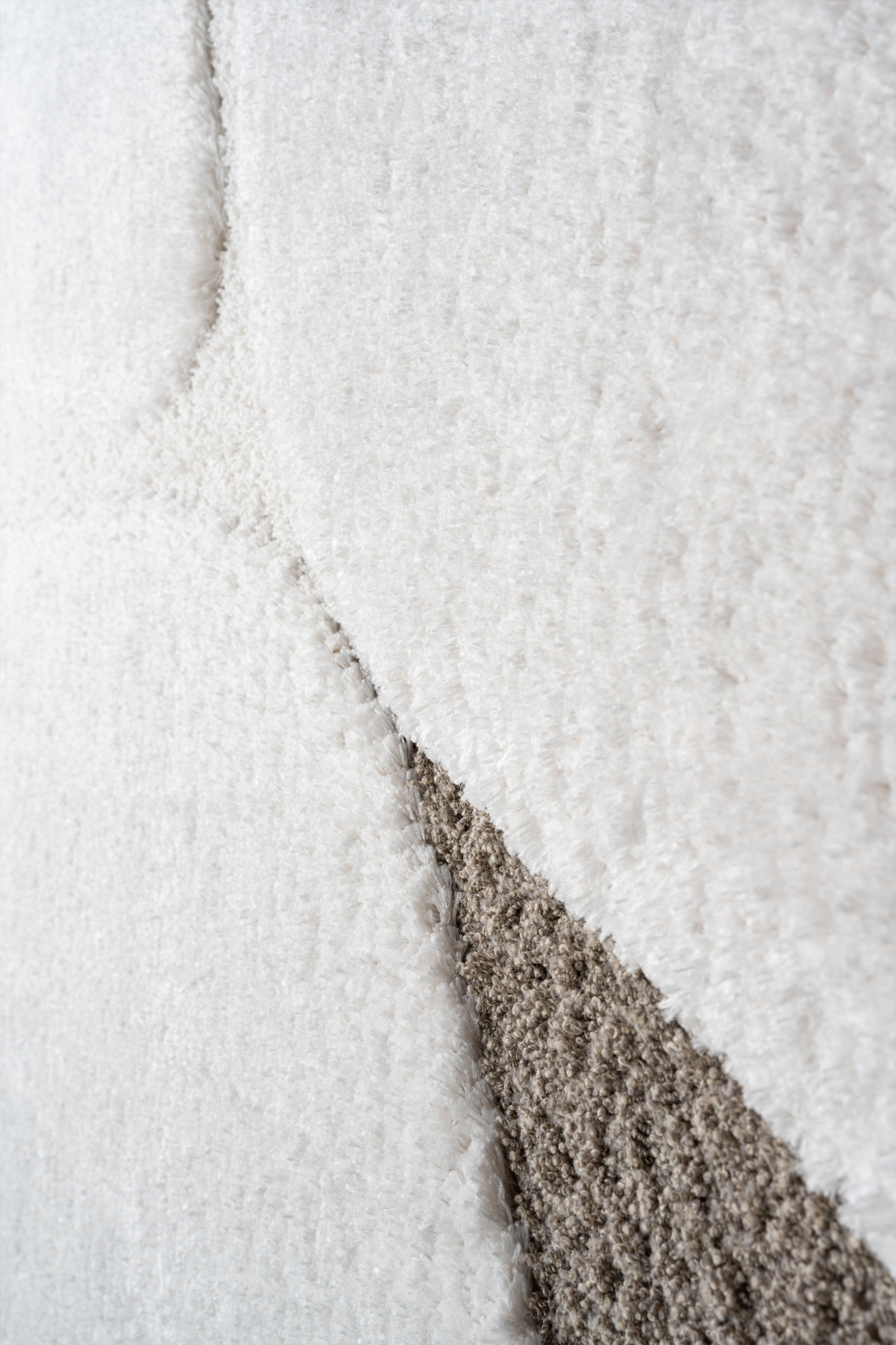 Bring an artistic, organic touch to your space with this uniquely shaped rug, designed with soft off-white sections that flow together like sculpted stone formations. A warm taupe accent cuts through the center, adding contrast and visual depth to its abstract form. The plush, high-pile texture offers a cozy, soft feel underfoot, while the freeform silhouette makes it a standout piece for modern, contemporary, and creative interiors. Its smooth curves and layered tones create a calming yet expressive focal point that enhances your room with effortless style.