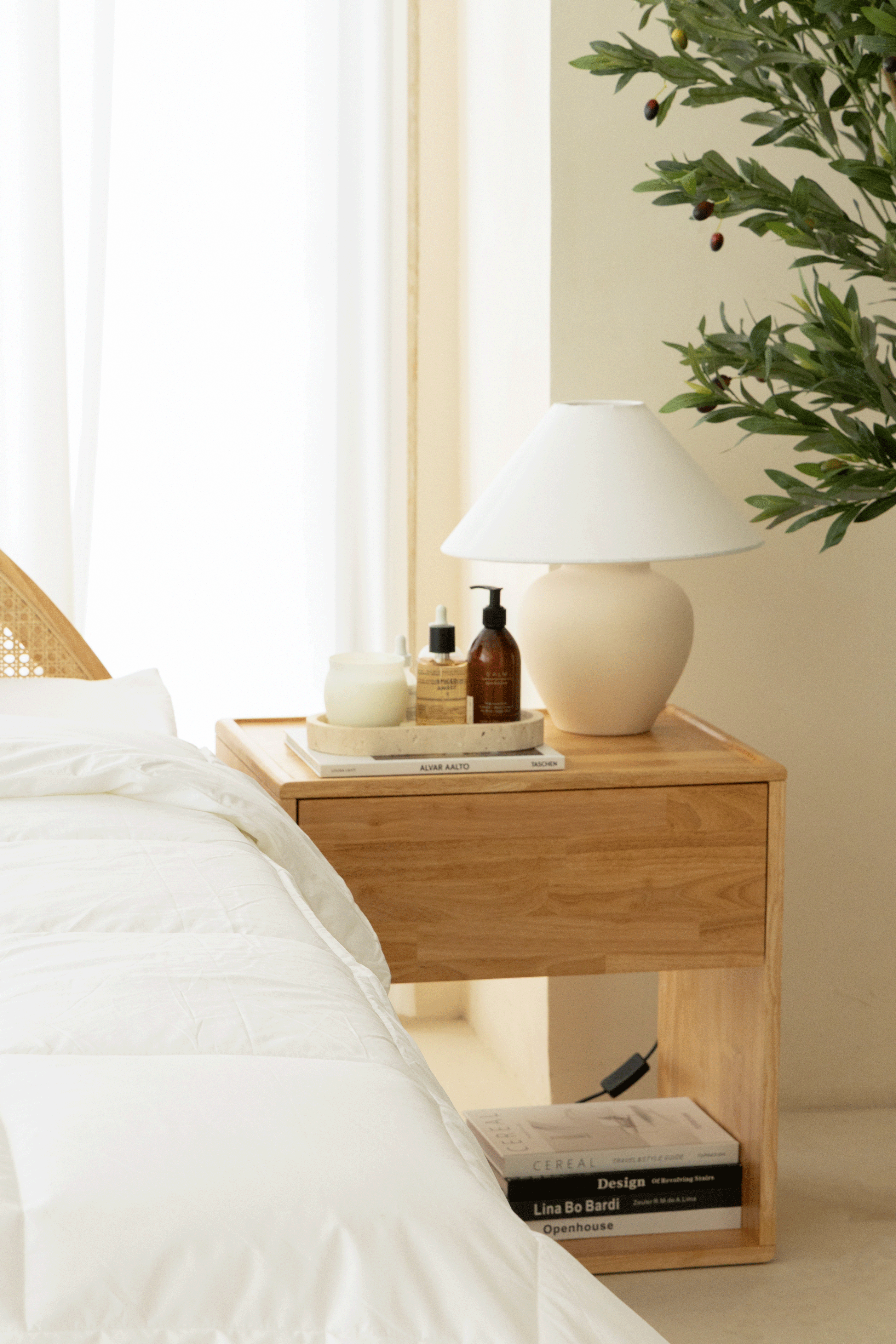 This Bedside Table combines functionality with minimalist charm, making it a perfect fit for modern interiors. Crafted from high-quality rubber veneer, this table showcases a natural light wood finish with smooth grains, lending a warm, organic touch to any bedroom decor. Its sleek rectangular shape features clean edges and a practical design, complemented by a spacious drawer equipped with soft-close slides for seamless use. Beneath the drawer, an open shelf provides additional space for books or decor items. With durable construction and a timeless style, the Reika bedside table is an elegant addition that blends aesthetics and utility effortlessly.