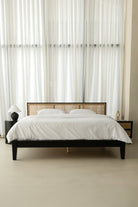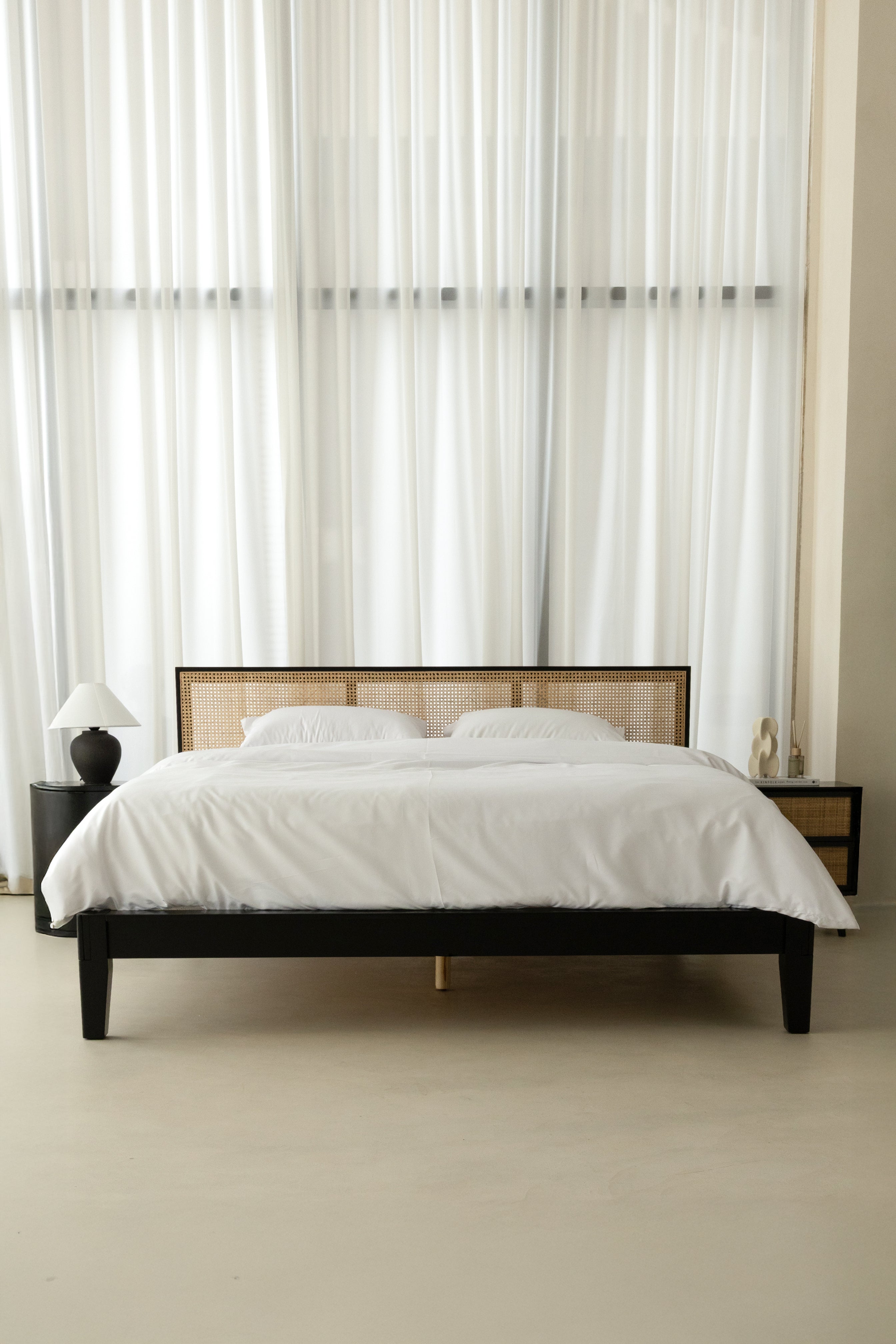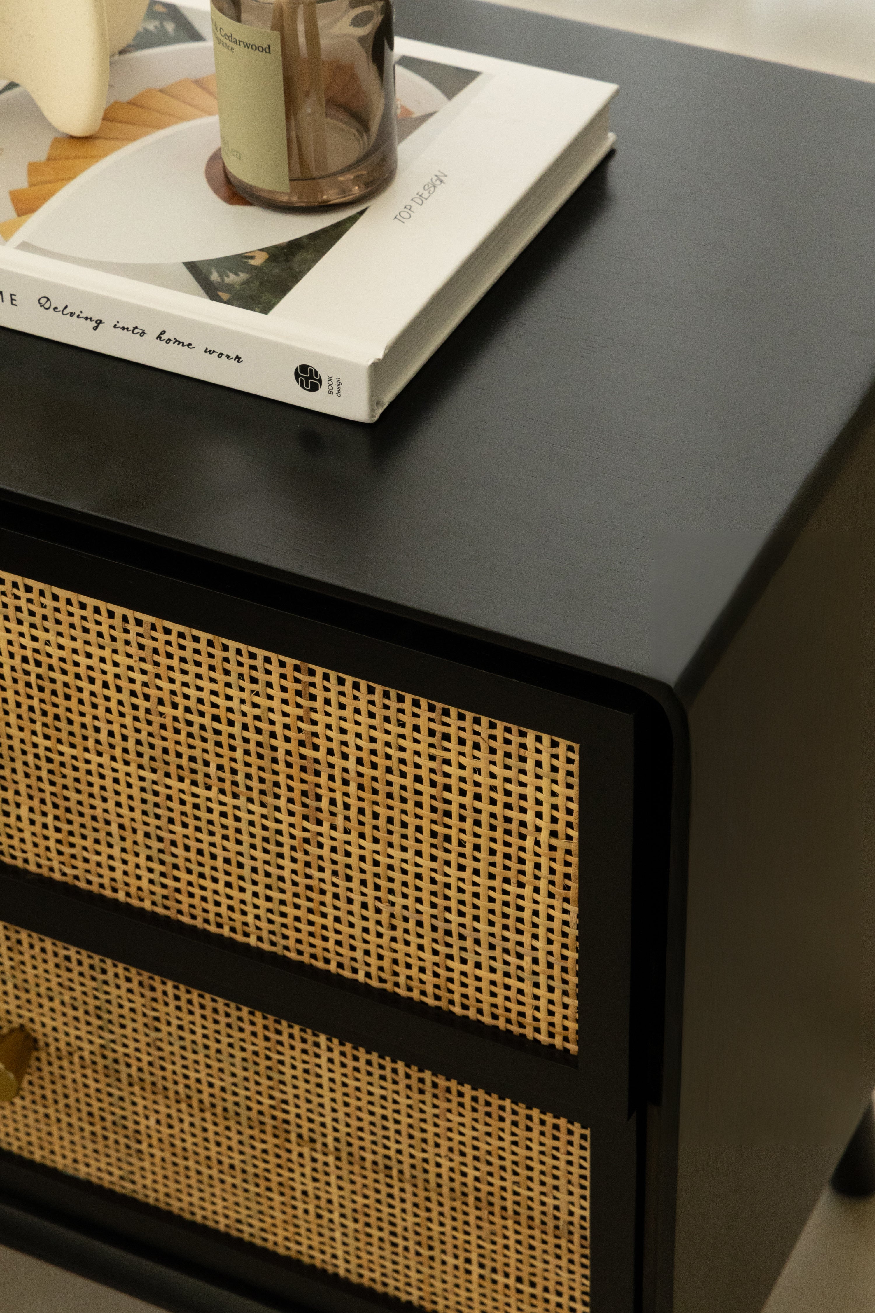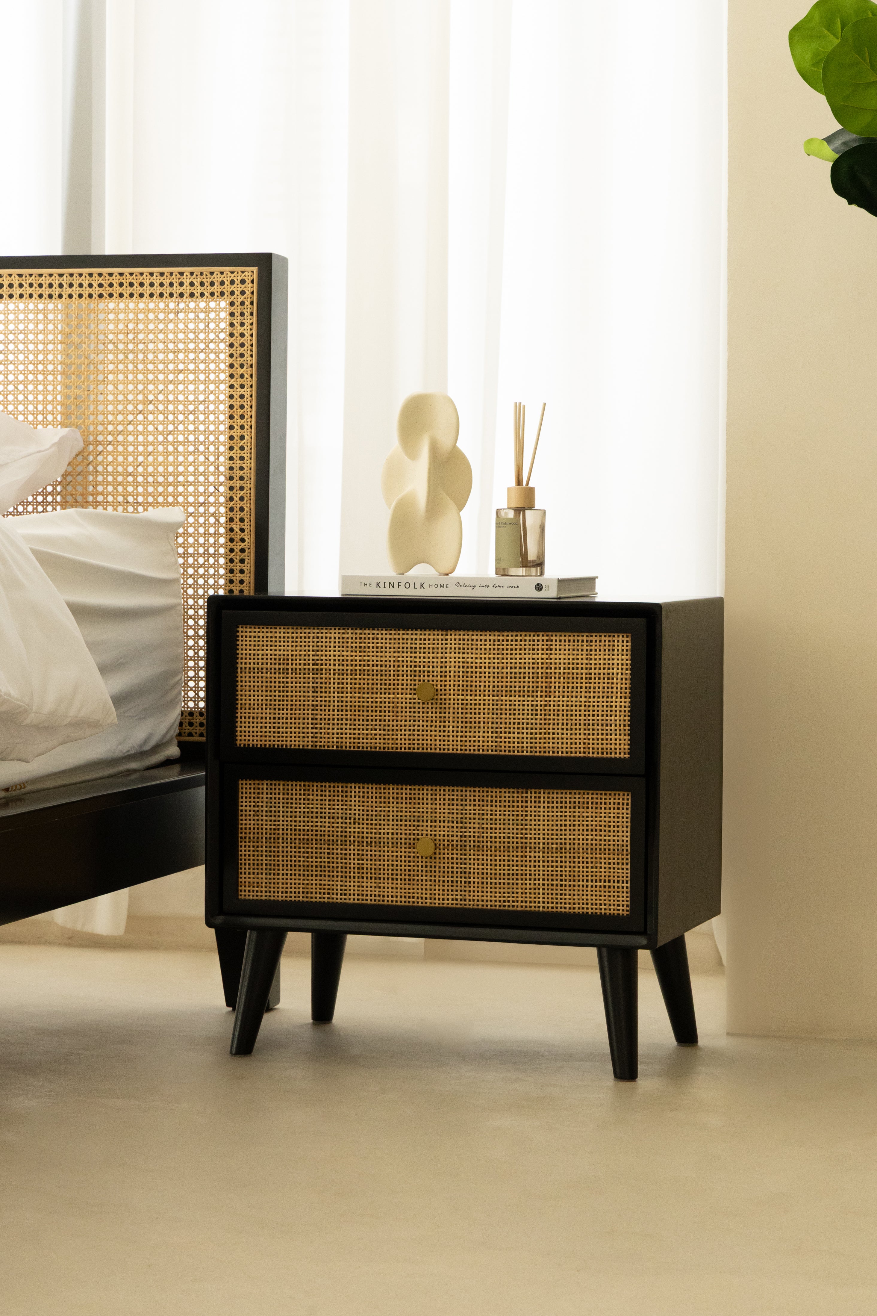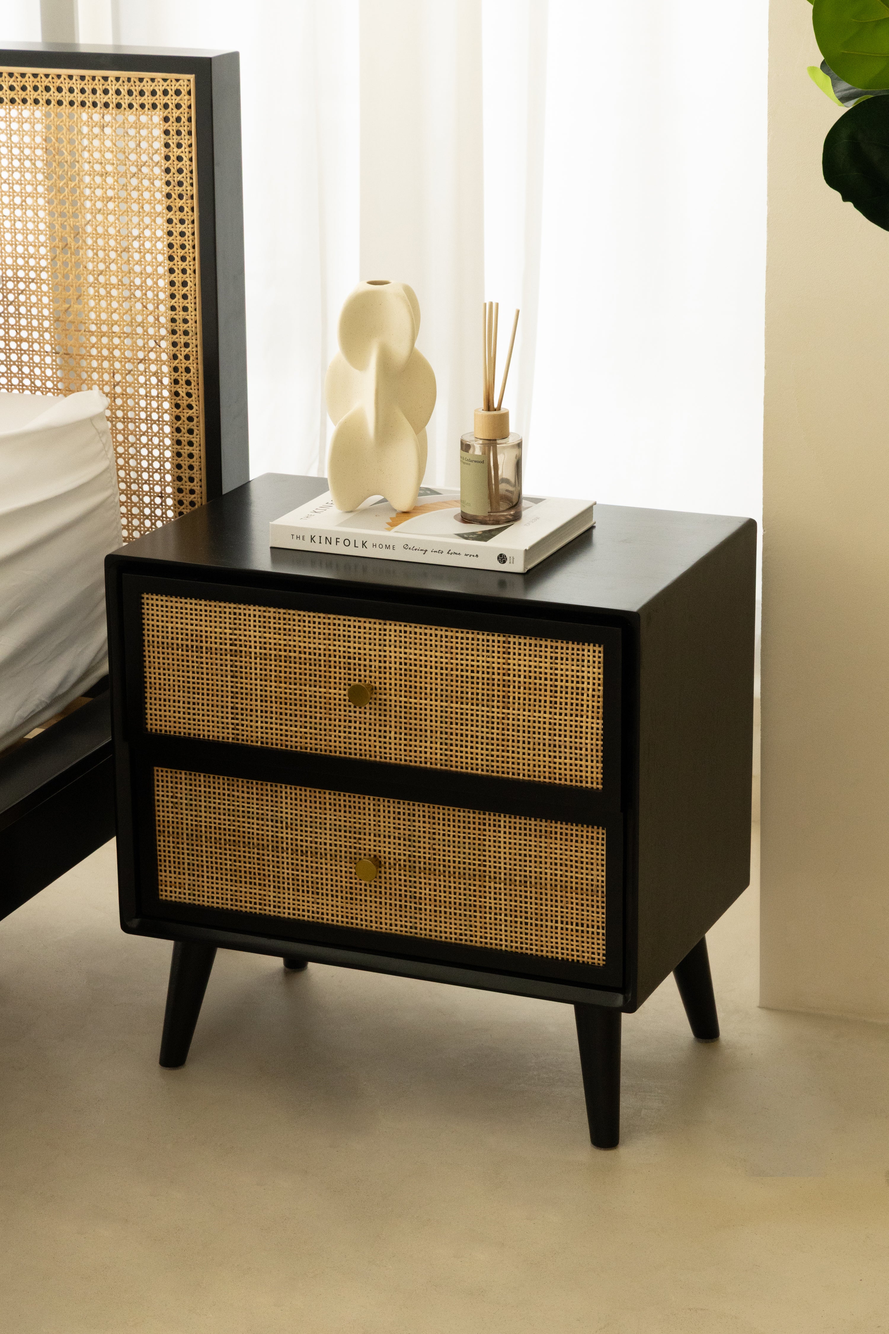 A seamless blend of modern and natural design, this bedside table features a sturdy black wood frame paired with natural rattan drawers for added texture and charm. Crafted from premium rubber wood and enhanced with MDF veneer, it offers durability and timeless style. The clean lines, sleek black finish, and elegant legs make it a versatile choice for any contemporary or bohemian-inspired bedroom.