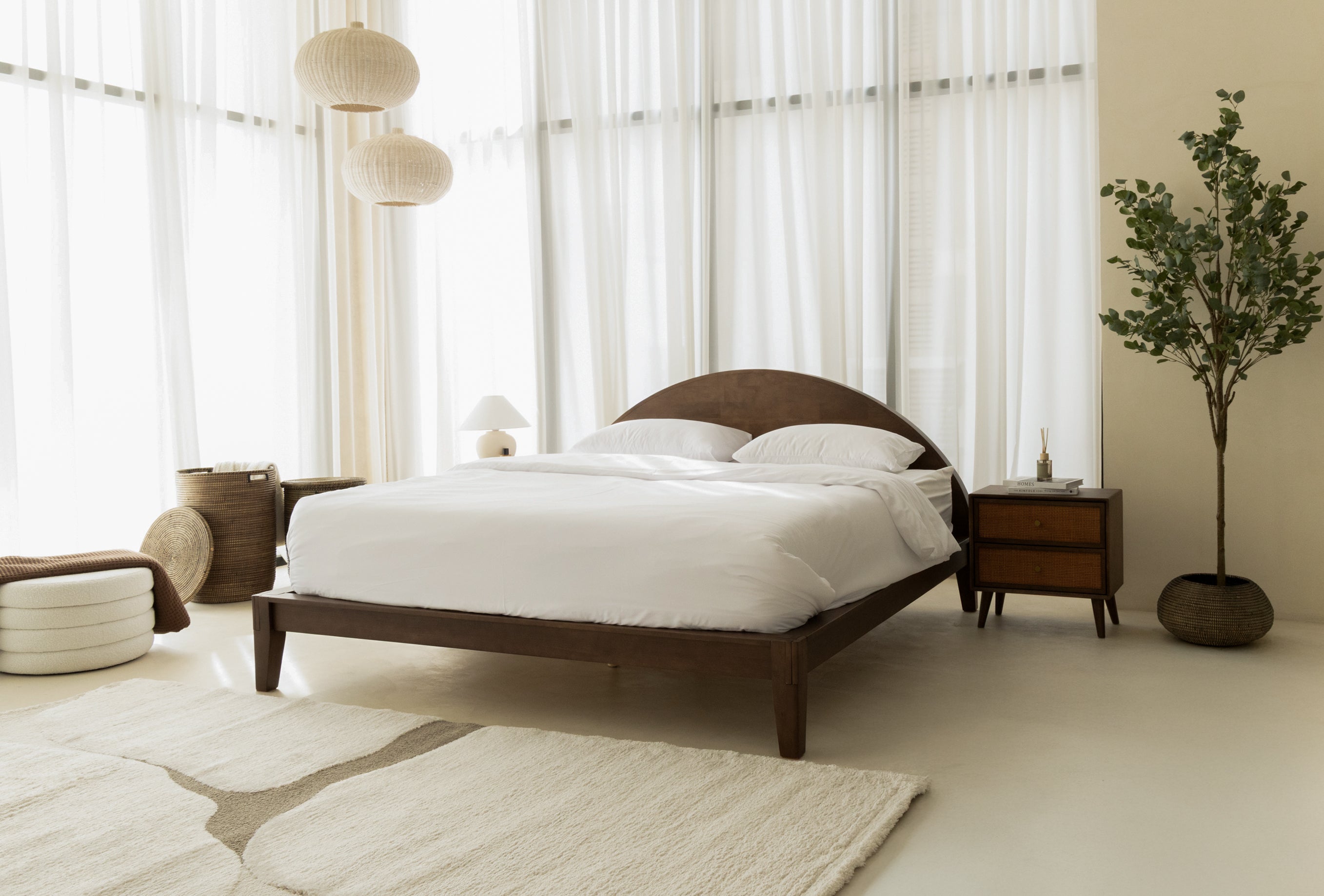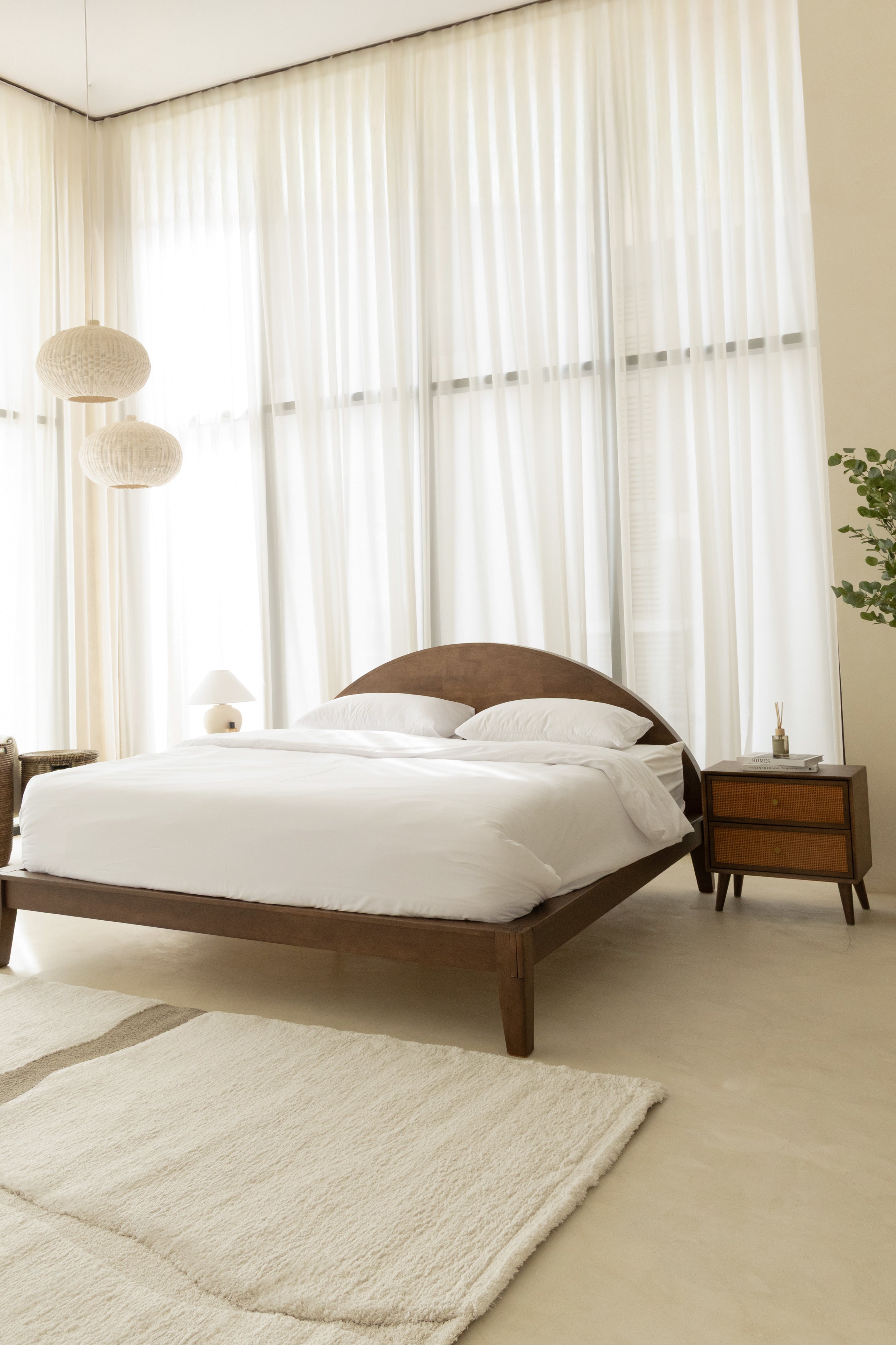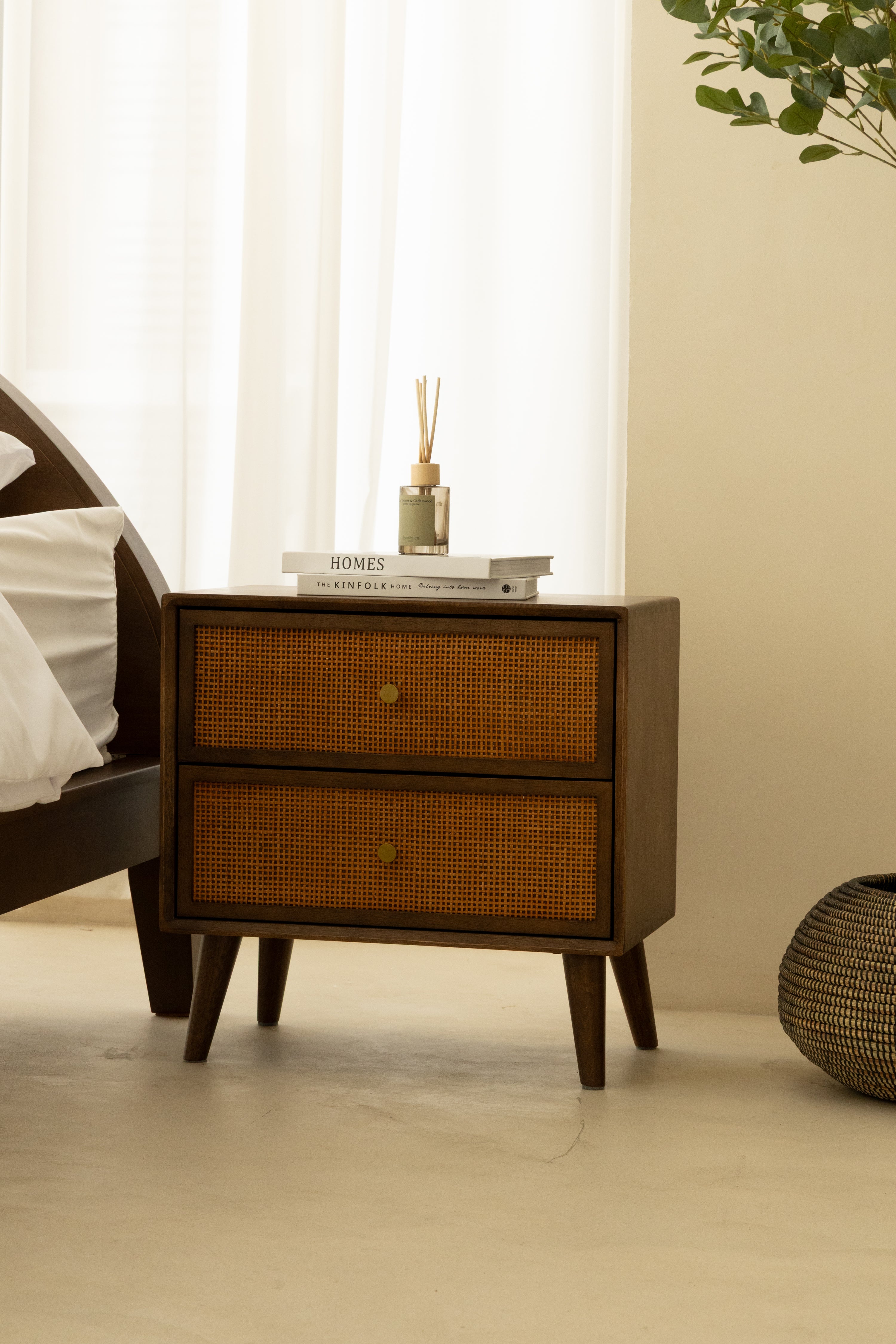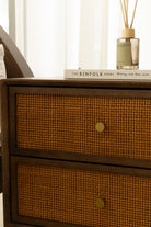 Crafted with meticulous attention to detail, this bedside table features a sleek dark wood finish paired with rattan-fronted drawers for a blend of natural texture and timeless elegance. Its tapered legs lend a mid-century touch, while the brass hardware adds a subtle gleam. Built from durable rubber wood with an E2-grade rubber veneer and a sturdy plywood-MDF drawer, it offers both style and practicality, complementing any sophisticated bedroom décor.