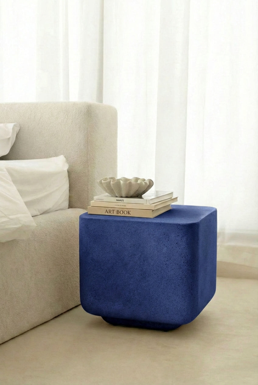 A rich cobalt blue microconcrete finish introduces bold depth and artistic character into your space, while the rounded cube silhouette and smooth matte texture create a sculptural focal point that elevates your living room or bedroom with modern sophistication, confident color, and refined contemporary elegance.