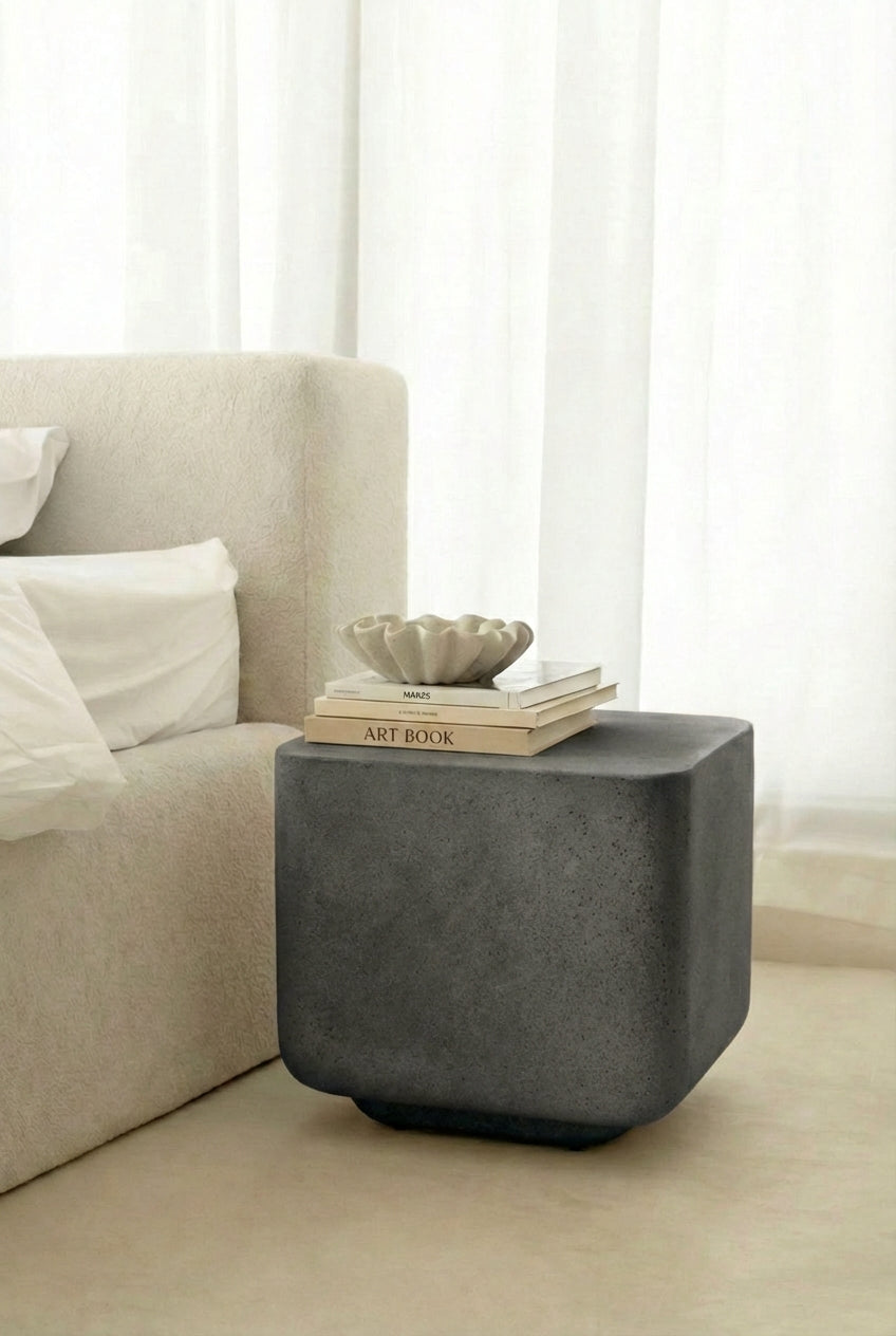 A deep midnight grey microconcrete finish brings bold sophistication to your living space, while the softly rounded cube silhouette and subtle textured surface create a refined sculptural presence beside your sofa or bed, allowing you to elevate your corner with modern depth, grounded elegance, and minimalist character.