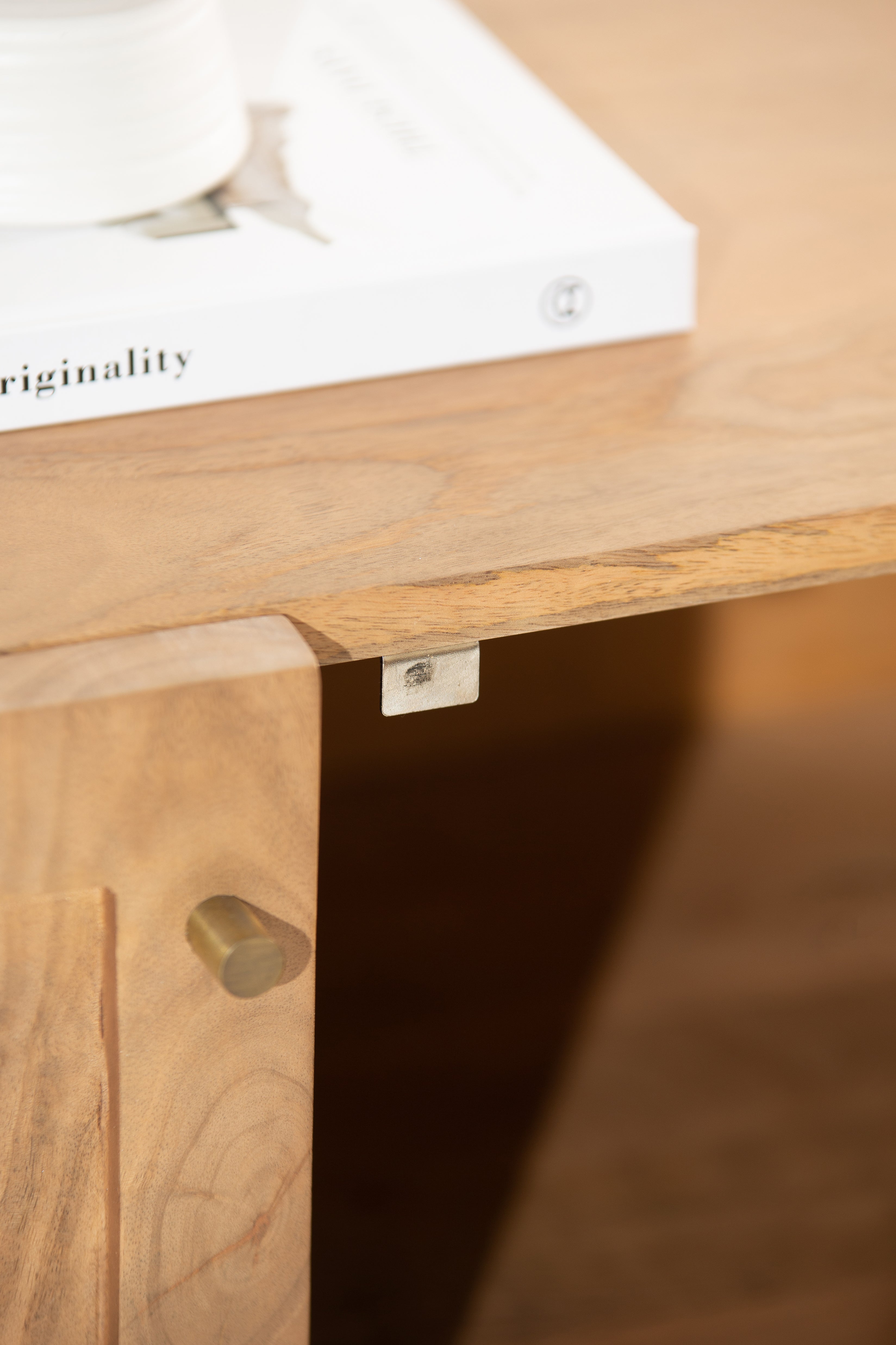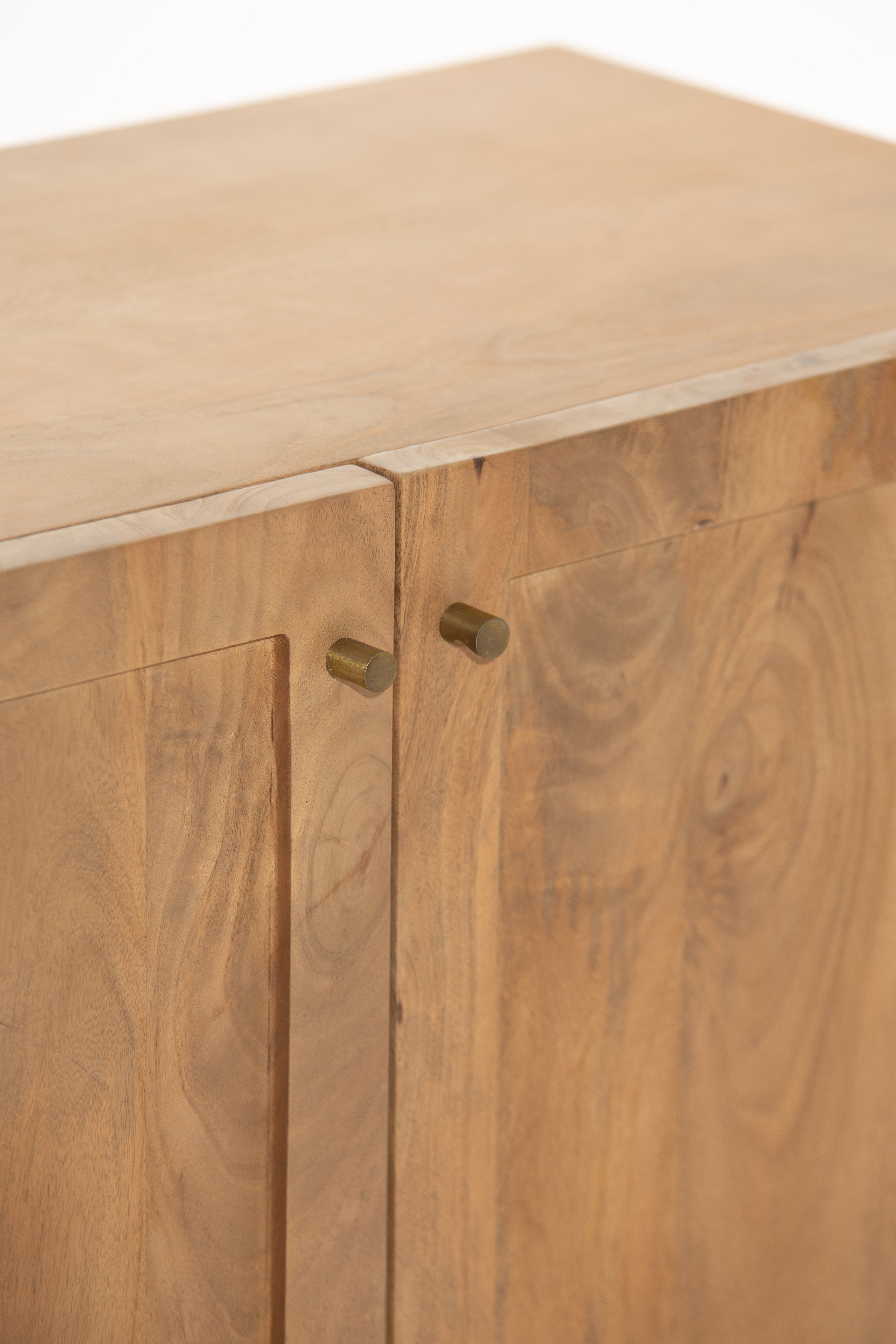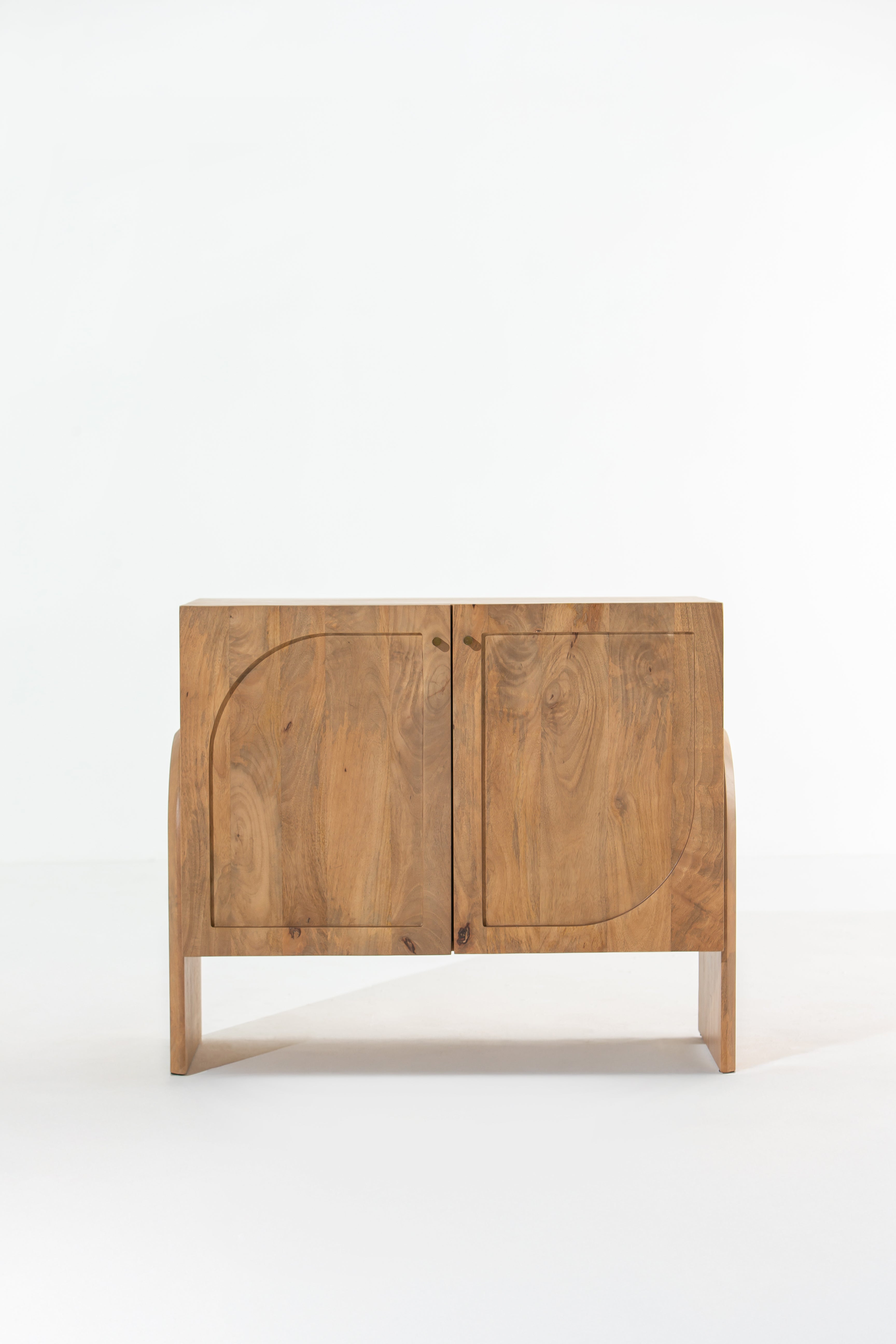 Beautifully crafted from solid Mindi wood, this 2-Door Wooden Sideboard blends timeless craftsmanship with sculptural modern design. The piece features arched inlay detailing on the front panels, bringing subtle visual rhythm to its clean-lined form. Perfectly sized for compact spaces, this sideboard offers versatile storage for a hallway, entryway, or living area. Behind its dual cabinet doors lies ample space to stow away essentials—everything from dinnerware and glassware to books and accessories—while its warm, natural finish highlights the rich grain of the wood.