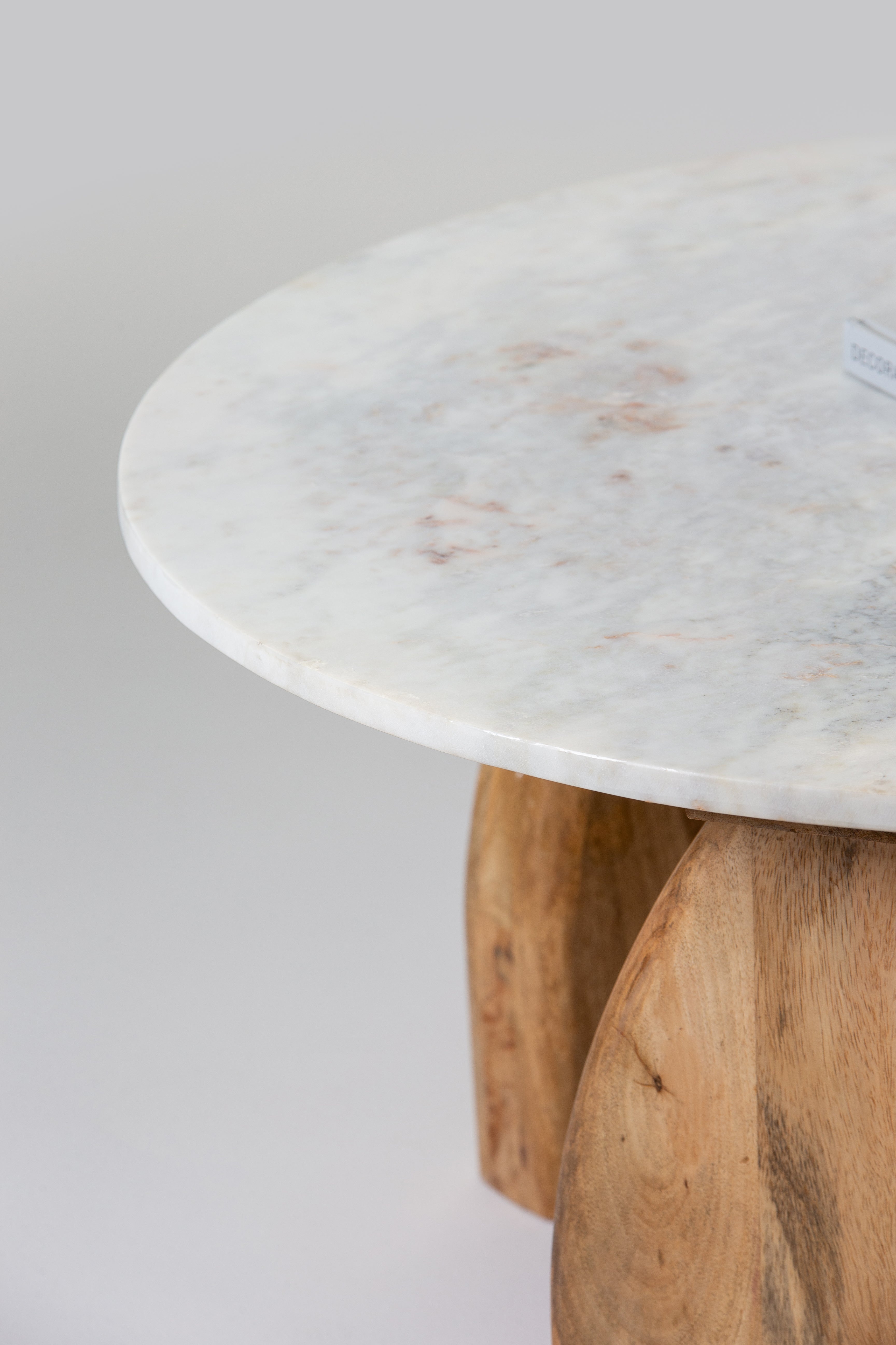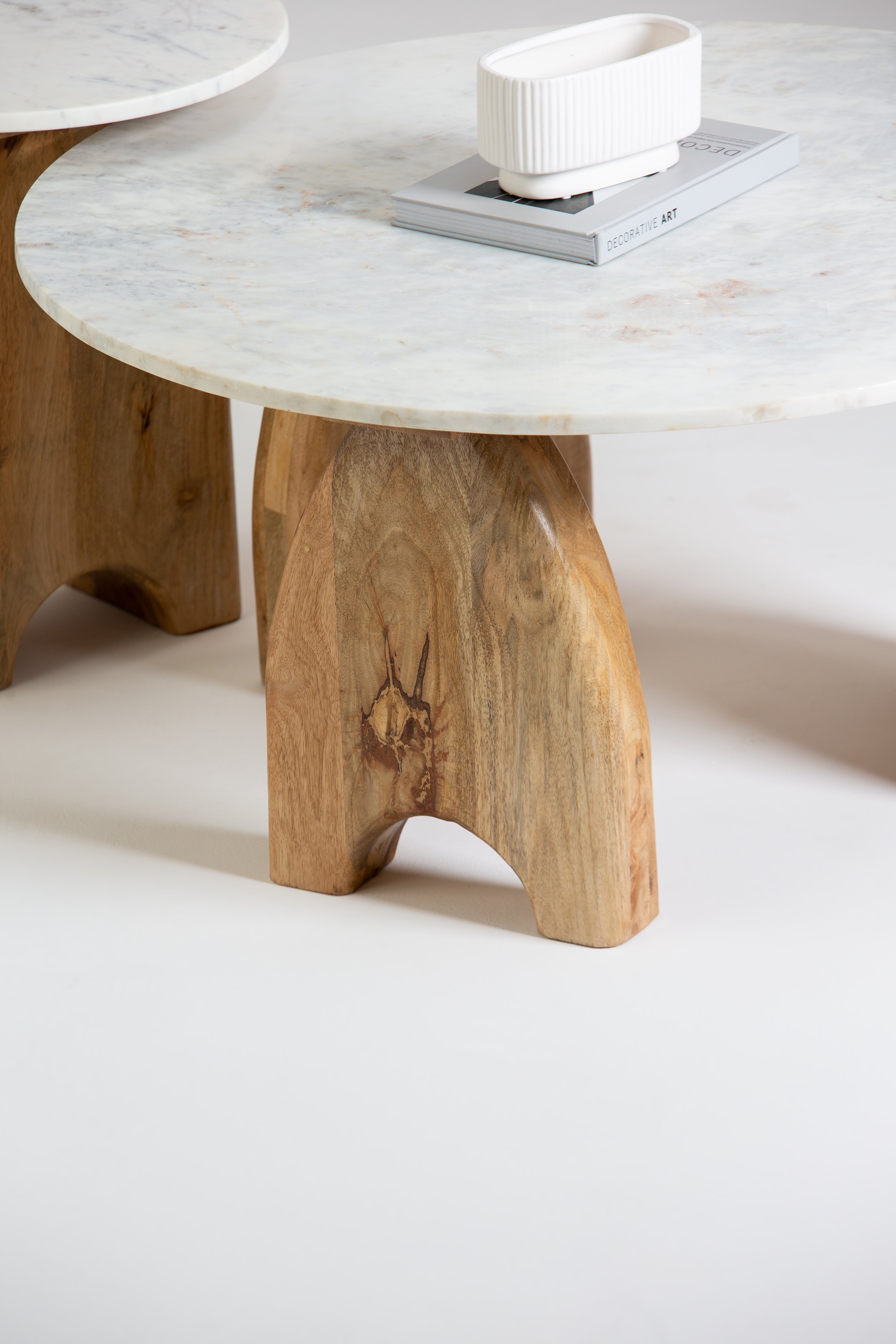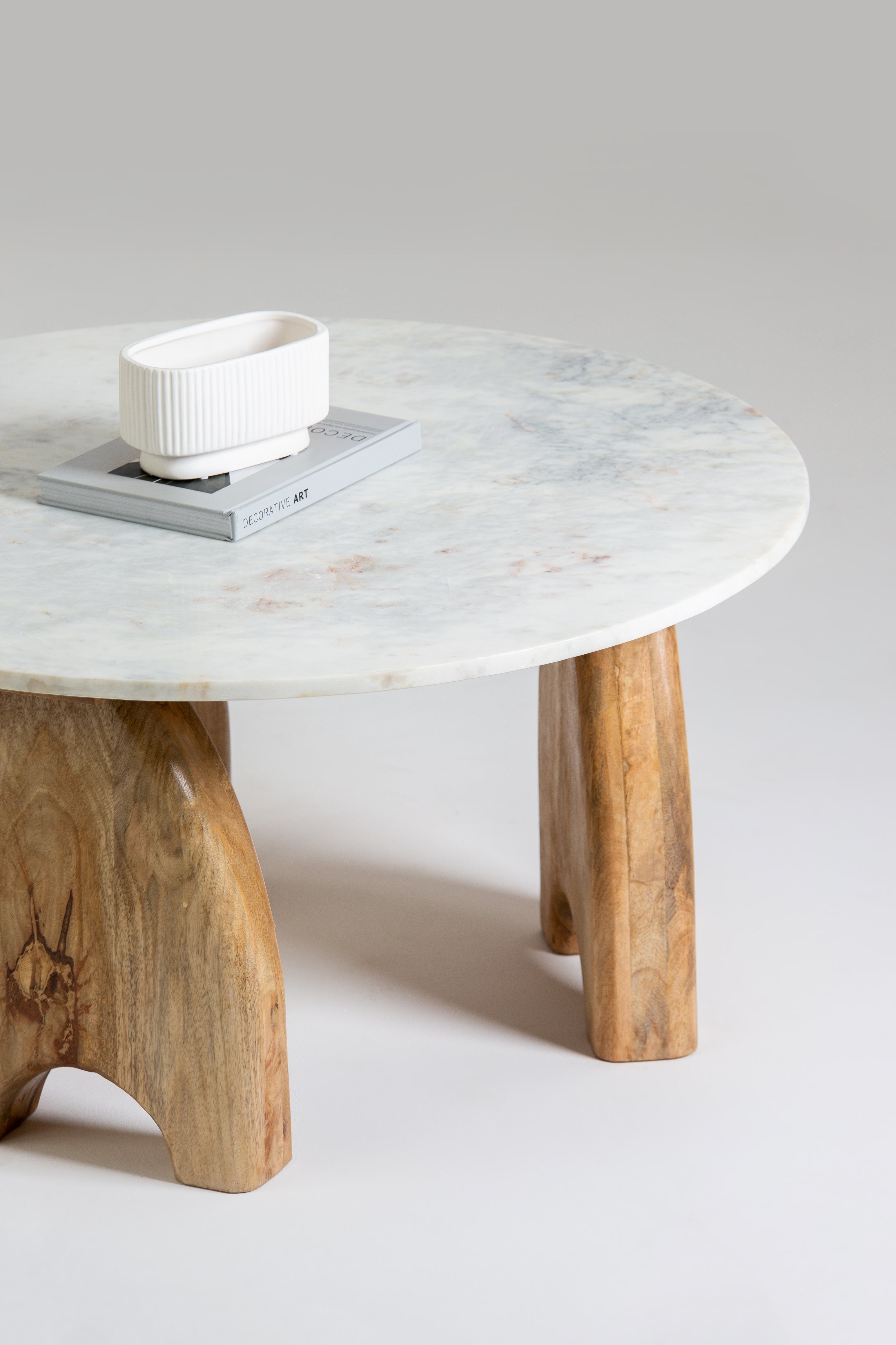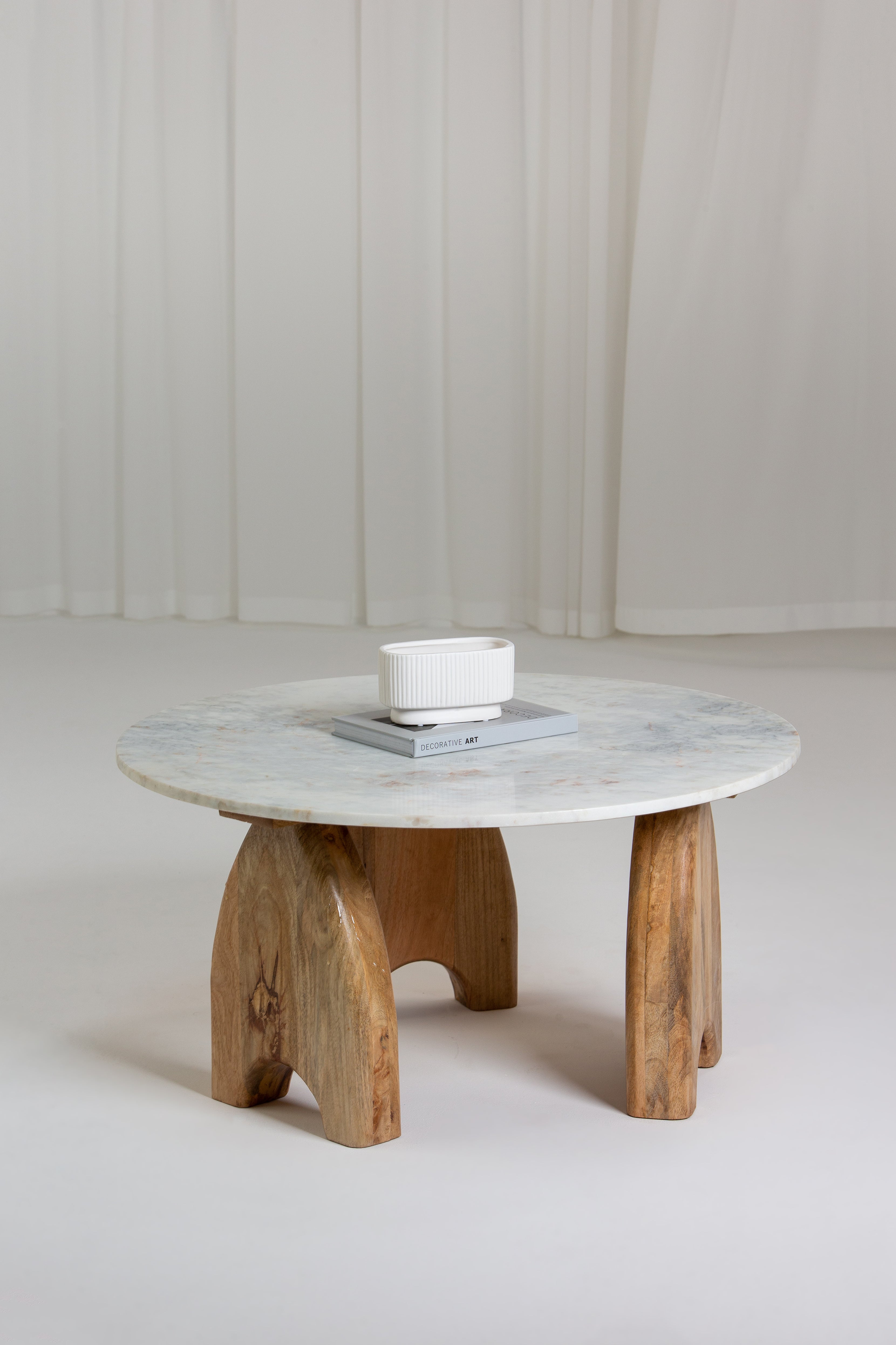 Elevate your living space with this striking coffee table, featuring a polished white marble top that exudes sophistication. The robust mango wood base showcases a natural grain finish, with sculpted arched legs that blend strength and artistic elegance. Perfect for contemporary or rustic interiors, this table offers a harmonious mix of textures and organic appeal, making it an ideal centerpiece for your home.