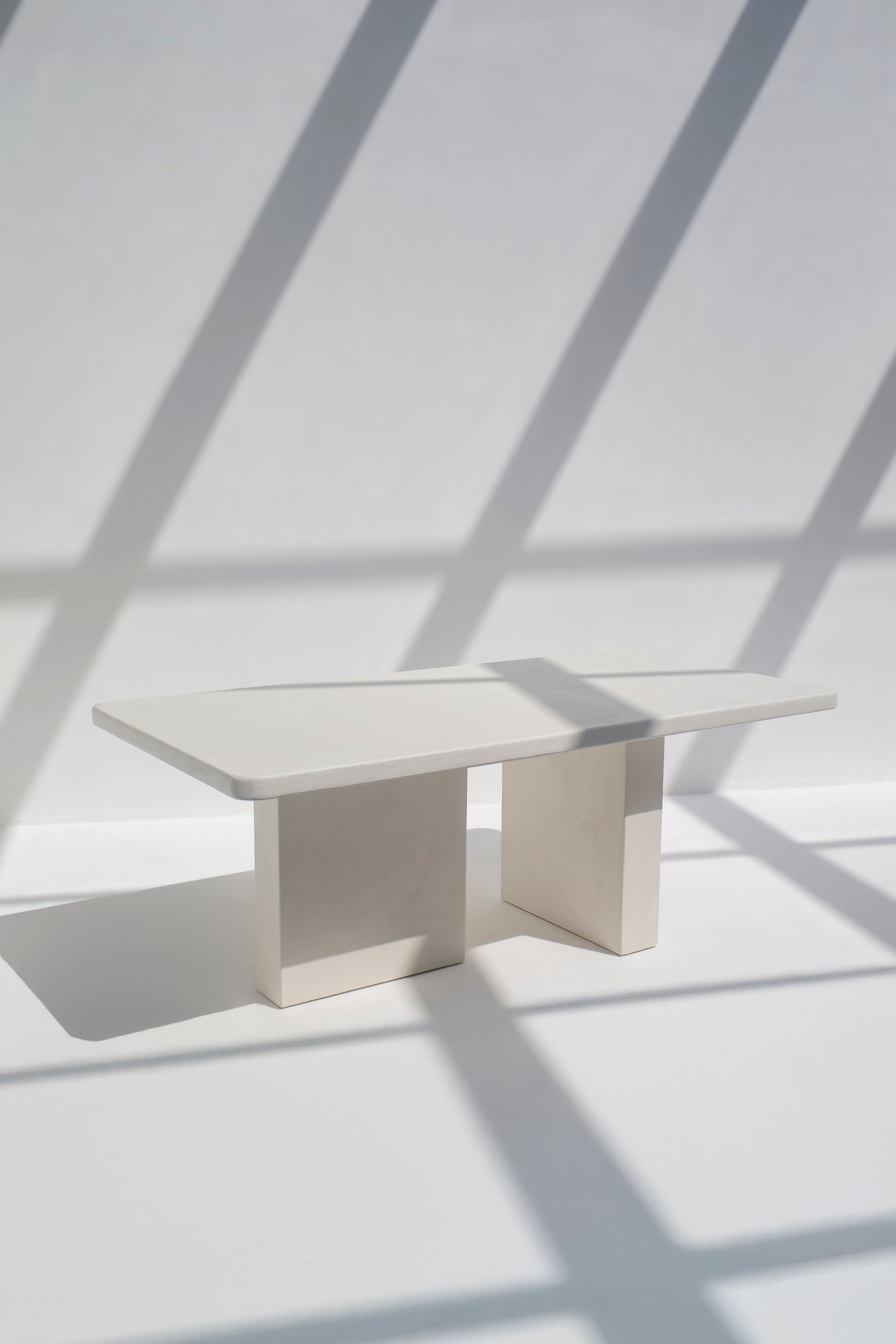 This dining table is a minimalist masterpiece, coated in a micro concrete finish that exudes contemporary elegance. The soft, neutral beige hue complements any modern interior, while the robust, rounded legs provide both stability and a touch of sculptural artistry. Designed to blend seamlessly with any decor, its sleek surface offers a refined space for dining and entertaining. Ideal for those who appreciate clean lines and understated luxury, this table is more than just furniture it's a statement of sophisticated simplicity.