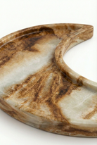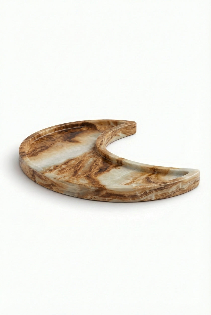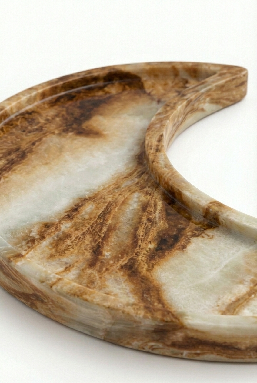 Carved from luminous honey onyx, this crescent shaped tray brings a soft glow and organic movement to styled surfaces. The natural layers of amber, cream, and caramel tones create a refined focal point for candles, jewelry, or curated décor, allowing your space to feel serene, intentional, and elevated through natural stone artistry.
