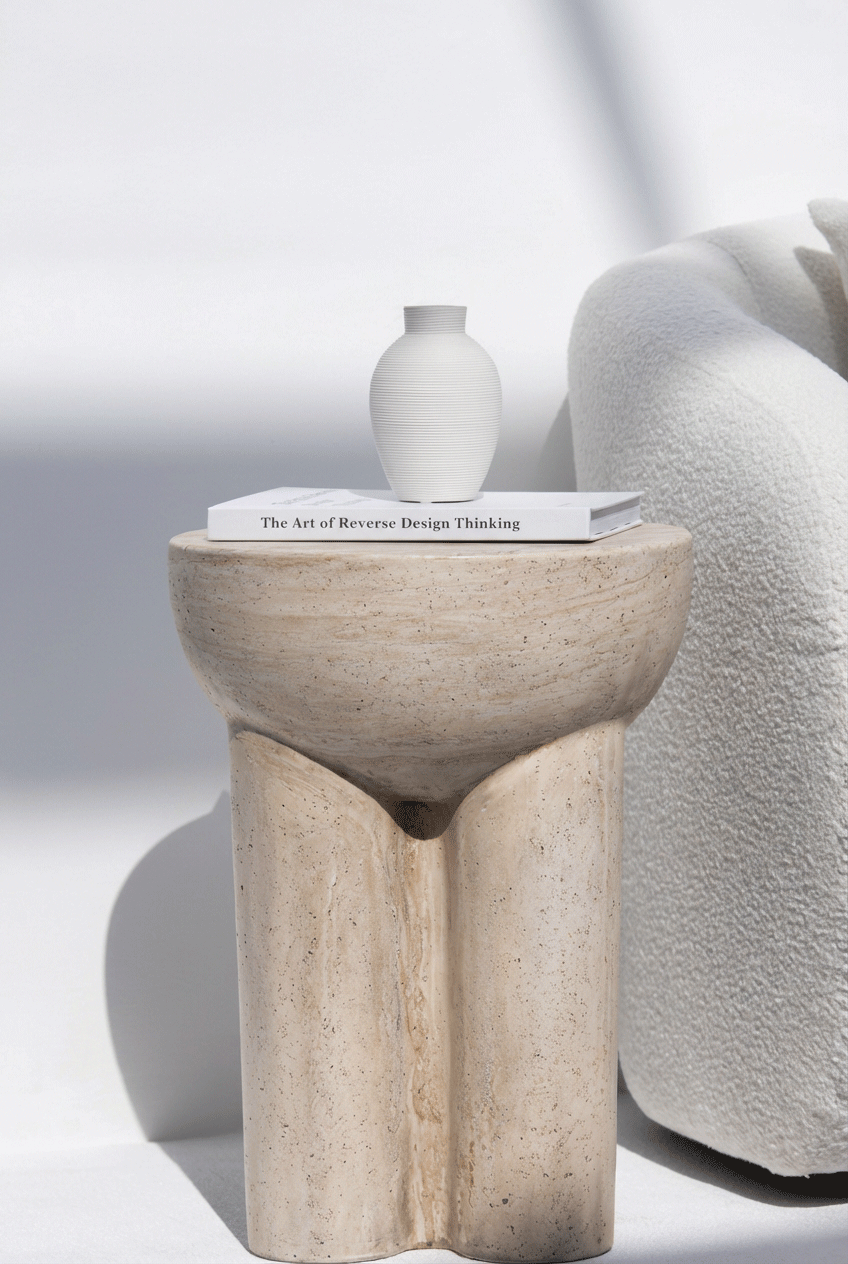 Exemplifying minimalist elegance, this sculptural side table is crafted from premium Fiber Reinforced Concrete with a refined travertine finish that brings subtle texture and natural character to its contemporary form. A smooth, rounded top rests on three bold cylindrical legs, creating an architecturally inspired silhouette that blends seamlessly into modern or minimalist interiors. Durable and striking, its tactile surface offers both visual depth and a sturdy feel, making it a versatile accent for living spaces, bedrooms, or semi-outdoor areas. With its clean lines and timeless presence, this piece adds a touch of modern artistry while maintaining practicality and lasting appeal.