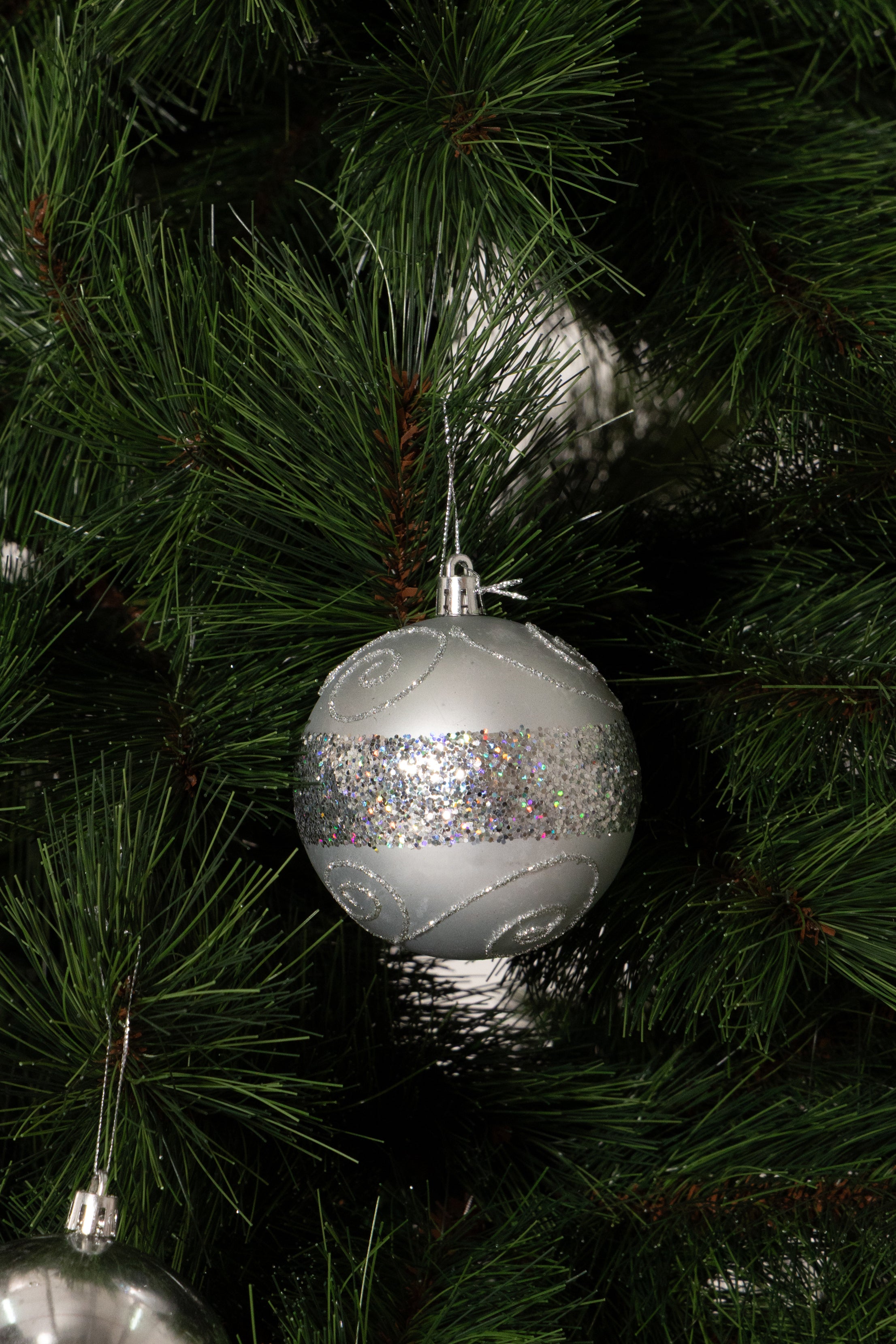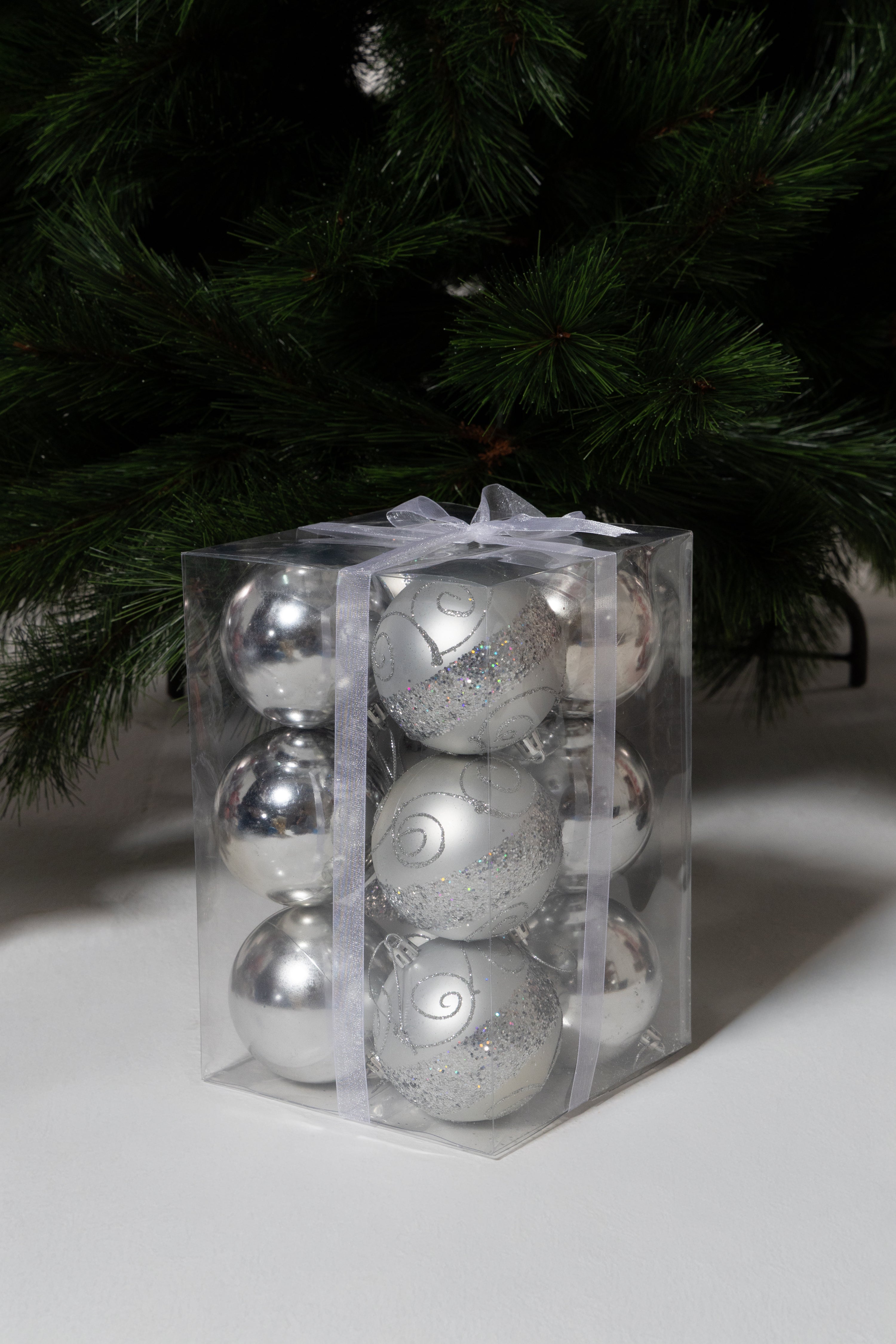 Bring a soft winter glow to your holiday decor with this elegant set of silver bauble ornaments. Each ornament features a mix of shiny and matte finishes that add beautiful depth and sparkle to your Christmas tree. The set includes twelve durable balls carefully arranged in a clear container, making them easy to store and perfect for gifting. Their timeless silver tone blends effortlessly with both classic and modern holiday decorations, adding a refined touch to any festive display.