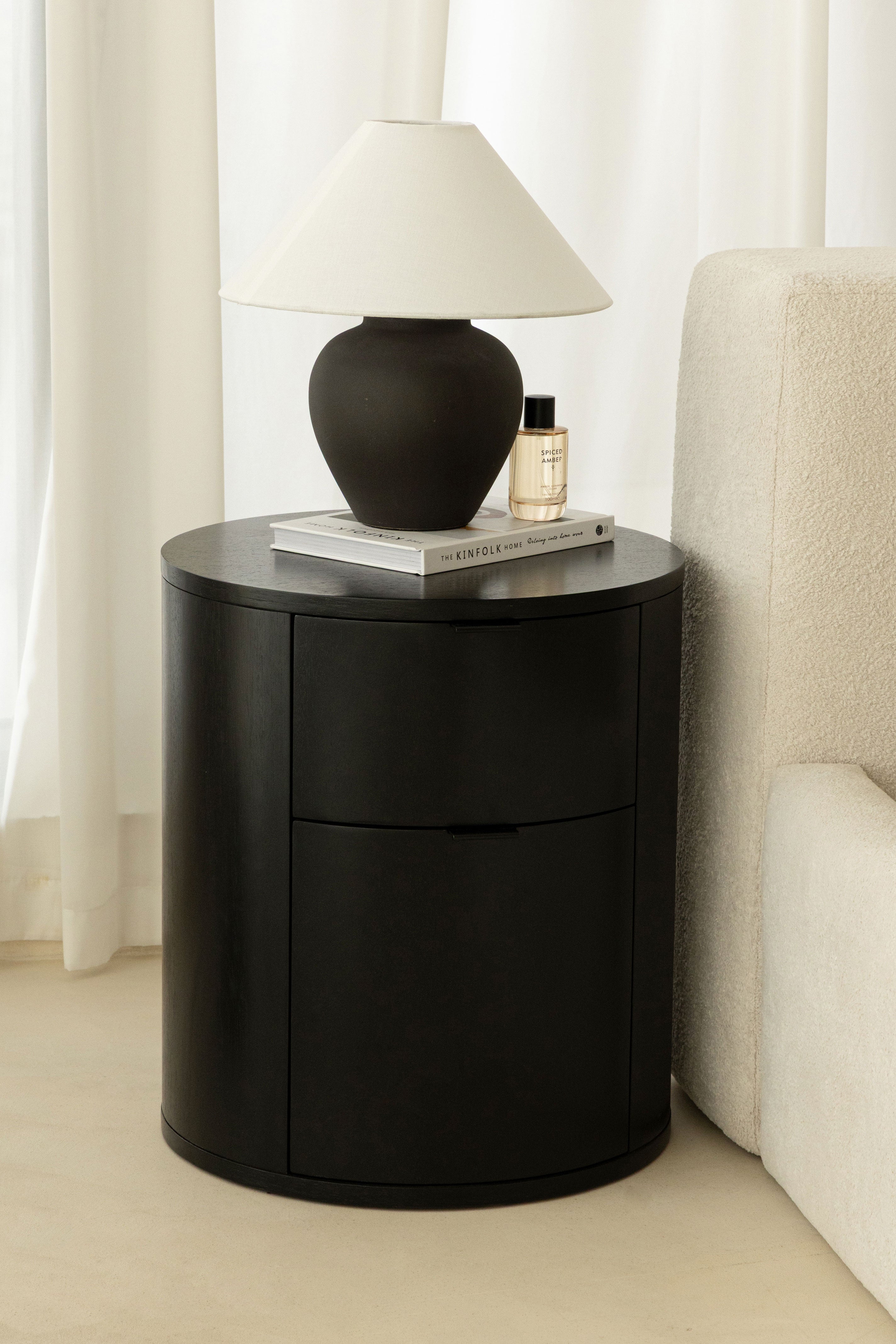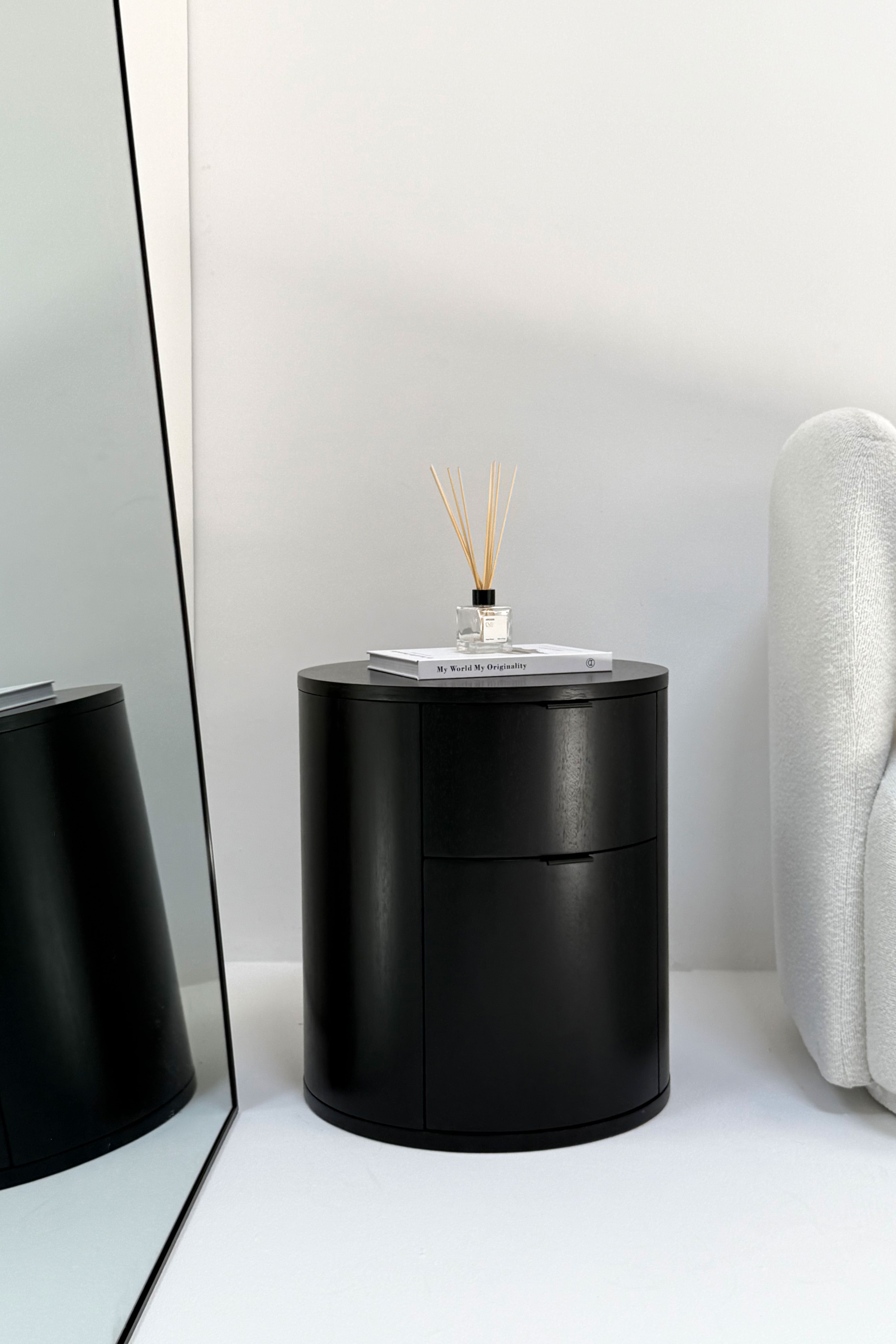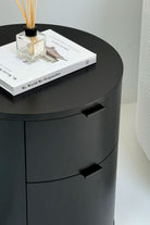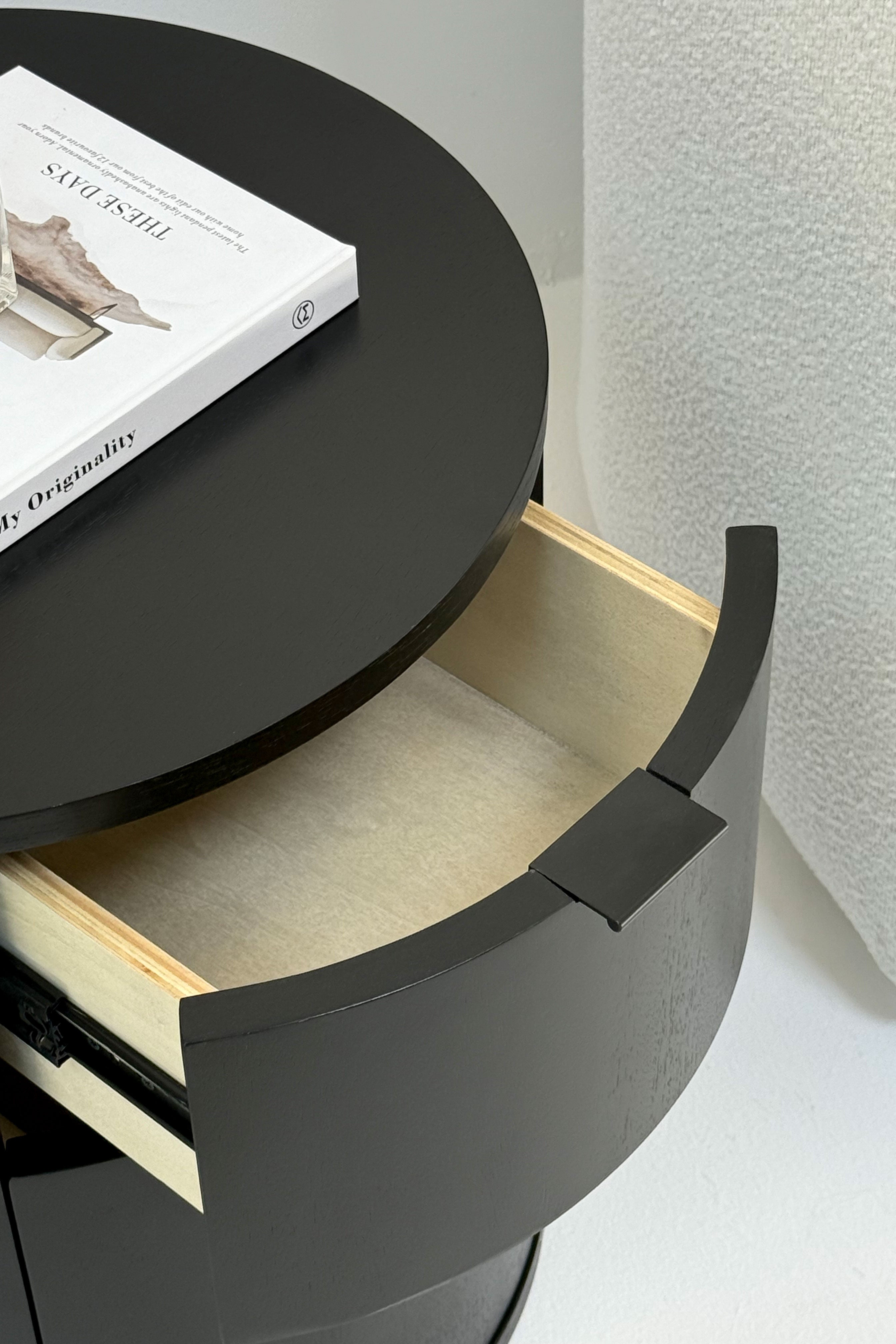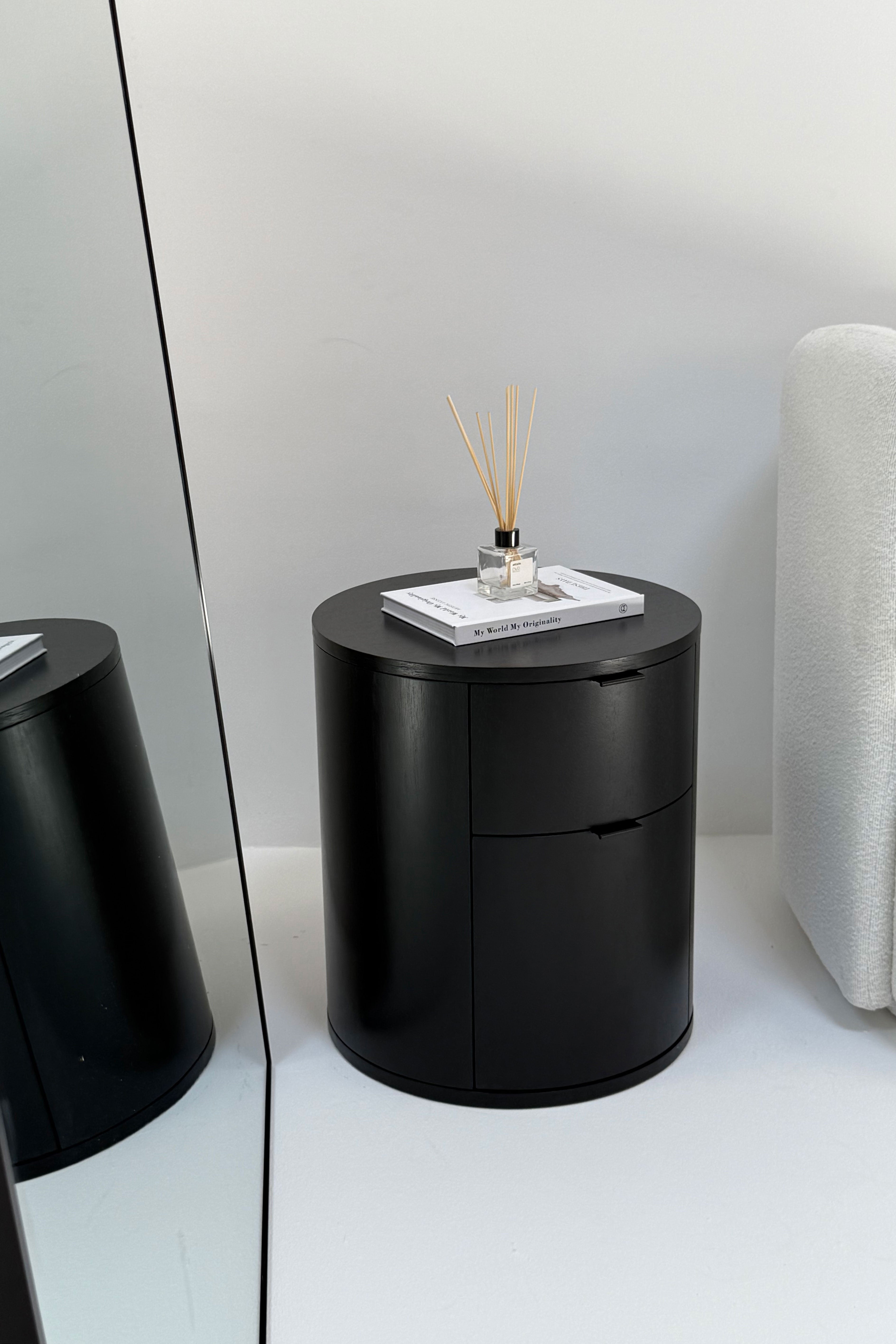 Step into a realm of sophisticated minimalism with the Sinem Black Wood Round Bedside Table, designed to be the focal point of your personal retreat. This chic, black wood nightstand boasts a striking round, drum-like silhouette with seamless, clean lines and a velvety matte black finish, exuding contemporary elegance. The image reveals its smooth, refined texture and its bold, monochromatic color. Featuring two cleverly concealed drawers with discreet pulls, this modern bedside cabinet offers generous storage solutions for all your bedside essentials, ensuring your bedroom remains organized and stylish. Its sleek and versatile design makes it an ideal compact round end table or side table for any space, from a contemporary urban apartment to a luxurious minimalist home. Infuse your interior design with this bold and functional furniture piece, perfectly tailored to complement your discerning taste and simplify your daily routine.