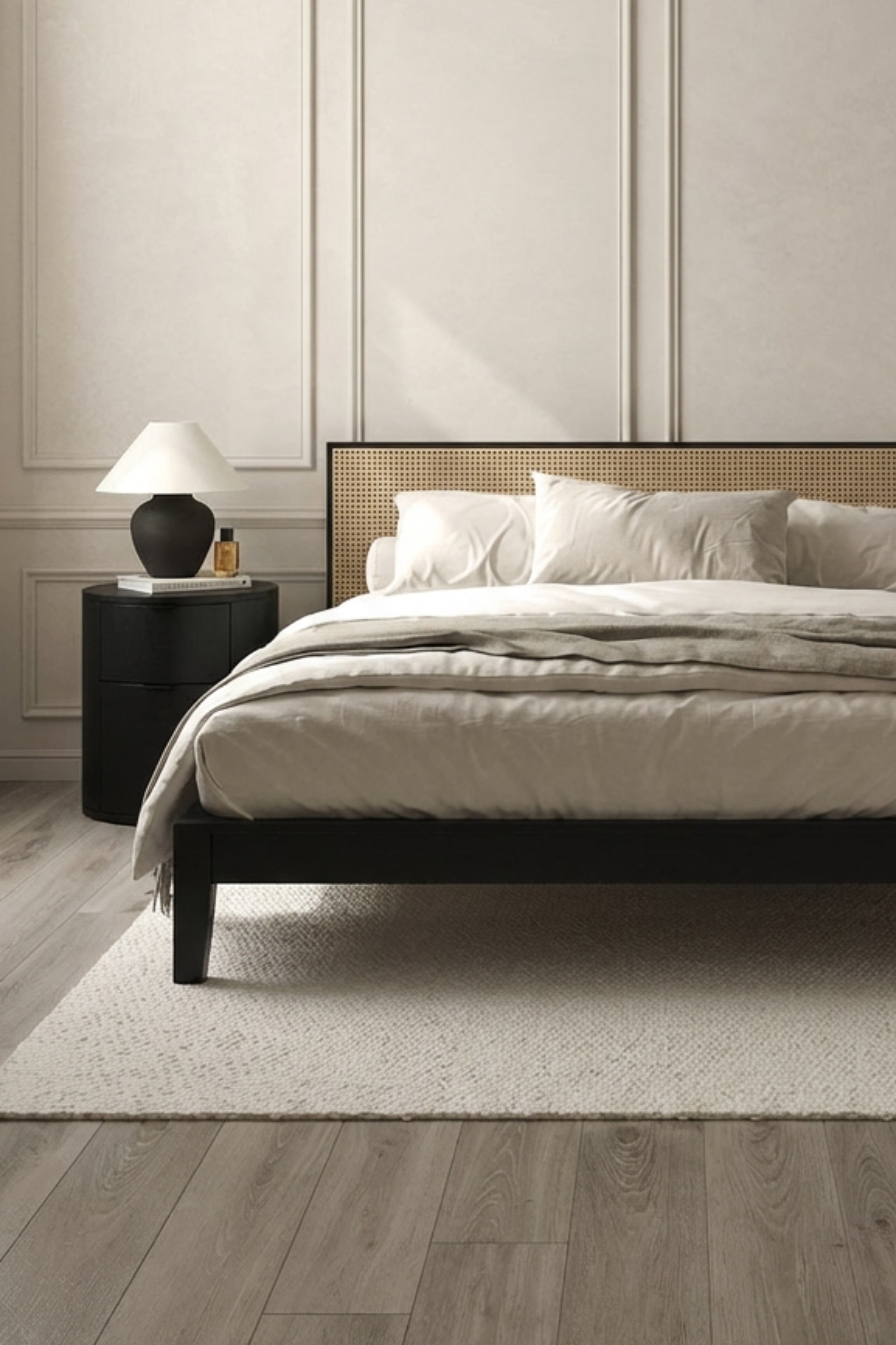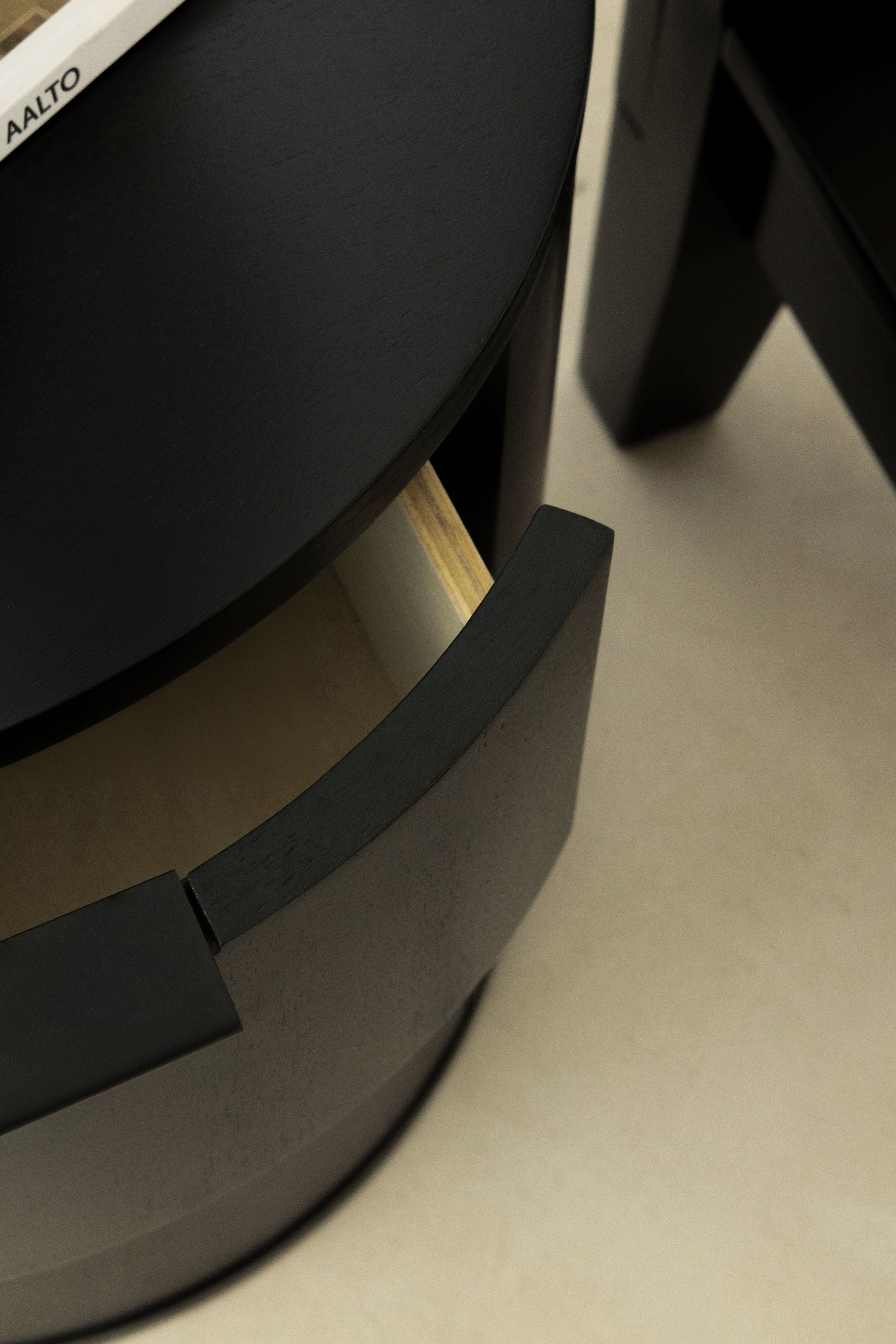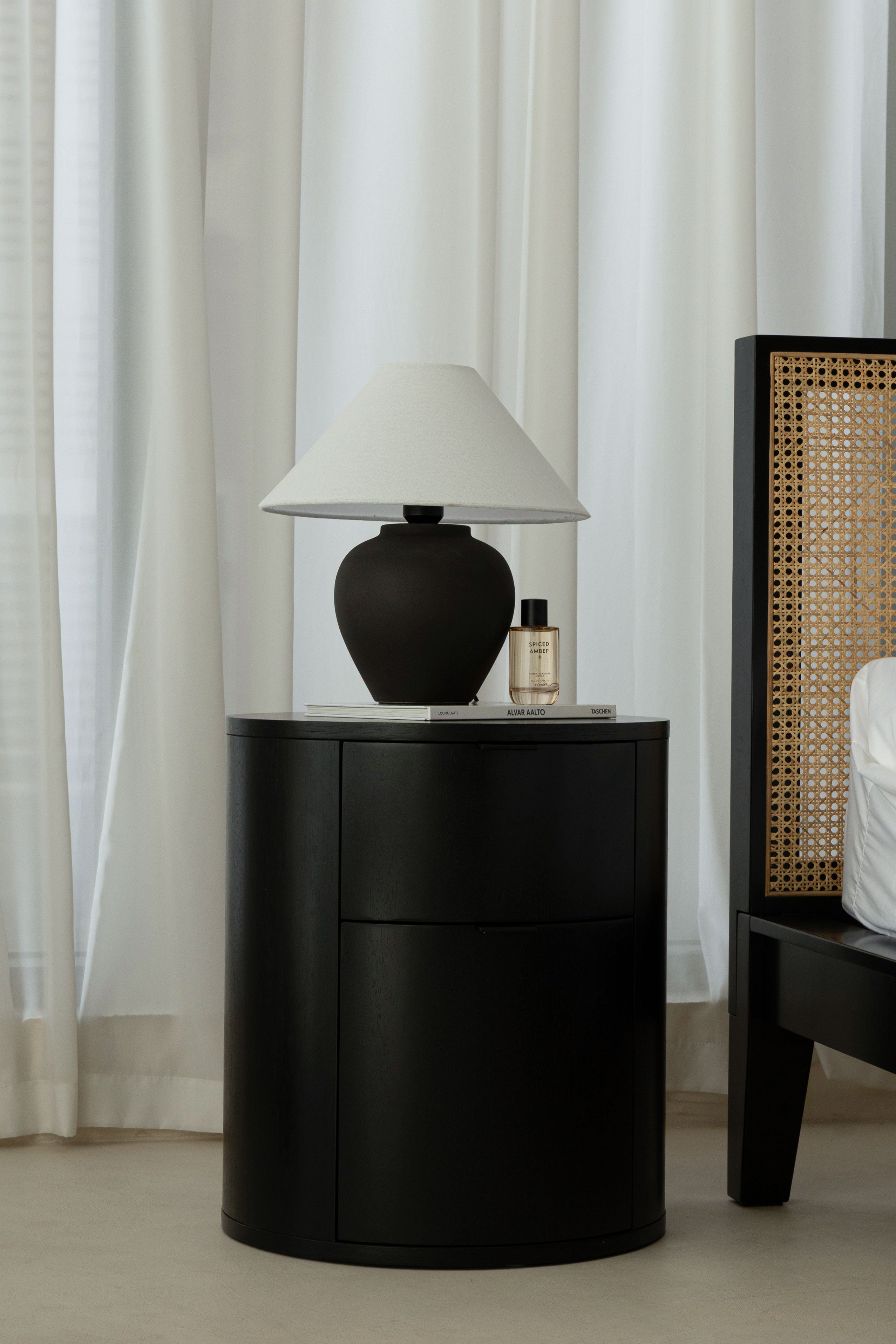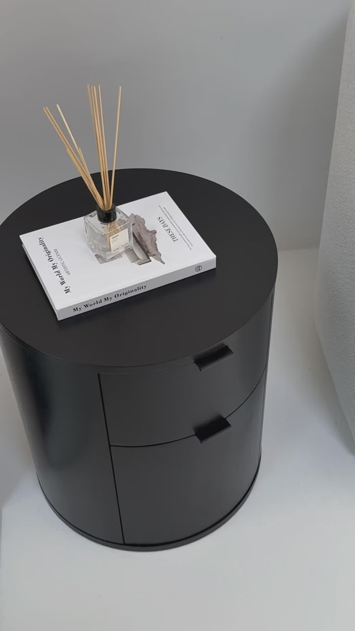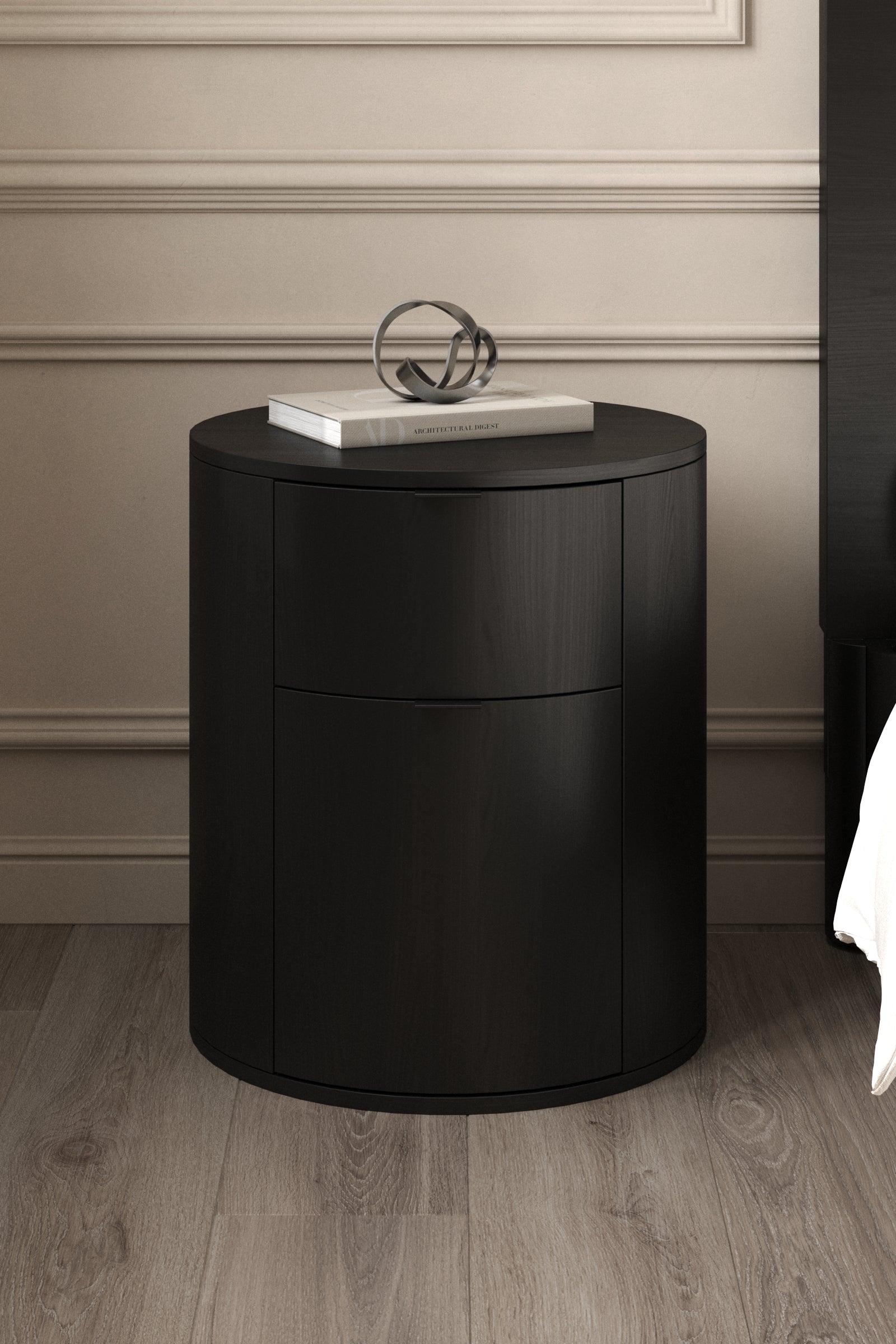 Step into a realm of sophisticated minimalism with the Sinem Black Wood Round Bedside Table, designed to be the focal point of your personal retreat. This chic, black wood nightstand boasts a striking round, drum-like silhouette with seamless, clean lines and a velvety matte black finish, exuding contemporary elegance. The image reveals its smooth, refined texture and its bold, monochromatic color. Featuring two cleverly concealed drawers with discreet pulls, this modern bedside cabinet offers generous storage solutions for all your bedside essentials, ensuring your bedroom remains organized and stylish. Its sleek and versatile design makes it an ideal compact round end table or side table for any space, from a contemporary urban apartment to a luxurious minimalist home. Infuse your interior design with this bold and functional furniture piece, perfectly tailored to complement your discerning taste and simplify your daily routine.