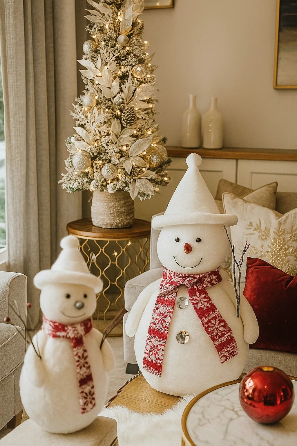 Brighten your holiday home with the Snowman Christmas Decor, available in two charming sizes. Crafted with a soft white finish, playful carrot nose, and twig arms, each snowman wears a red knit scarf patterned with festive snowflakes. Perfect for placing by the tree, on an entry table, or beside a fireplace, these joyful figures bring a cozy seasonal touch to your décor. Their cheerful expressions and classic winter style make them ideal for both modern and traditional festive settings.