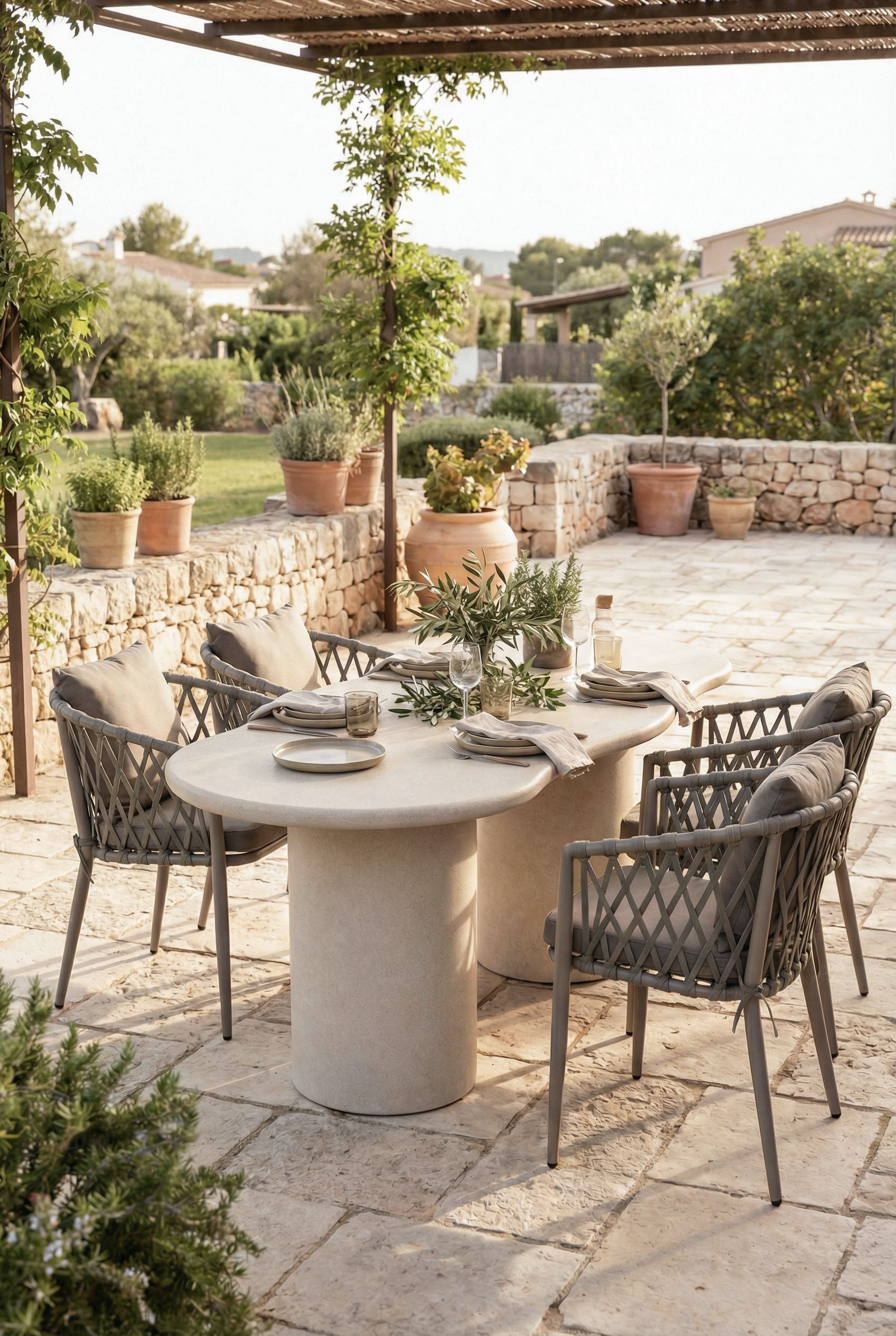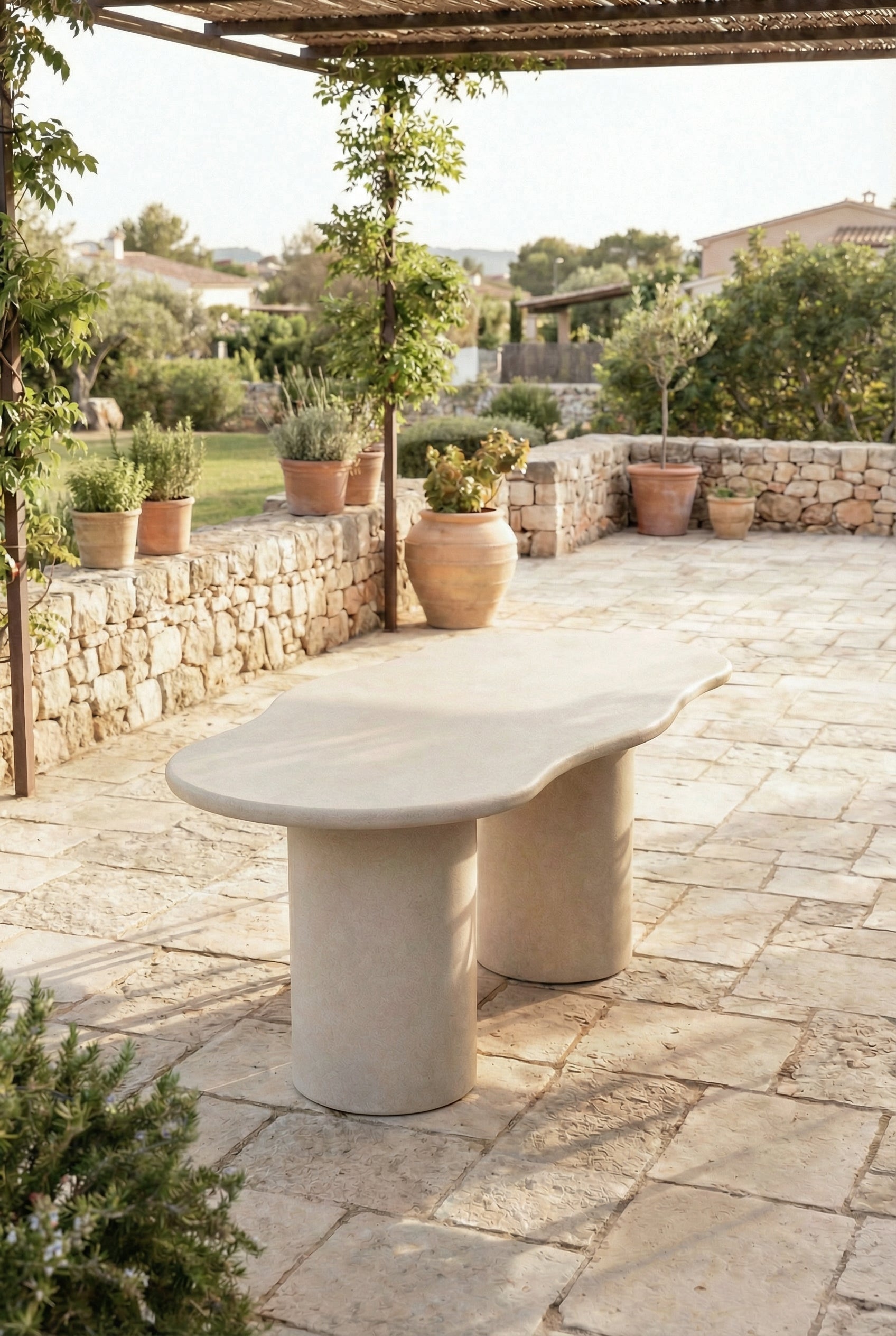 Designed to elevate your outdoor setting with refined simplicity, this dining table features a sculptural irregular surface finished in light beige microconcrete, creating a calm and contemporary aesthetic. The smooth mineral texture and organic form bring a sense of natural flow while enhancing durability for outdoor living. Styled in your terrace or garden space, it anchors gatherings with understated elegance, allowing you to enjoy open-air dining in a setting that feels modern, relaxed, and effortlessly sophisticated.