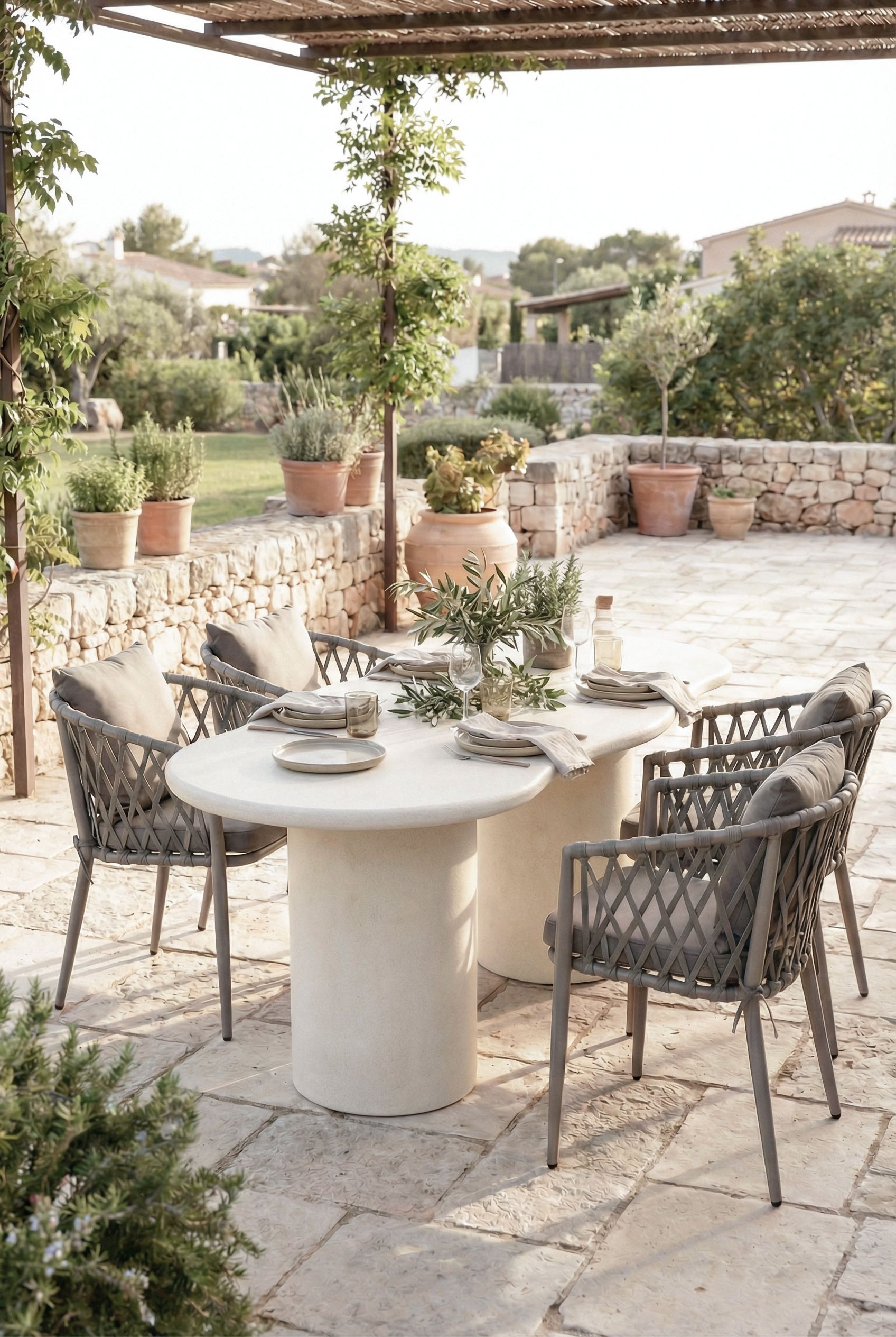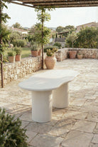 Designed to enhance your outdoor space with soft elegance, this dining table features an irregular sculptural surface finished in off white microconcrete, creating a light and refined visual presence. The smooth mineral texture and organic form bring balance and calm to your terrace or garden, while elevating everyday outdoor dining with a modern, architectural feel. Styled as the centerpiece of your open air setting, it complements natural surroundings and contemporary exteriors with effortless sophistication and timeless appeal.