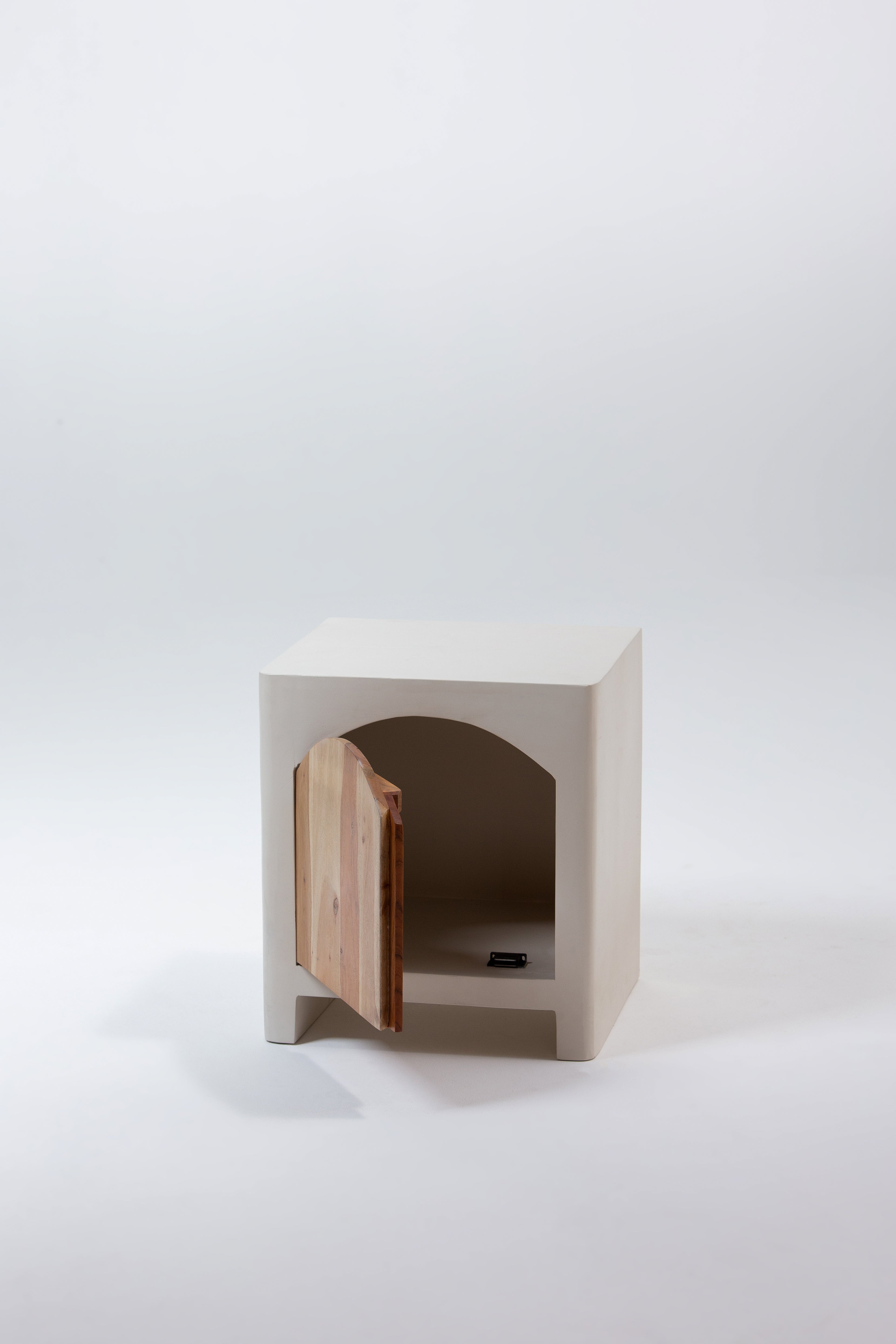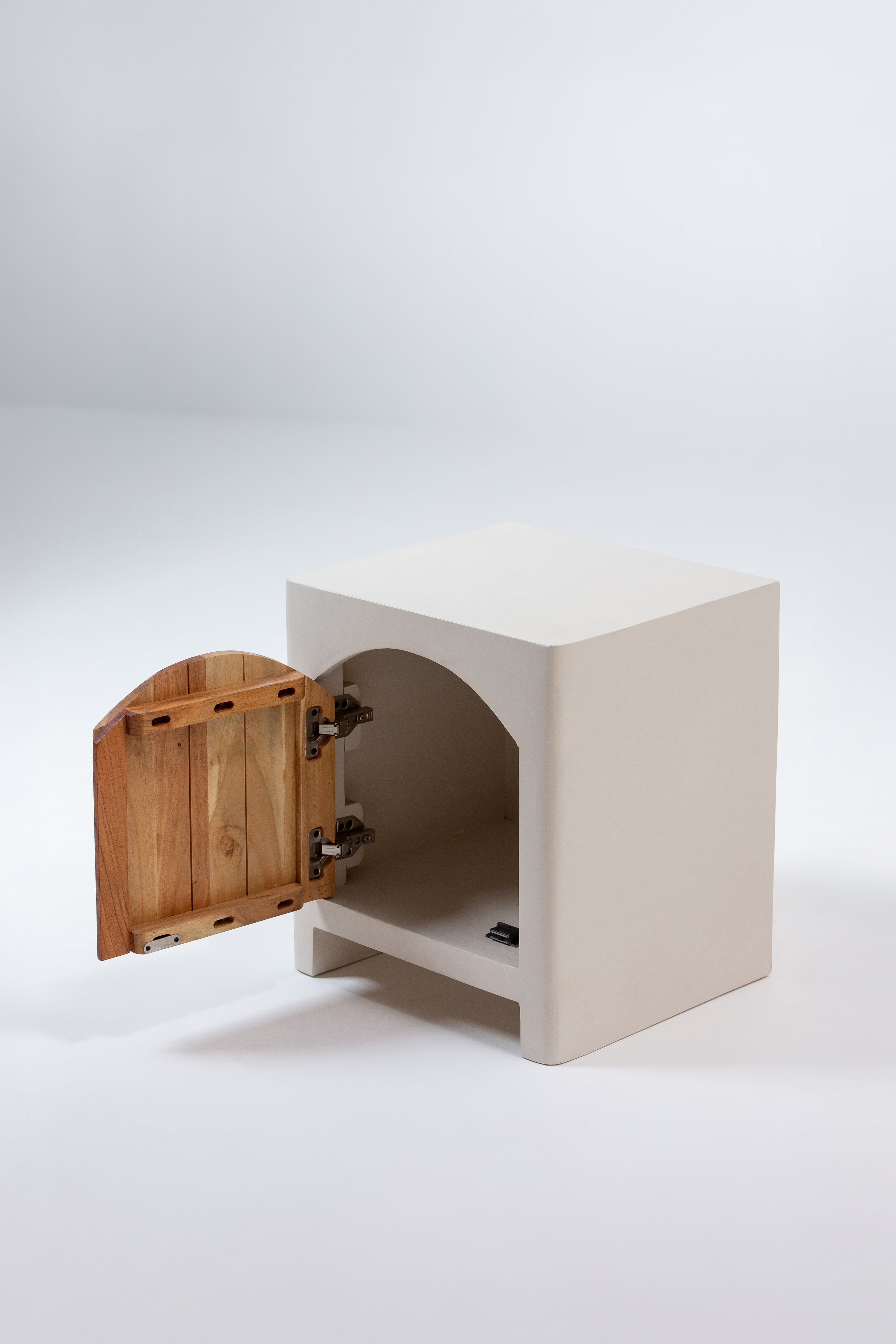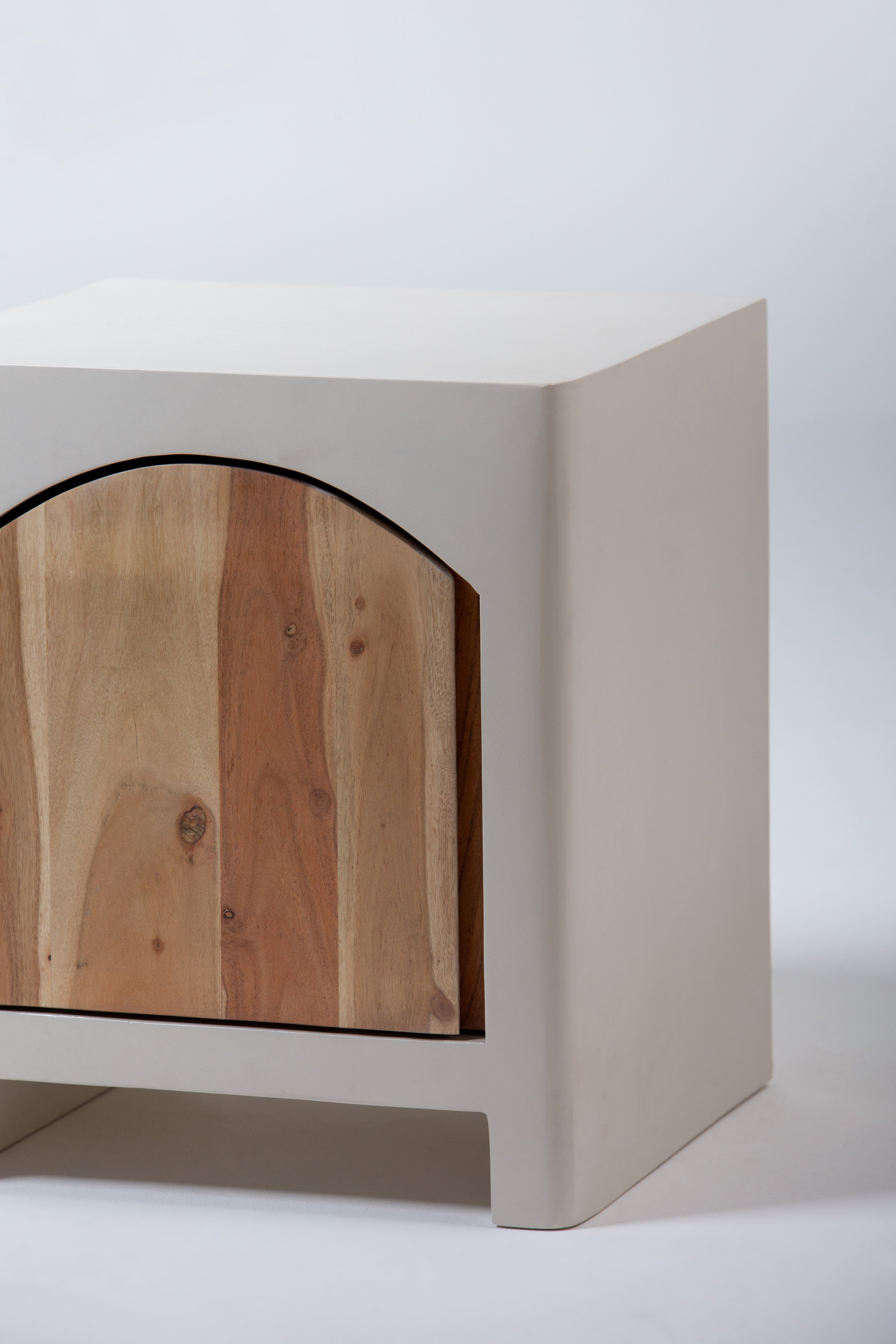 Crafted from painted acacia wood, this bedside table features a smooth, curved frame complemented by a natural wood-paneled door with an arched design. Its minimalist aesthetic blends functionality and style, offering a subtle yet eye-catching accent for your bedroom.
