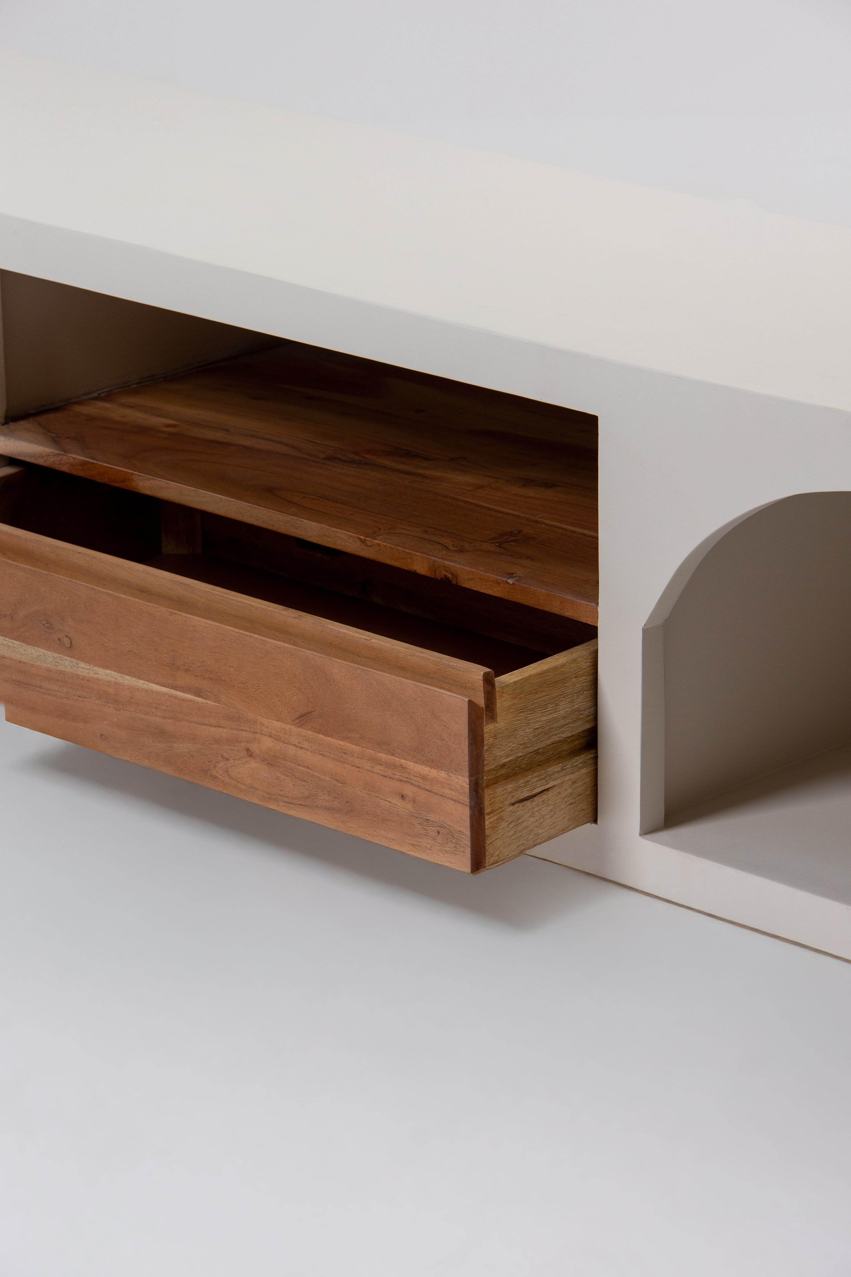 Crafted from painted Acacia wood, this tv unit offers a clean and minimalist design. It features a neutral painted finish, two curved open shelves, and a central wooden drawer that adds texture and storage. The elegant arches and streamlined silhouette bring a modern charm to your living space while providing ample room for organizing tv devices and decorative accents. Perfect for contemporary or rustic interiors, this unit enhances any room effortlessly.
