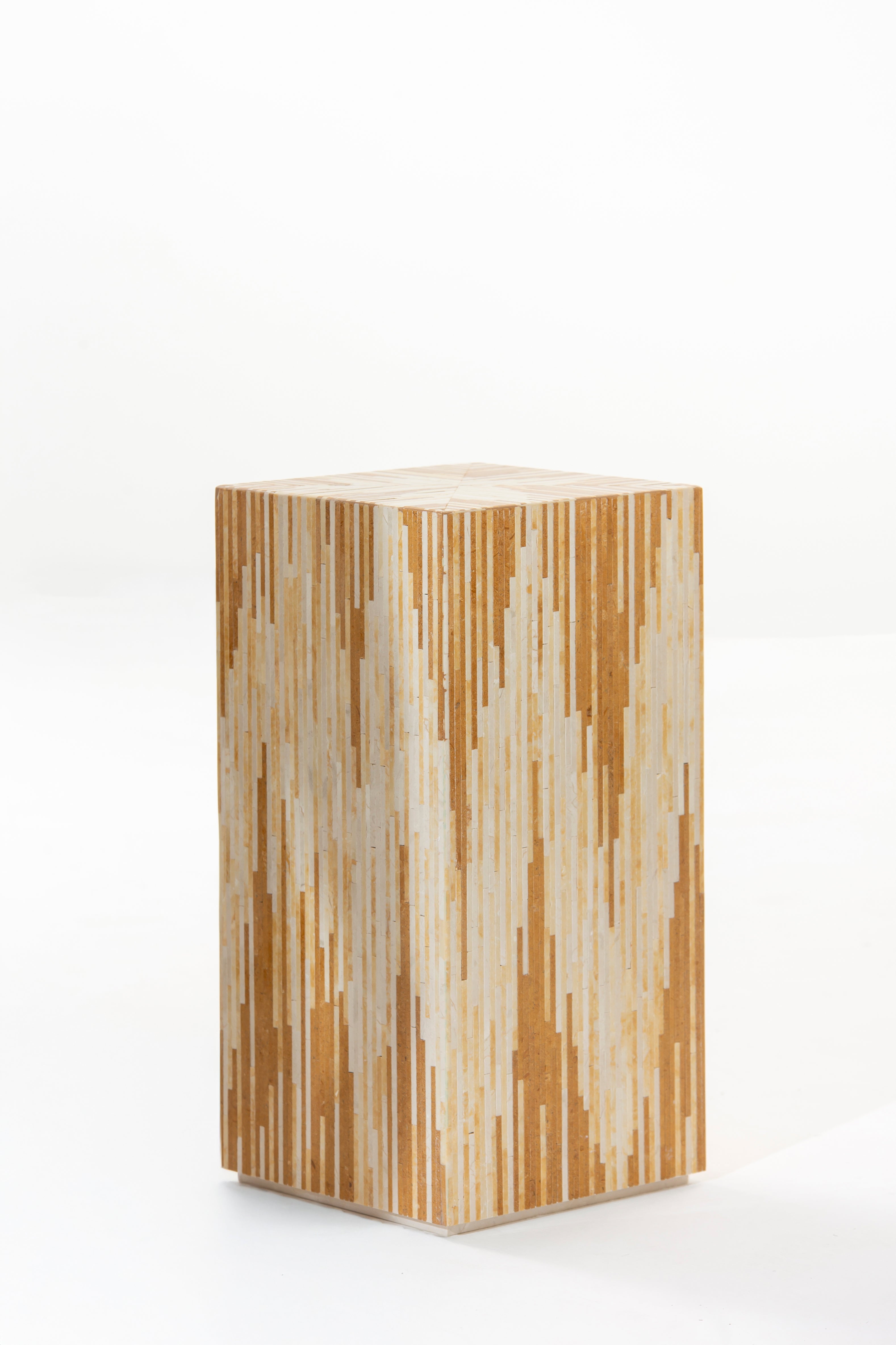 This striking rectangular pedestal, designed to be the centerpiece of your modern aesthetic, features an intricate mosaic of meticulously arranged marble tiles. The design showcases a captivating linear abstract pattern, with vertical and diagonal lines in varying shades of light beige, cream, and brown, creating a dynamic visual texture that draws the eye. Its clean lines and natural color palette offer a versatile display solution for your cherished art pieces, sculptures, or even a vibrant plant, seamlessly integrating with your contemporary interior design and adding an understated yet powerful artistic statement to your space.