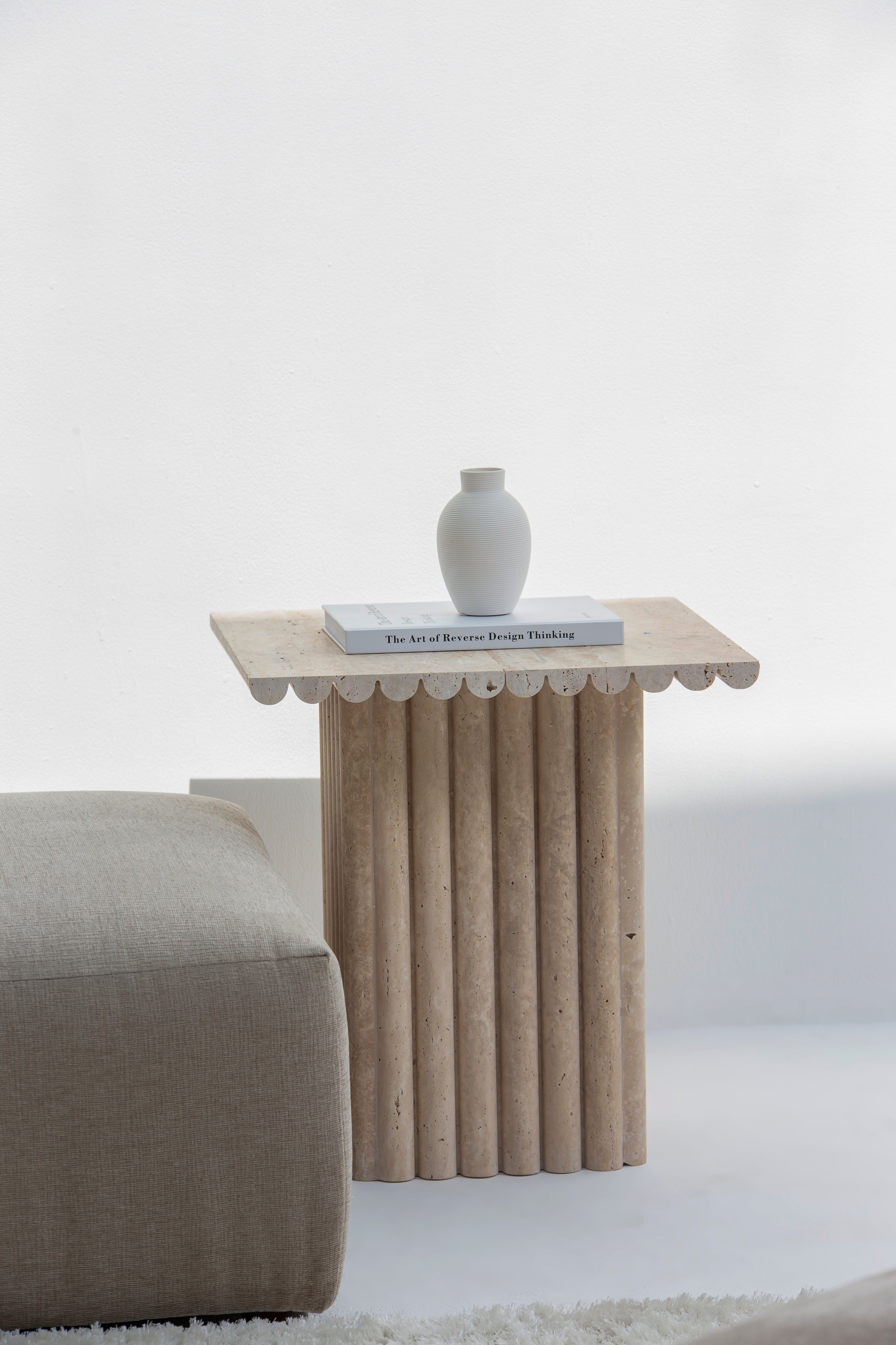 The Zyra Travertine Top with Fluted Base Side Table exemplifies the perfect marriage of timeless elegance and architectural flair. The natural travertine tabletop, featuring warm beige and creamy undertones with subtle veining, offers a sophisticated and luxurious surface. Paired with a sculptural fluted base, this side table brings a touch of classical inspiration with modern sensibility, creating a versatile piece ideal for any living space. Whether used to display décor accents, books, or as a functional side table, it serves as a statement of refined taste.